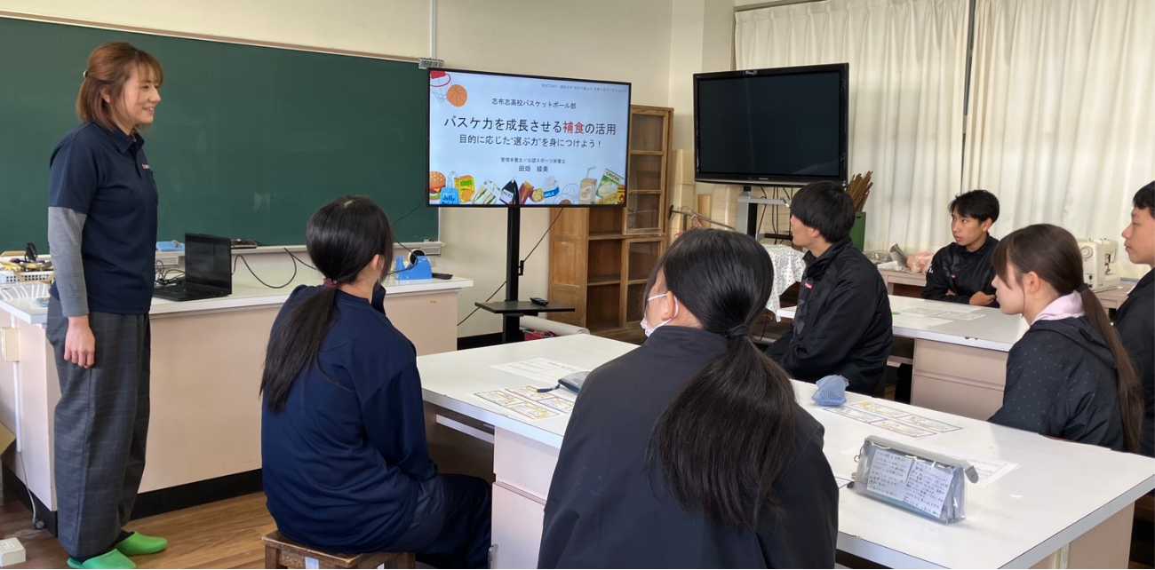 STEP1 学ぶ:補食を「目的で考える」ための導入講話。競技や生活場面と結びつけながら、選ぶ視点に触れていく。
