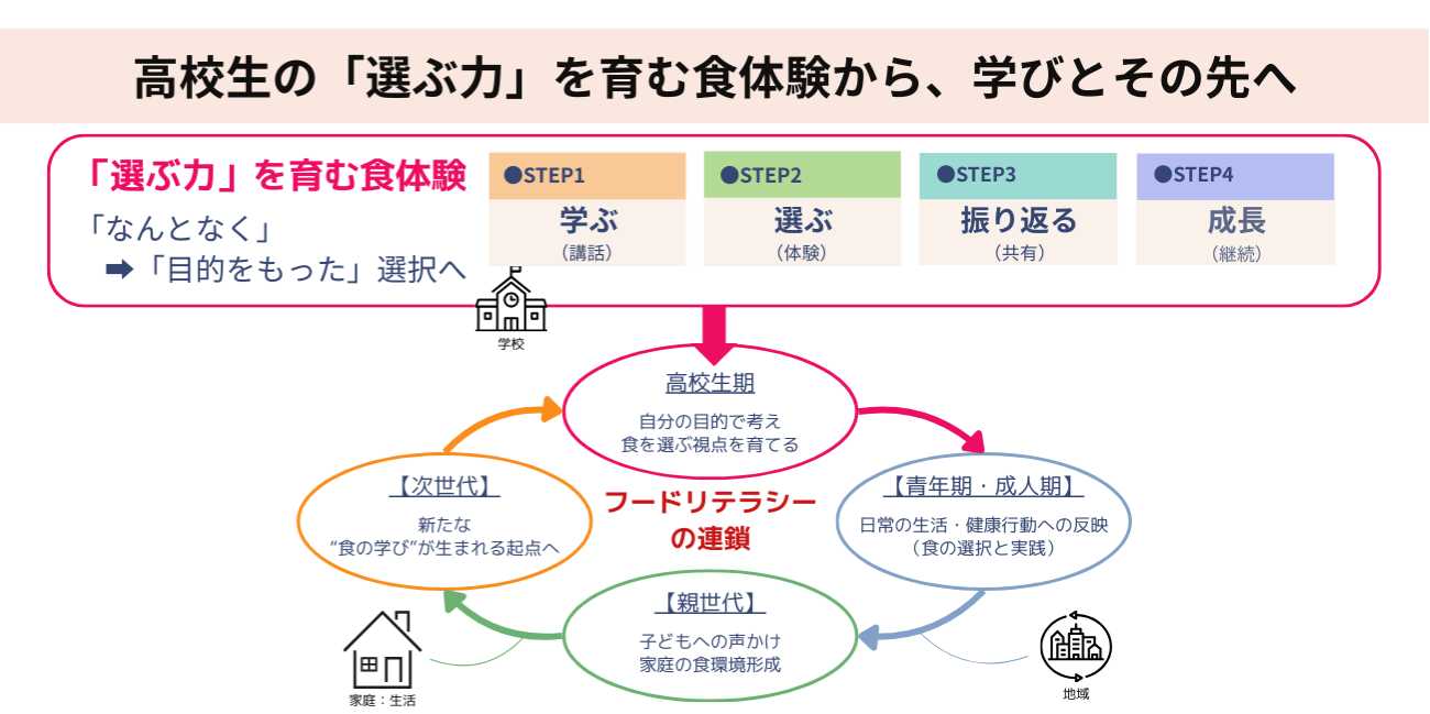 学びと体験を通して育まれる「食を選ぶ力(フードリテラシー)」は、未来の自分の生き方や、親となり次世代へとつながっていく。