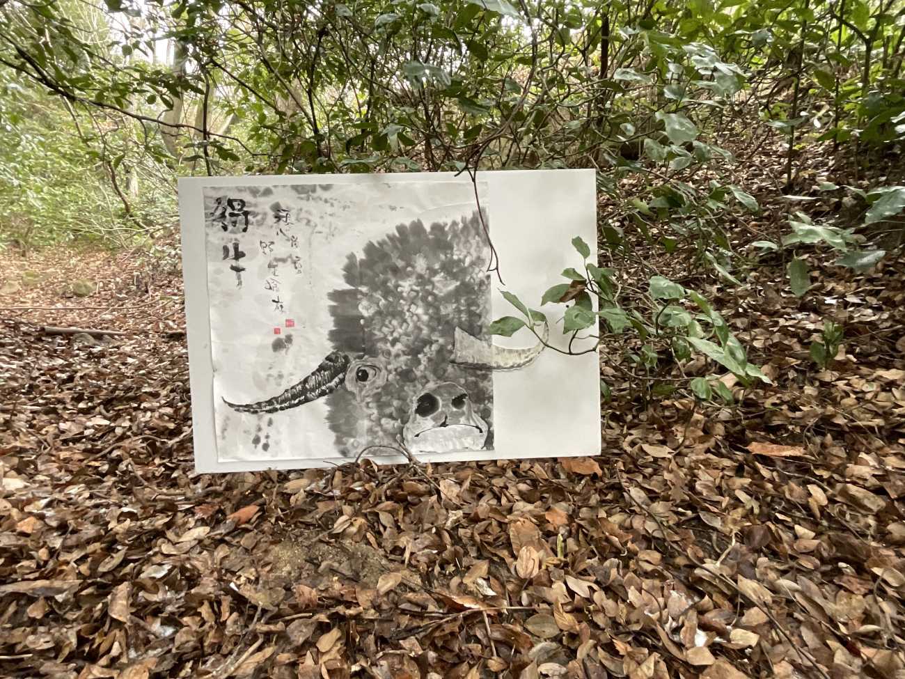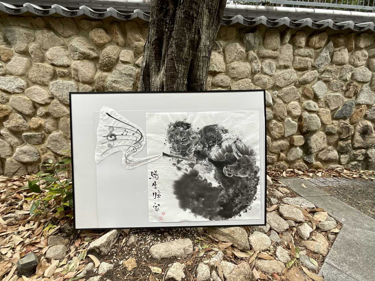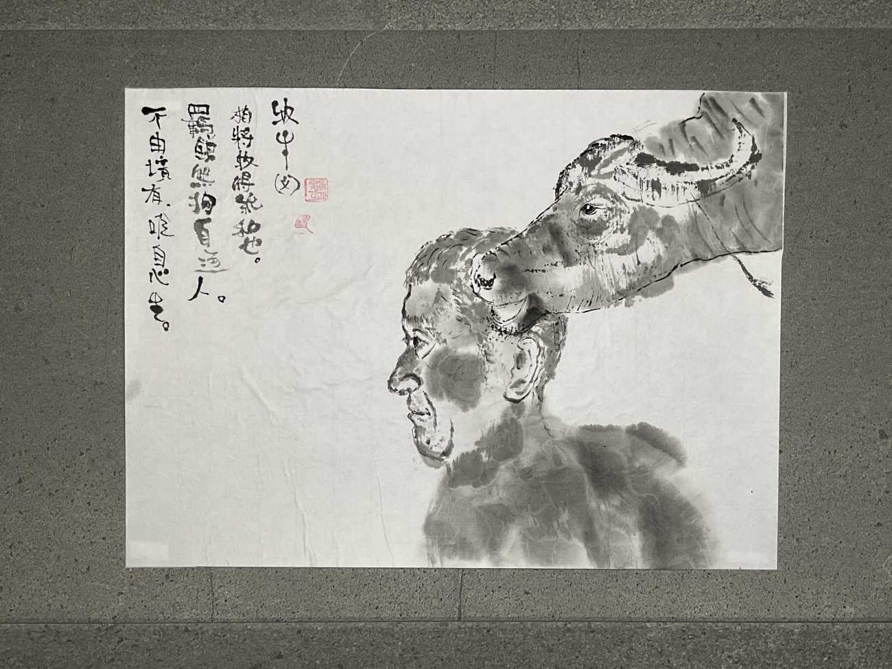 禅画の古典的テーマである十牛図から、捕らえた野生の牛を飼い慣らす事に成功した「牧牛」の場面を取り上げた。
