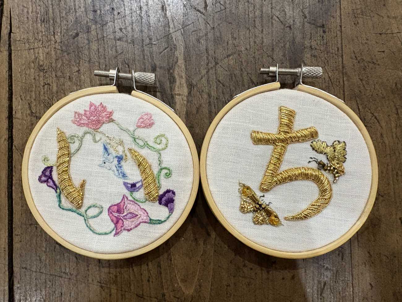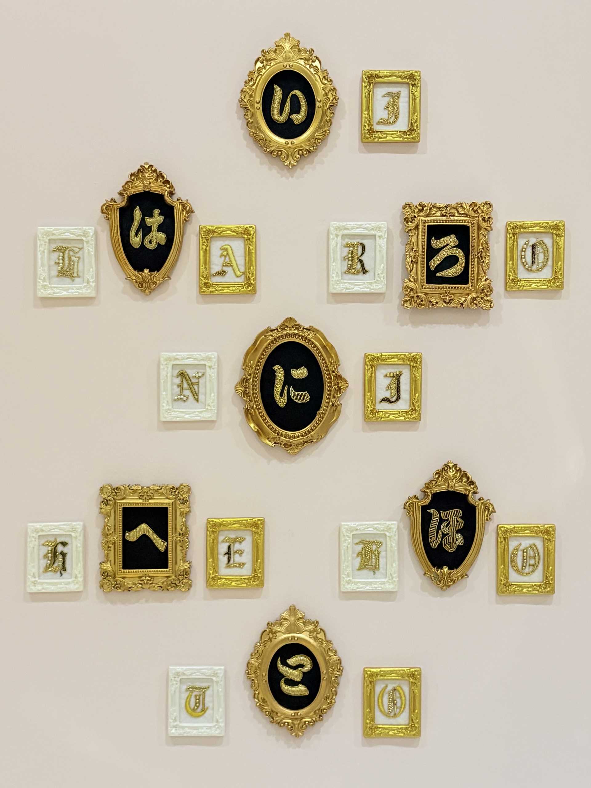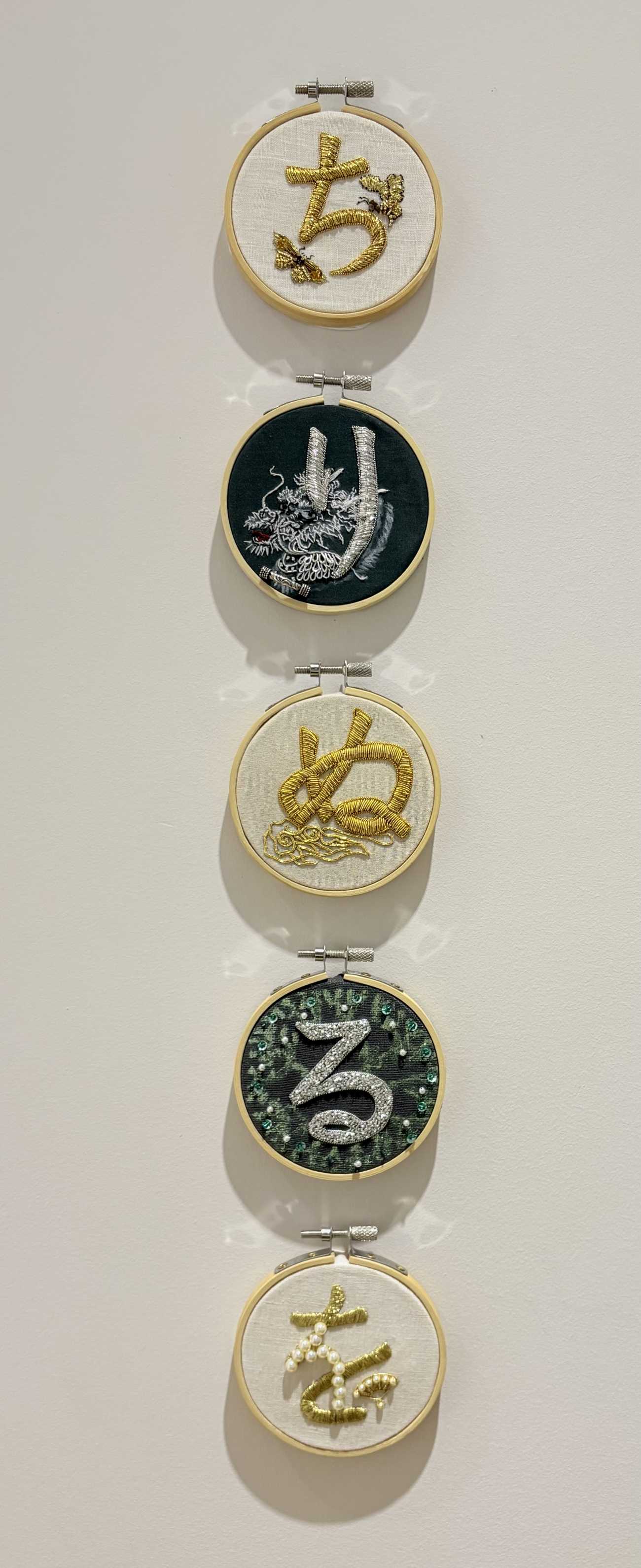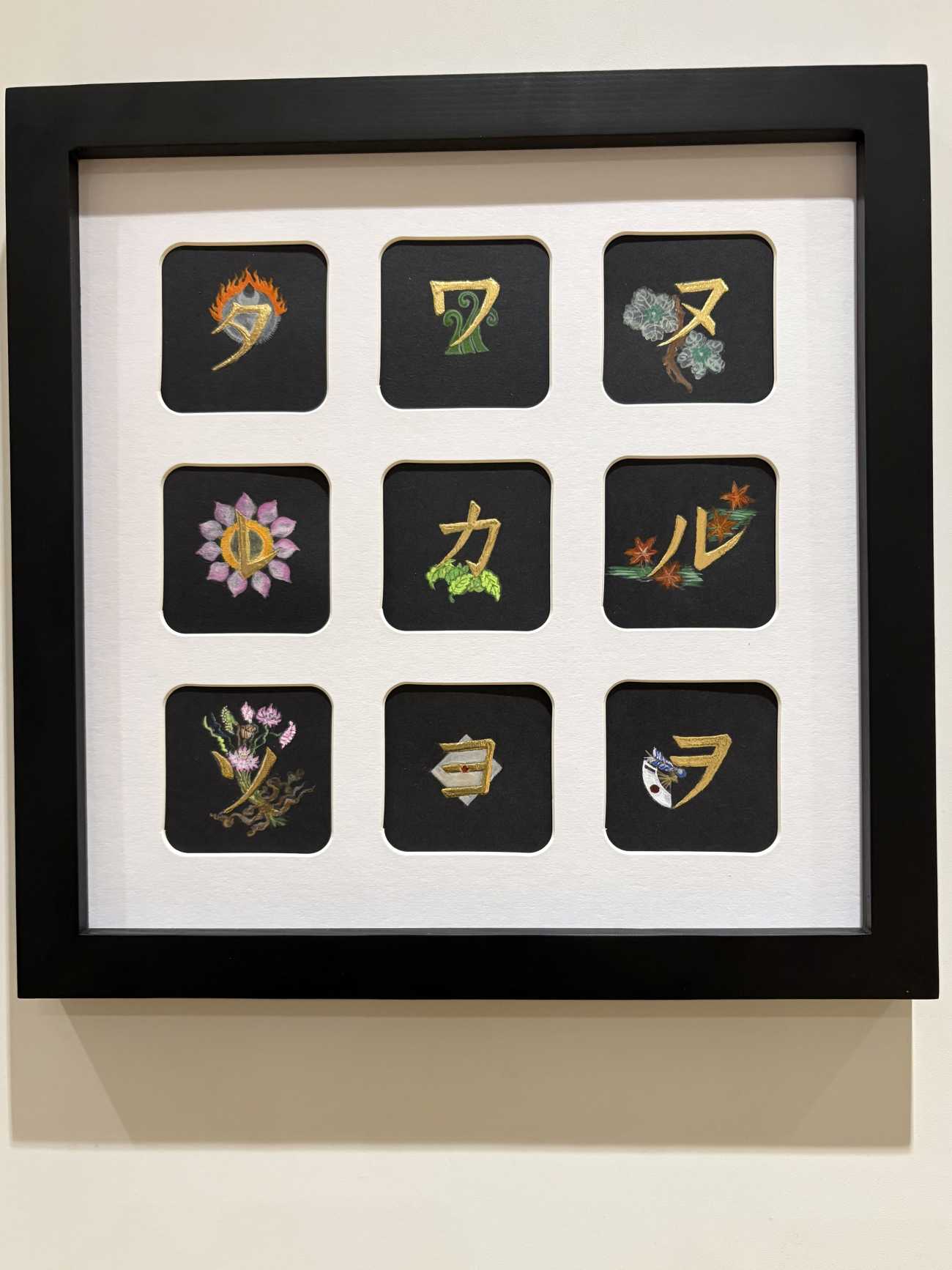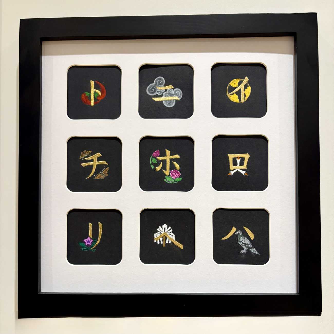 使用したゴールドワークは、金属糸を布に刺繍する歴史ある技法であり、光の反射や立体感を生かして文字の存在感を高めることができる。糸の刺し方、方向や角度によって微妙な陰影や質感をつくり出せるため、一文字ごとに異なる個性を表現することが可能である。文字を一文字ずつ額縁に収めることで、単なる文字作品ではなく、「文字の肖像画」として鑑賞できる構成としている。