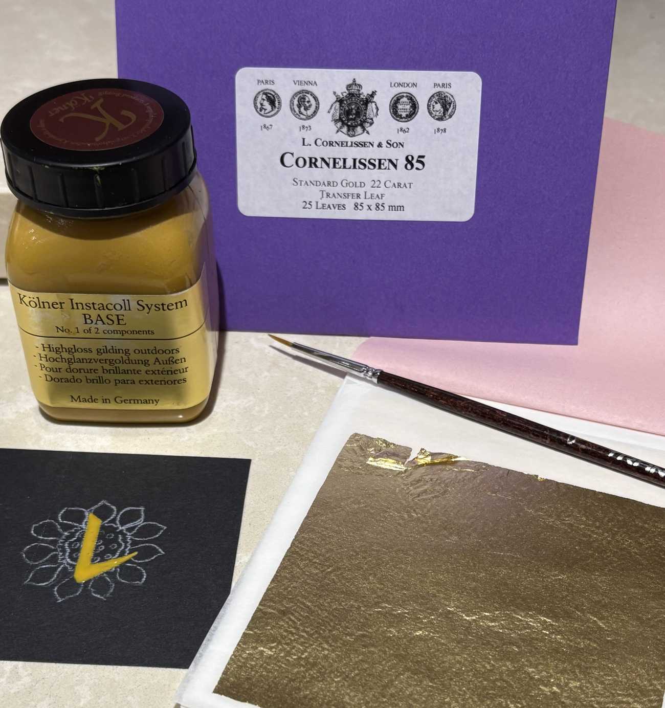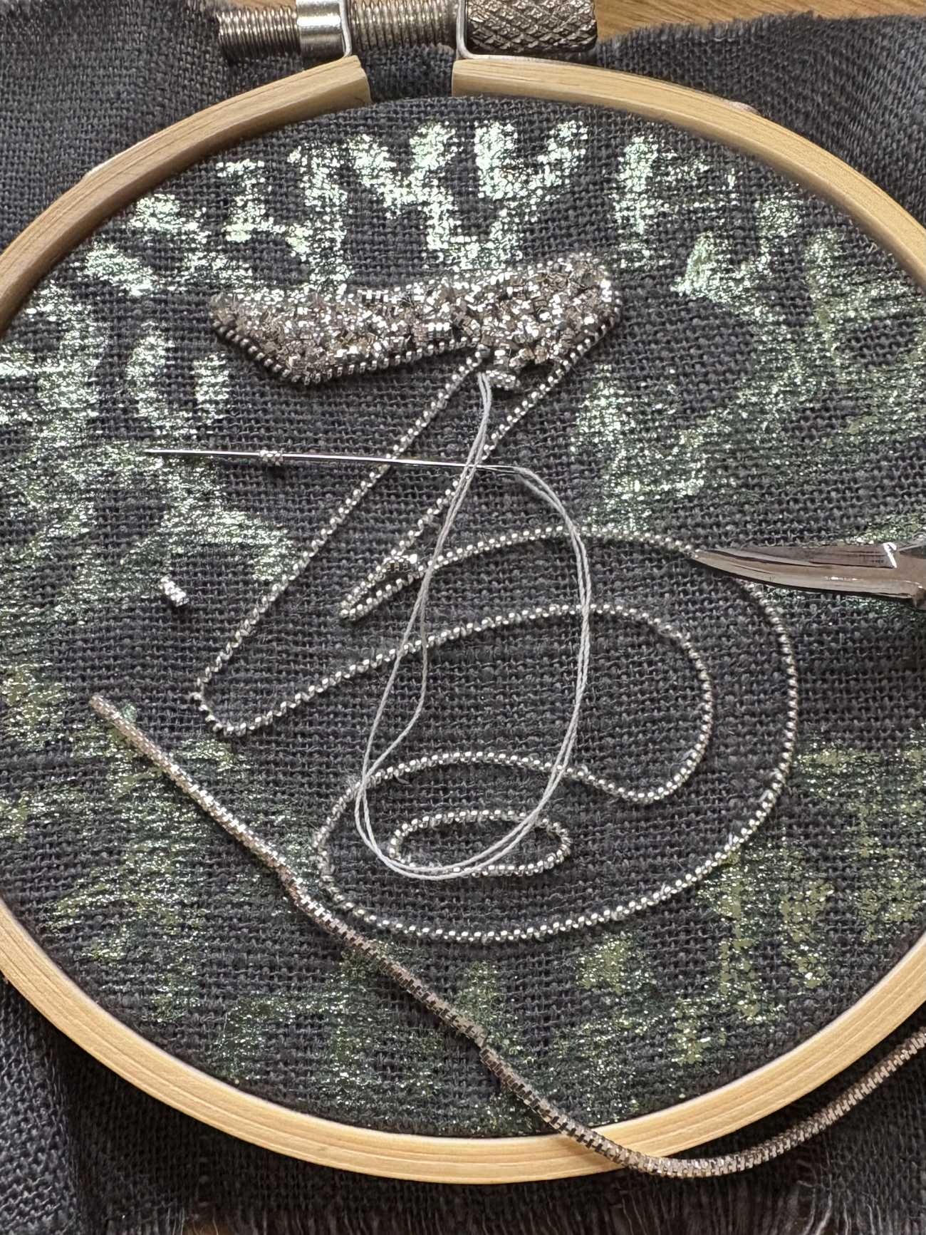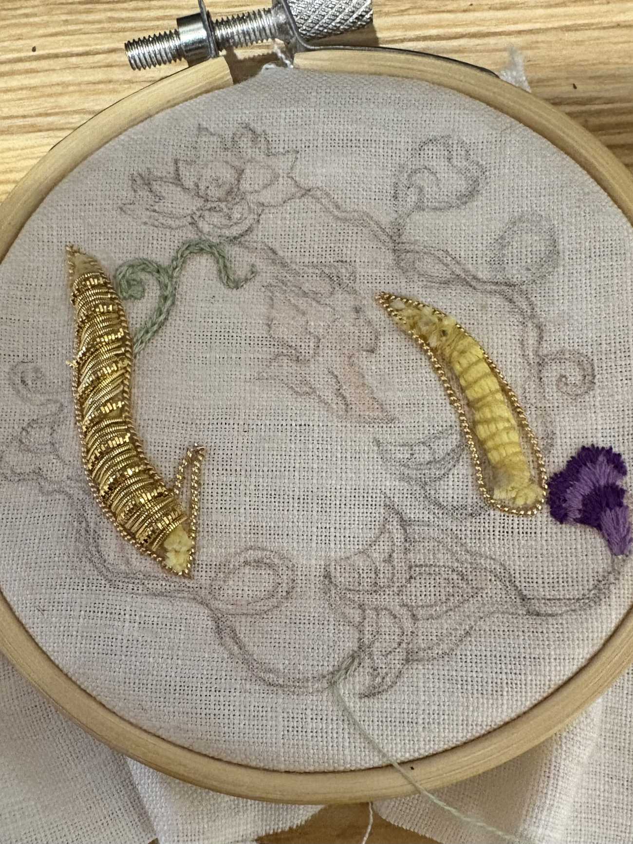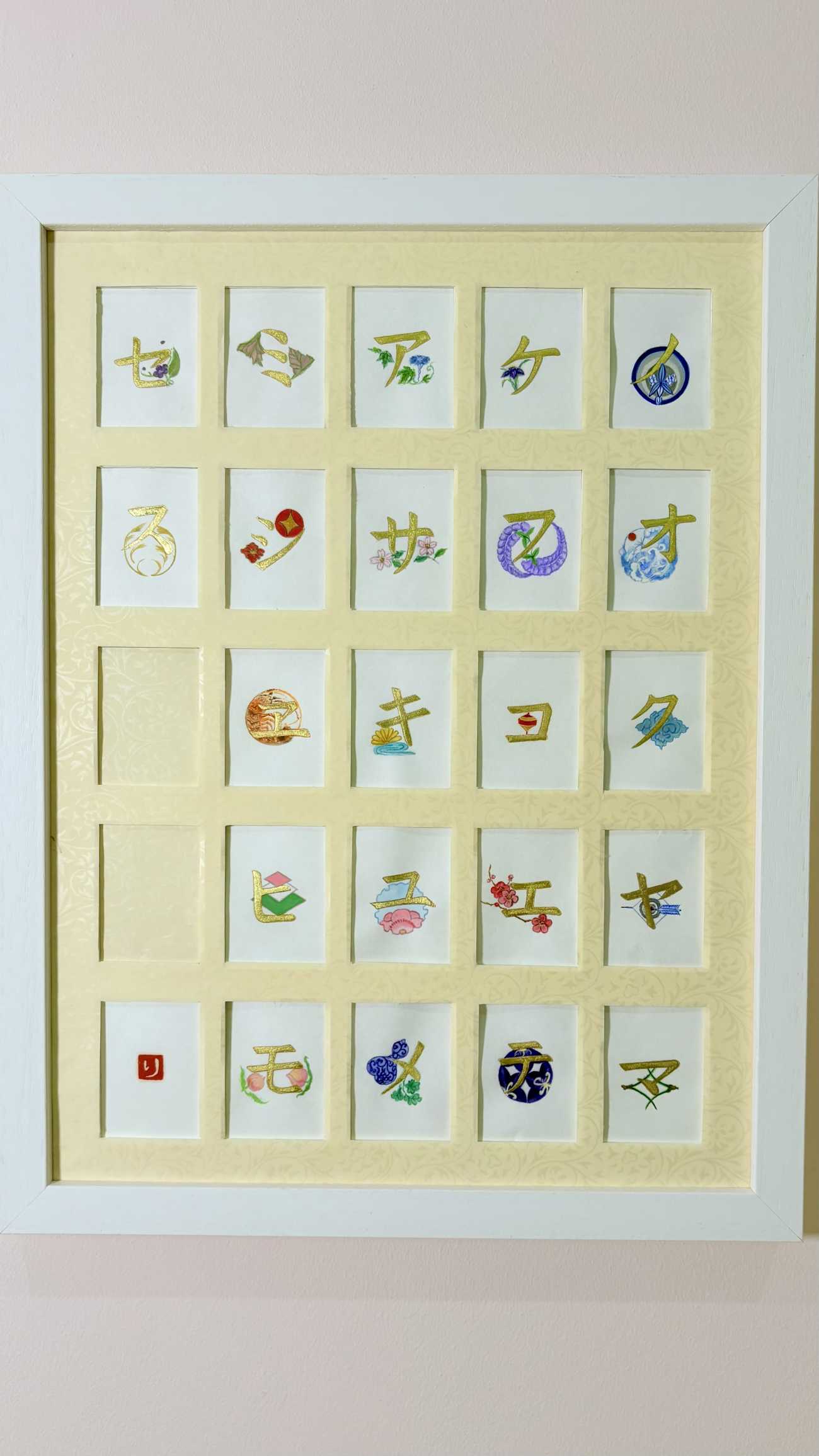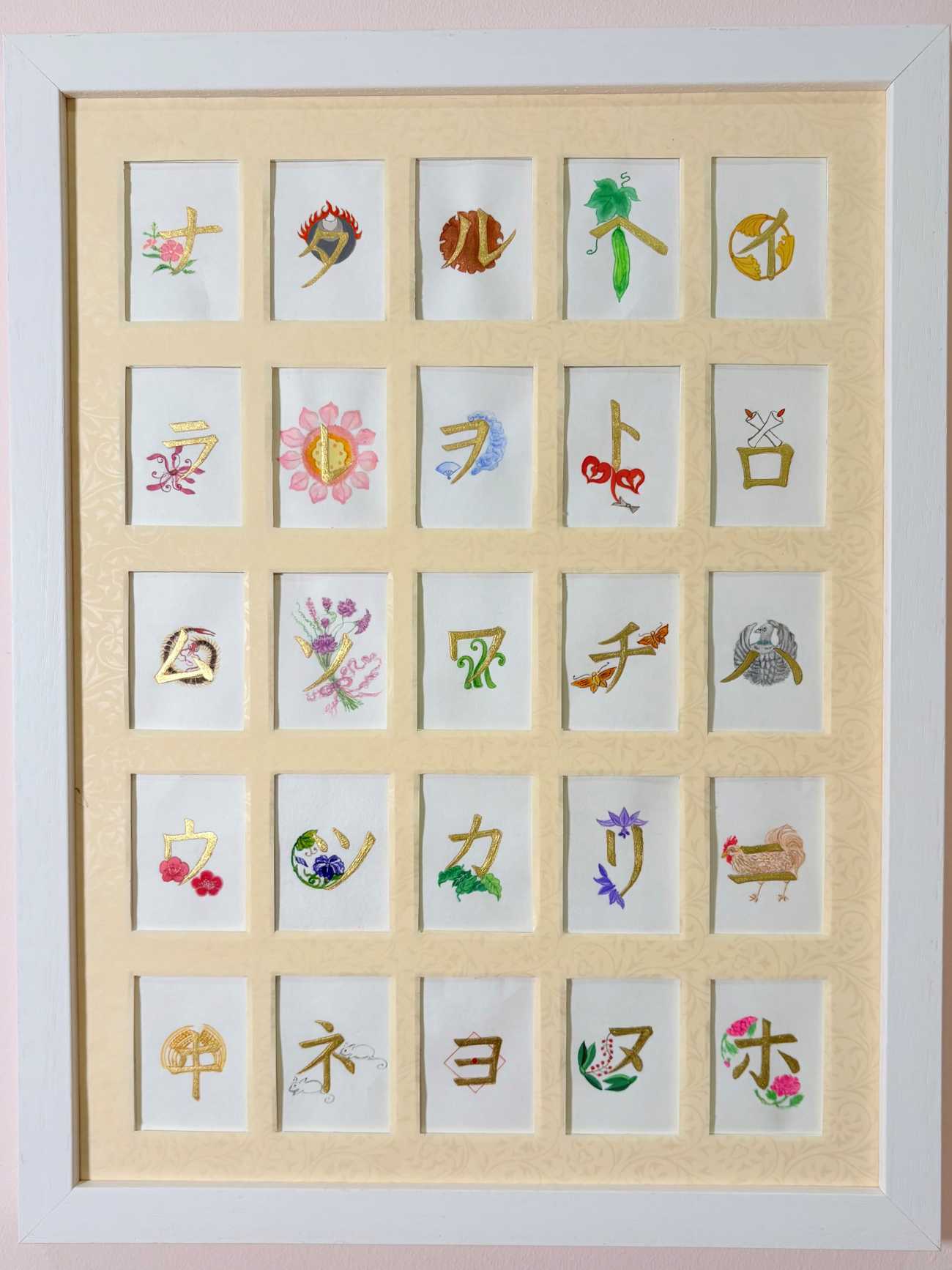 使用したゴールドワークは、金属糸を布に刺繍する歴史ある技法であり、光の反射や立体感を生かして文字の存在感を高めることができる。糸の刺し方、方向や角度によって微妙な陰影や質感をつくり出せるため、一文字ごとに異なる個性を表現することが可能である。文字を一文字ずつ額縁に収めることで、単なる文字作品ではなく、「文字の肖像画」として鑑賞できる構成としている。