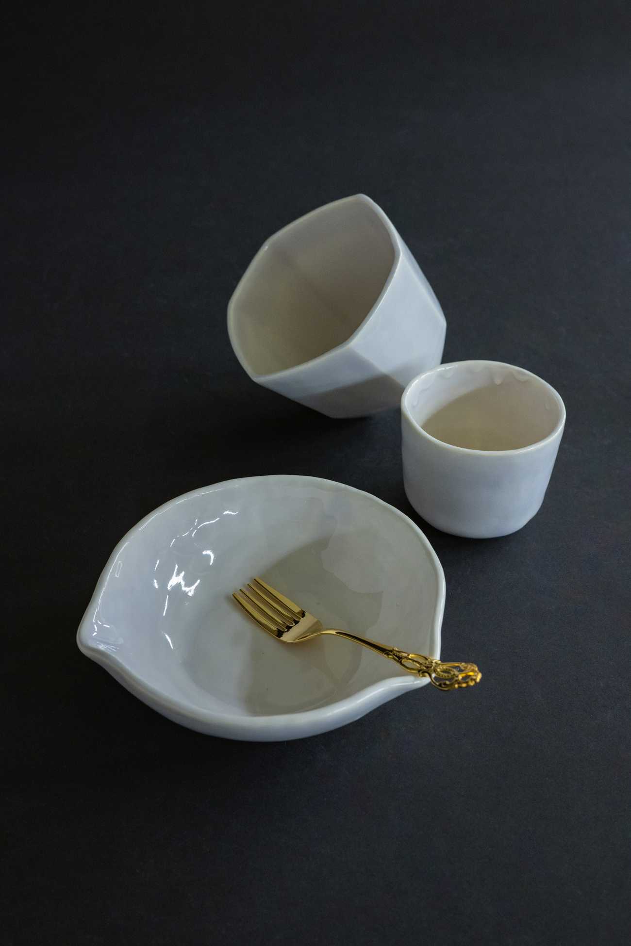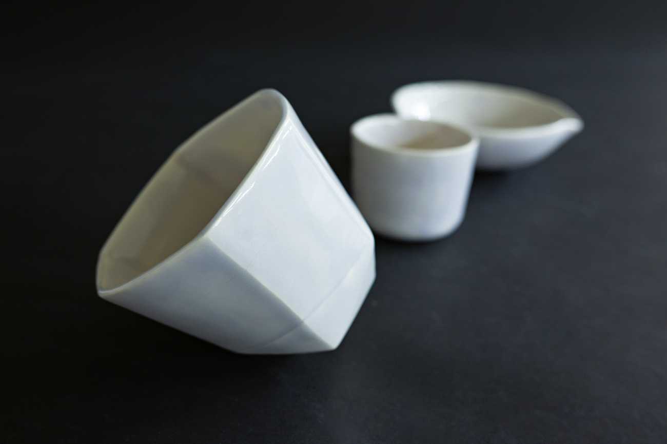 触って動くと壊れるという陶磁器に対する先入観を利用して、ぐらぐらする器と尖底の器、ユニバーサルデザインの器を制作しました。