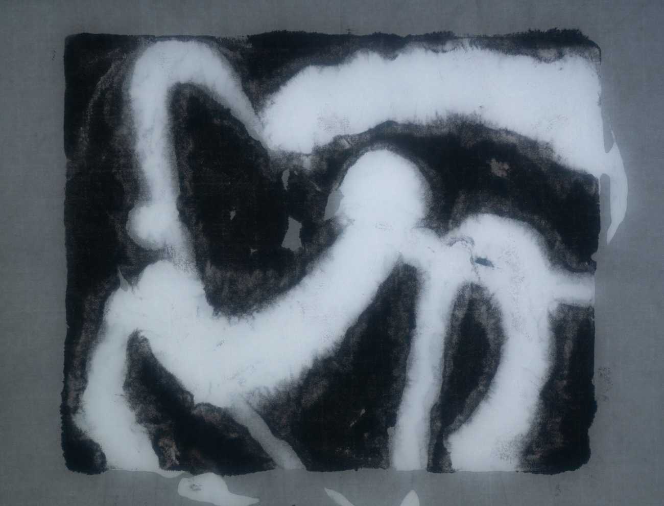 硝子を版とし、墨と銀で描いた文字の軌跡を