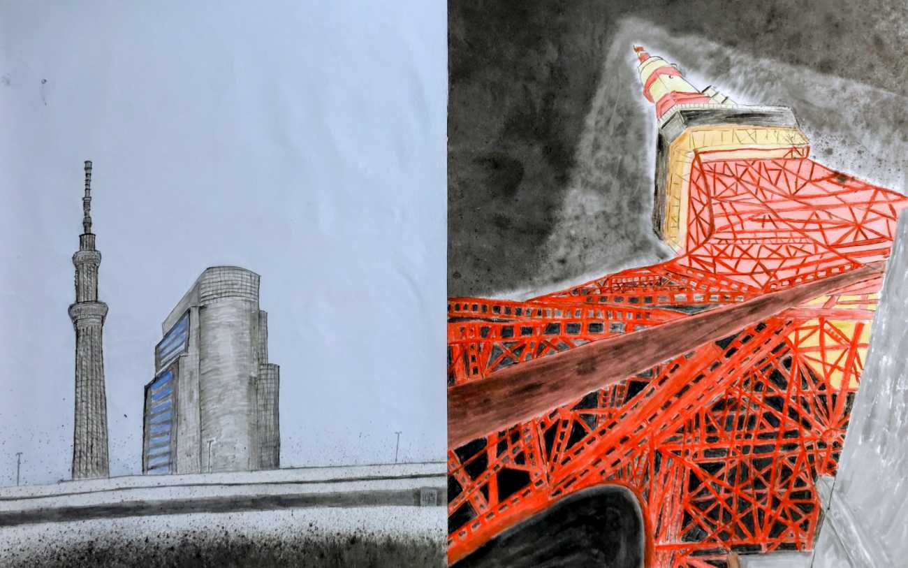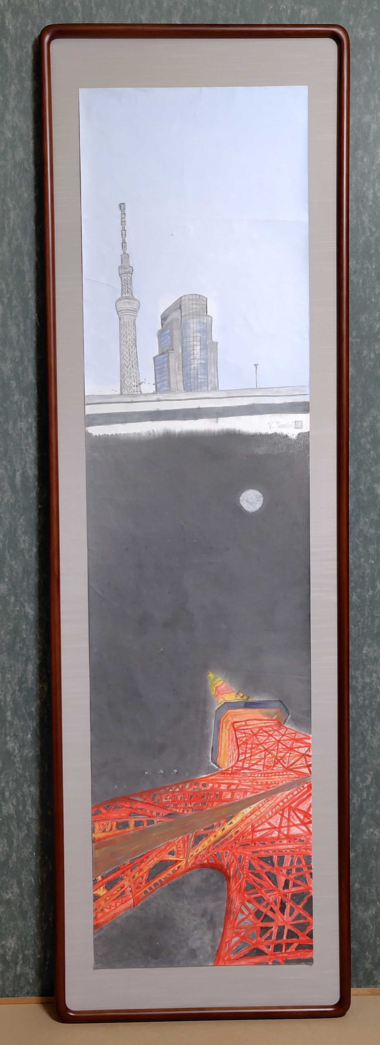 当初、夜の暗闇にカッコよく立つ「東京タワー」のみの予定であったが、昼に凛と立つ「スカイツリー」も一緒に描く。夜と昼の狭間には高速道路を入れ、あえて足は書かずあいまいにする。細かいドットや滲み等は、環境汚染のPM2.5や黄砂と受け止めていただければと思う。あえて現代作品であるが、ギャップが面白いと思い掛け軸とする。