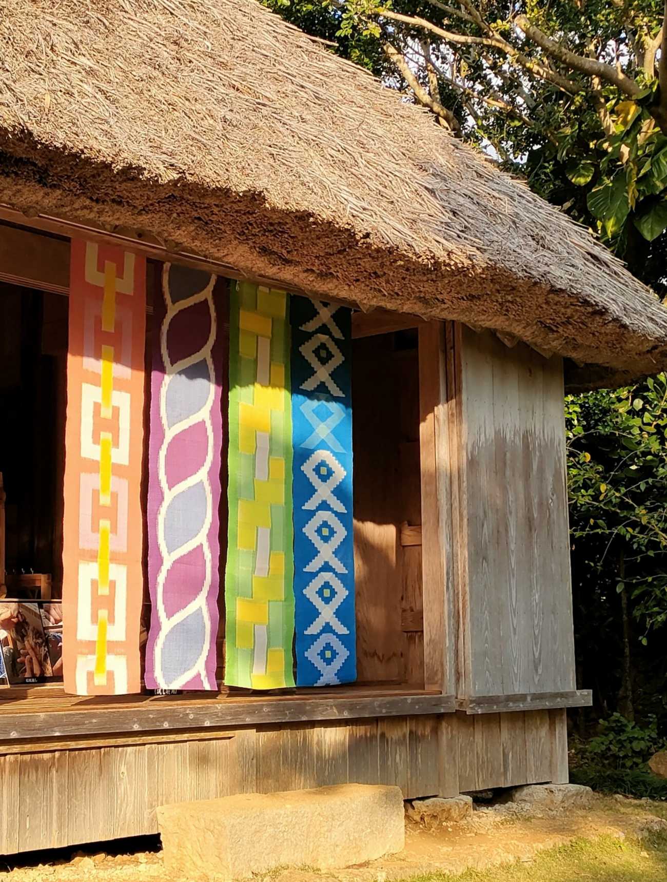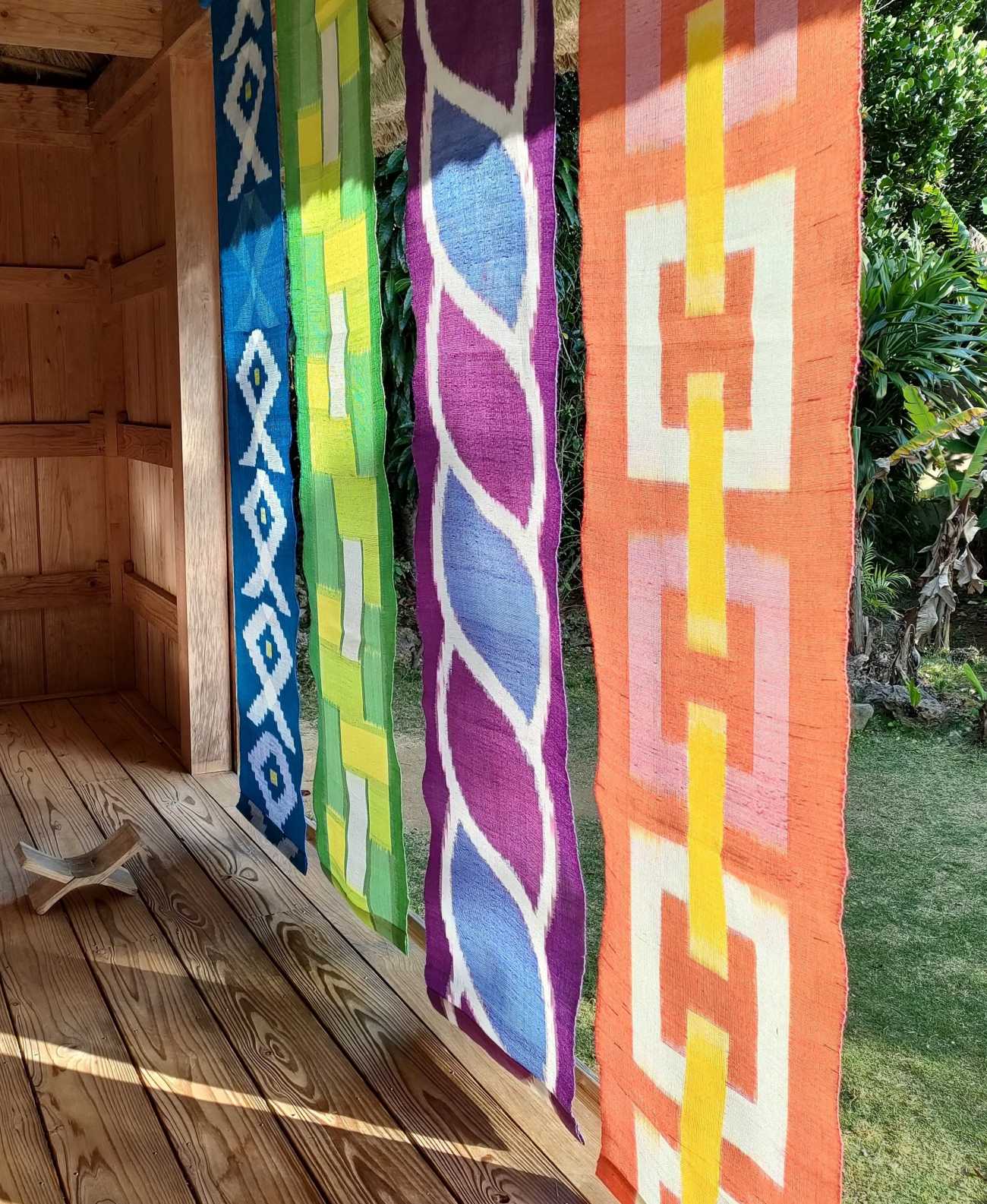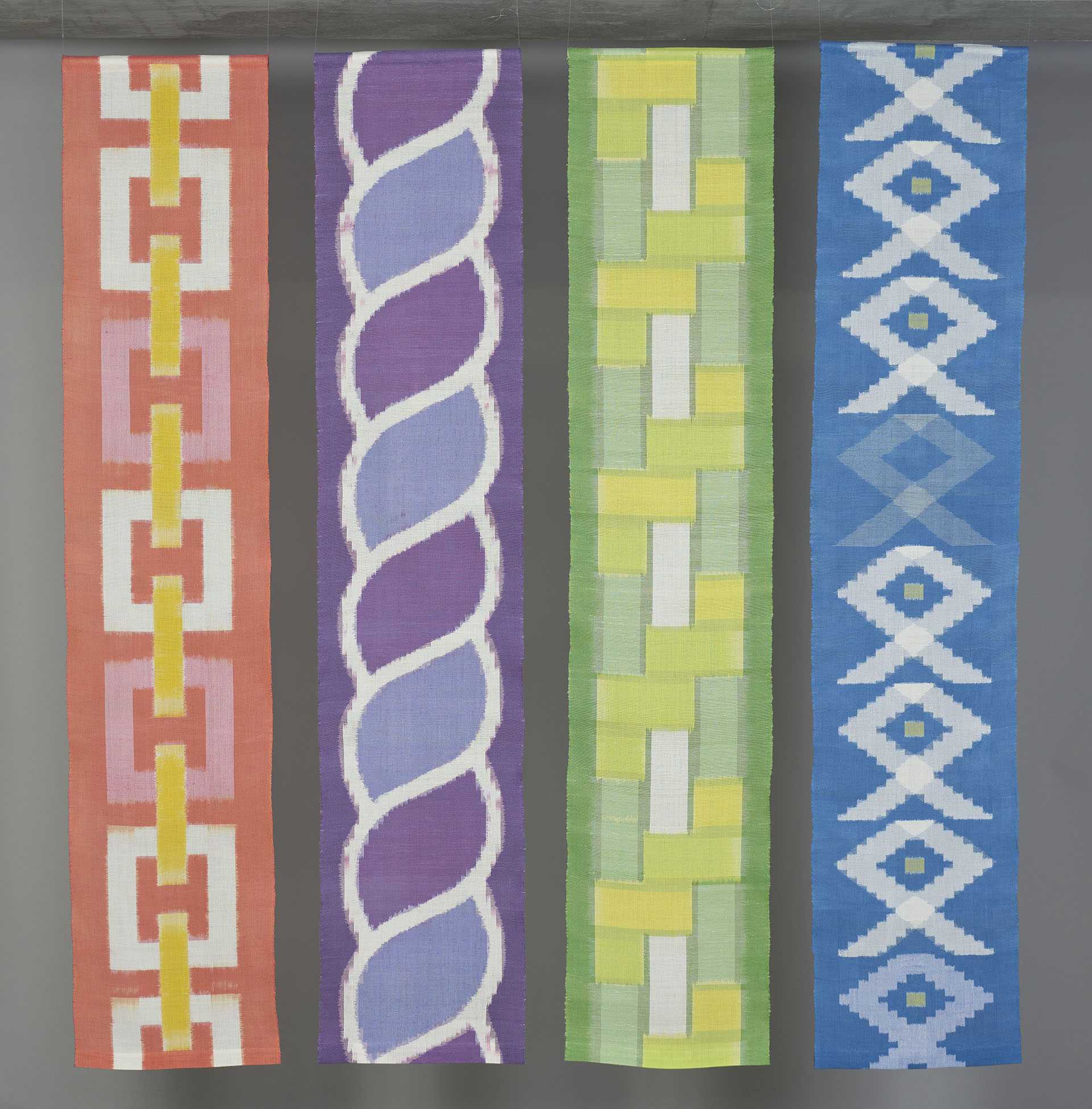 これまで行ってきた染織の作業工程を通して、現在の自分が作品作りできているのは、人類が生み出し伝承してきた技術があるからということに気づかされました。先人達への感謝の気持ちを込めて、人類が生みだてきたモノを4枚の帳それぞれのモチーフに選び、絣の技法で表現しました。