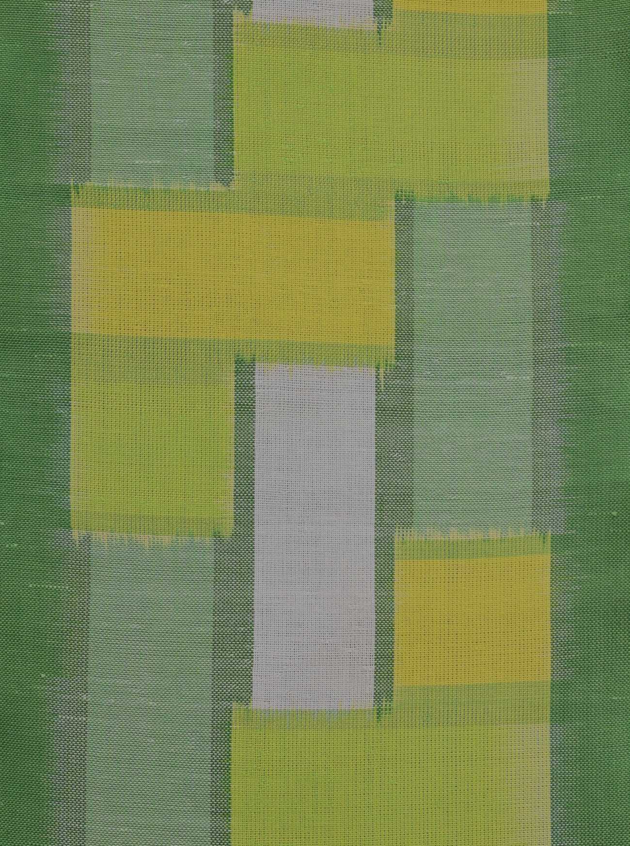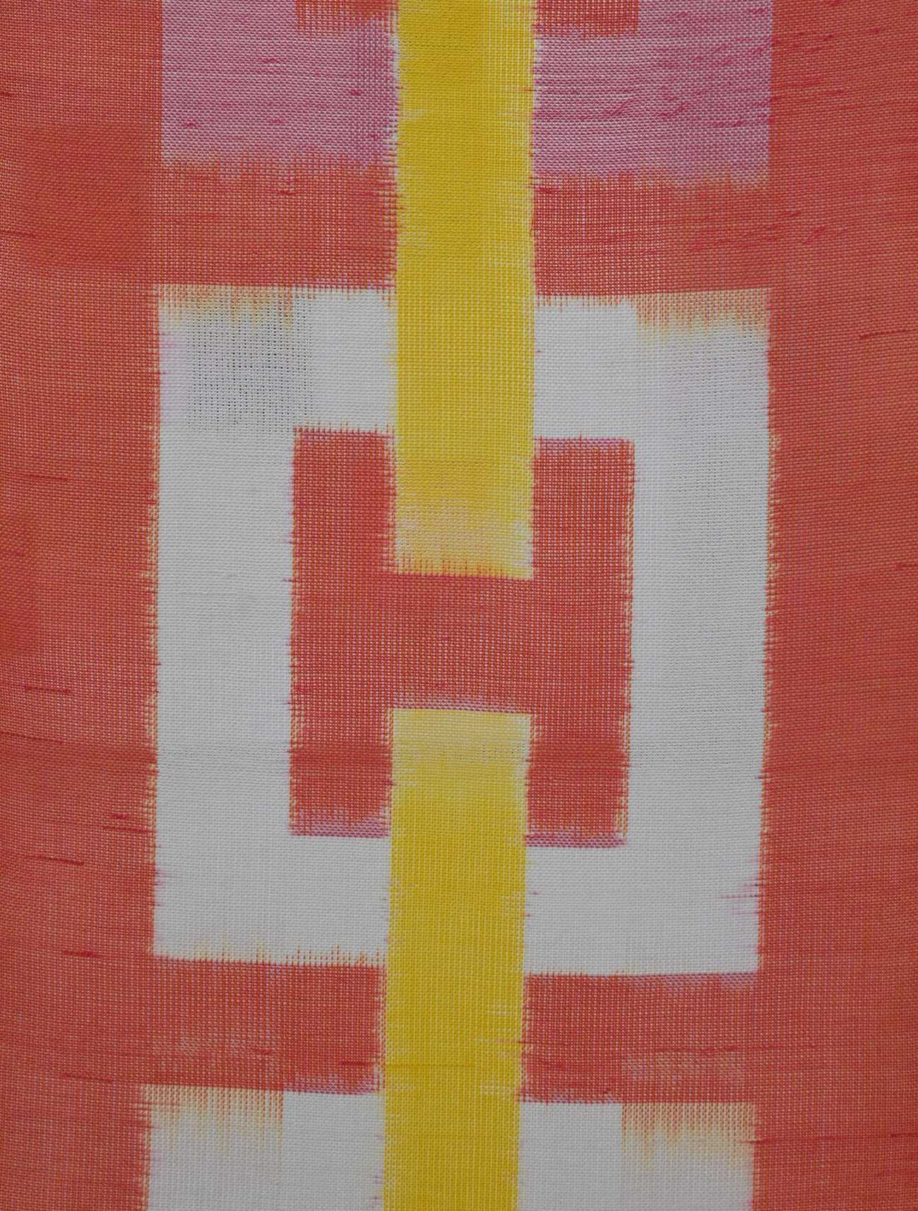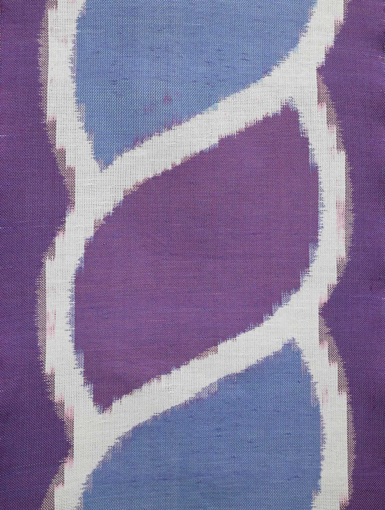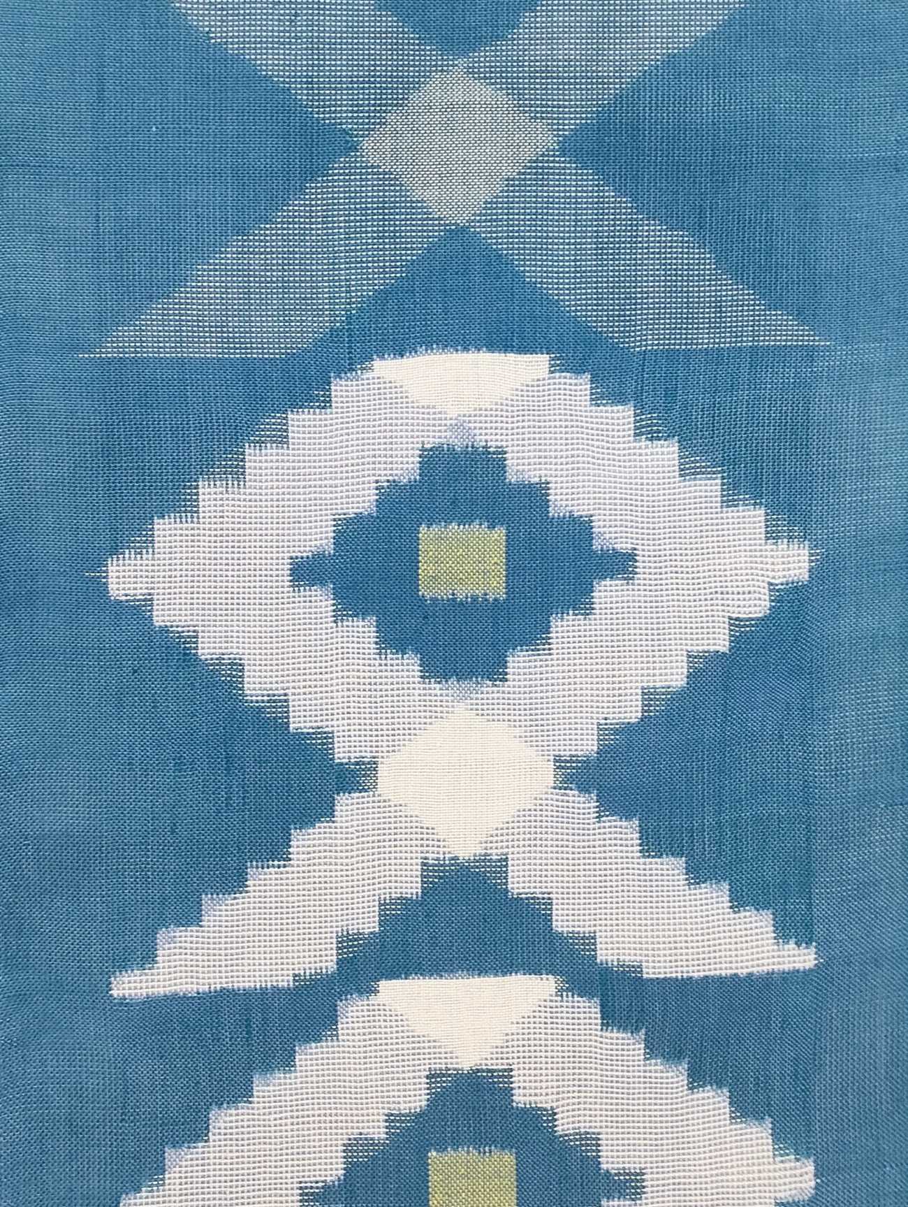 これまで行ってきた染織の作業工程を通して、現在の自分が作品作りできているのは、人類が生み出し伝承してきた技術があるからということに気づかされました。先人達への感謝の気持ちを込めて、人類が生みだてきたモノを4枚の帳それぞれのモチーフに選び、絣の技法で表現しました。