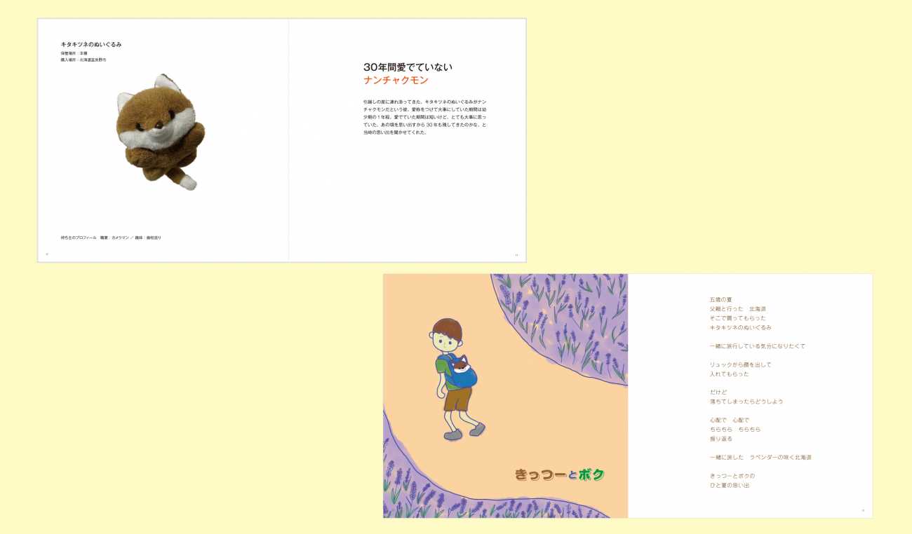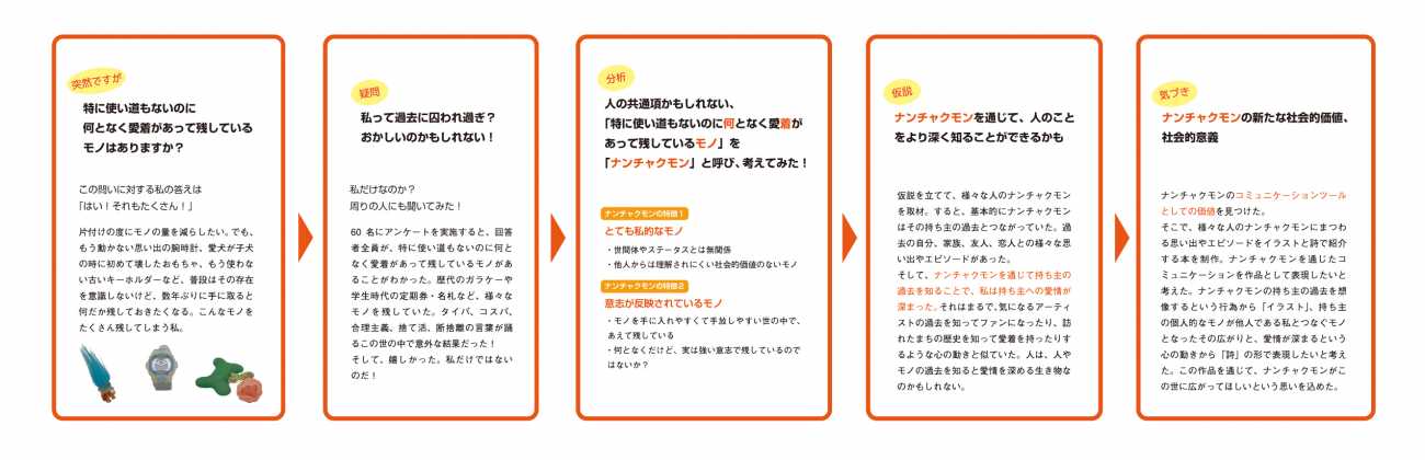 そこで、様々な人のナンチャクモンにまつわる思い出やエピソードをイラストと詩で紹介する本を制作し、ナンチャクモンを通じたコミュニケーションを伝える作品とした。