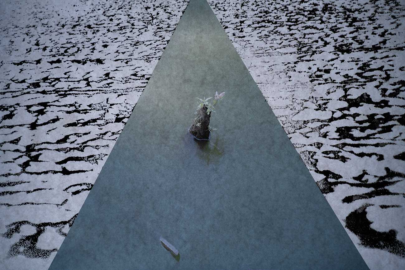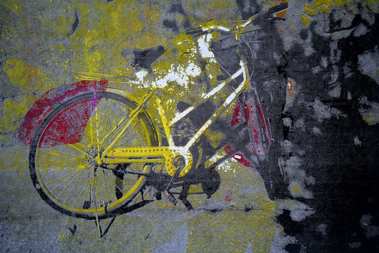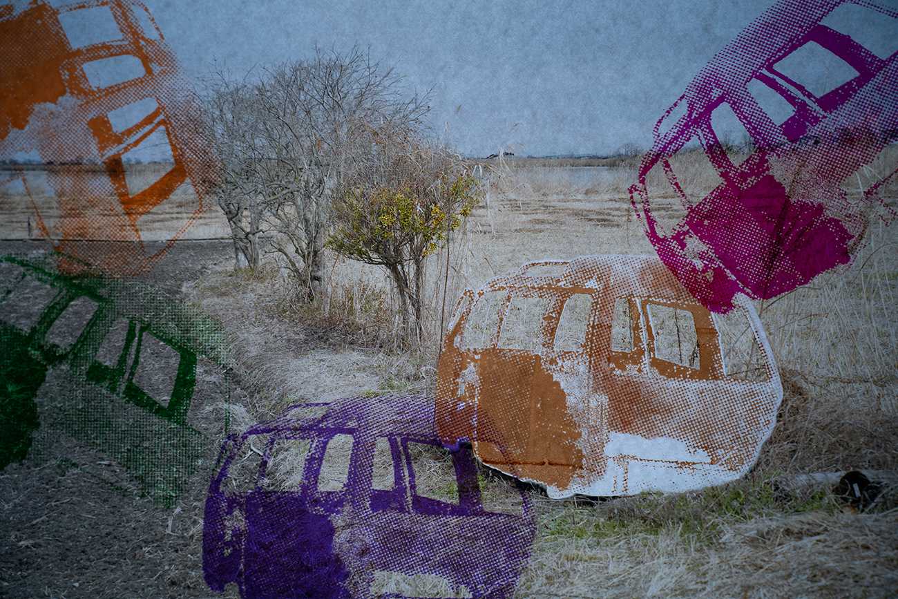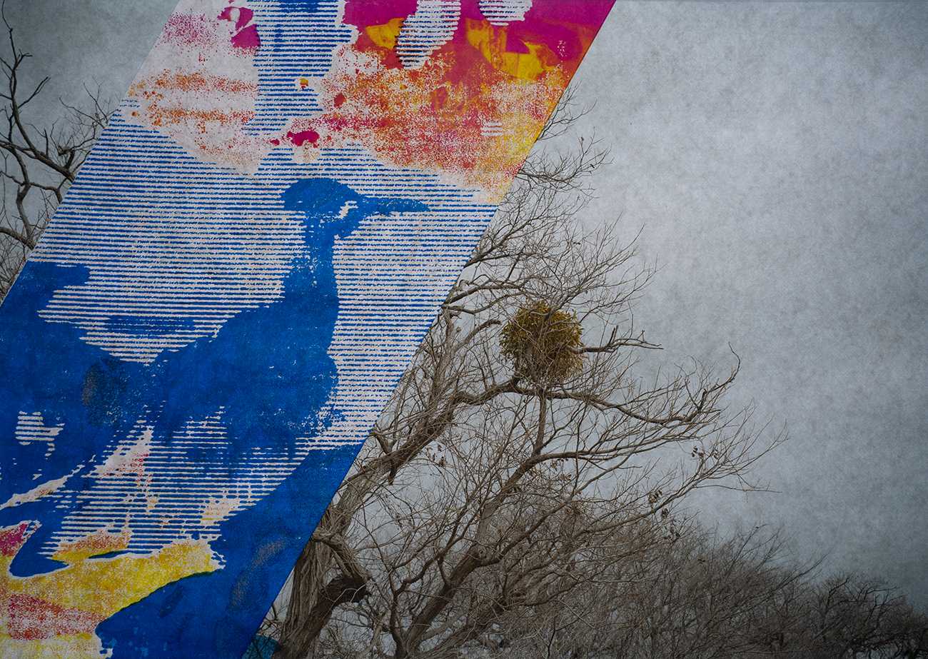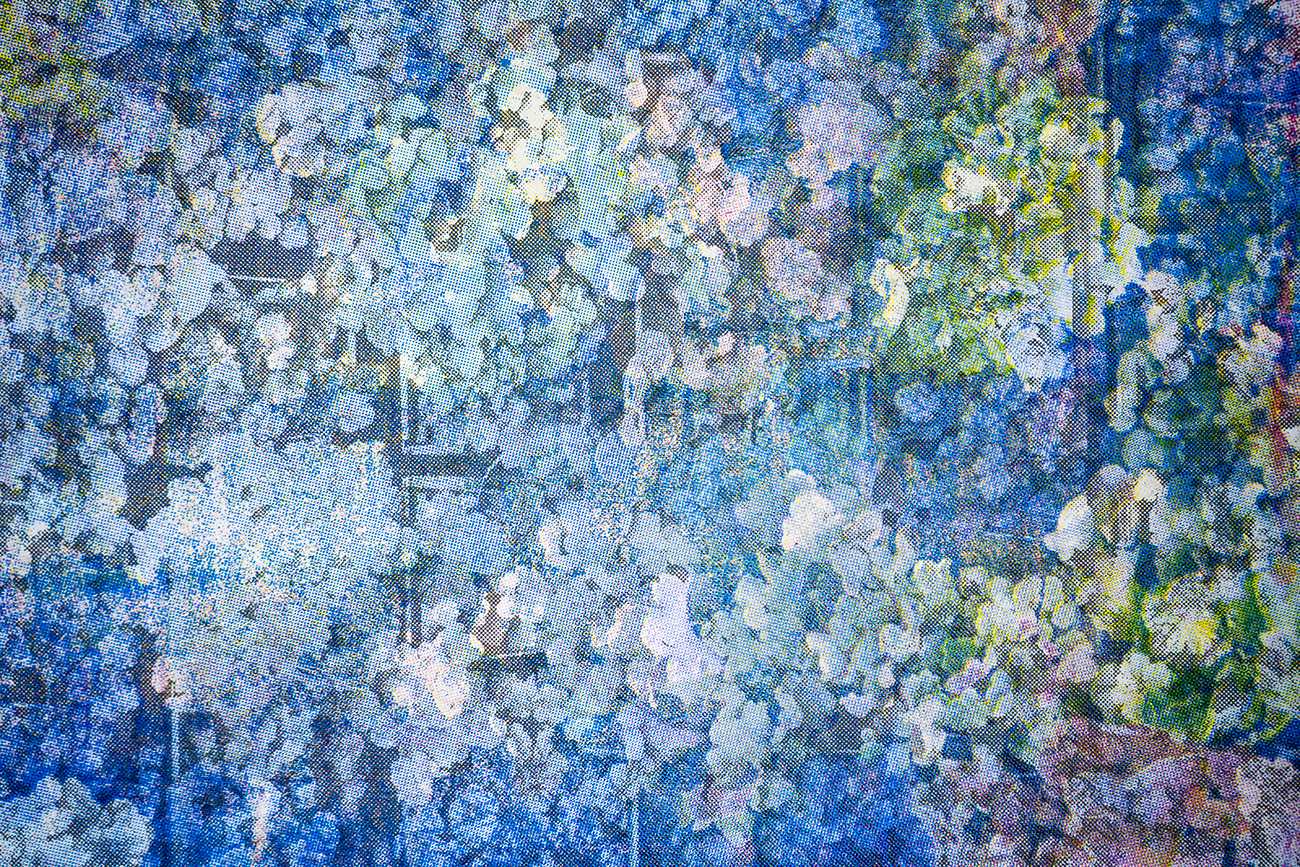 インクジェットの無限複製性に対し、写真を版として大量複製可能なスクリーン印刷で再構成する。刷りの痕跡と再生素材に刷ることを介して、写真をデータではなく一回的な物質的出来事として提示する。