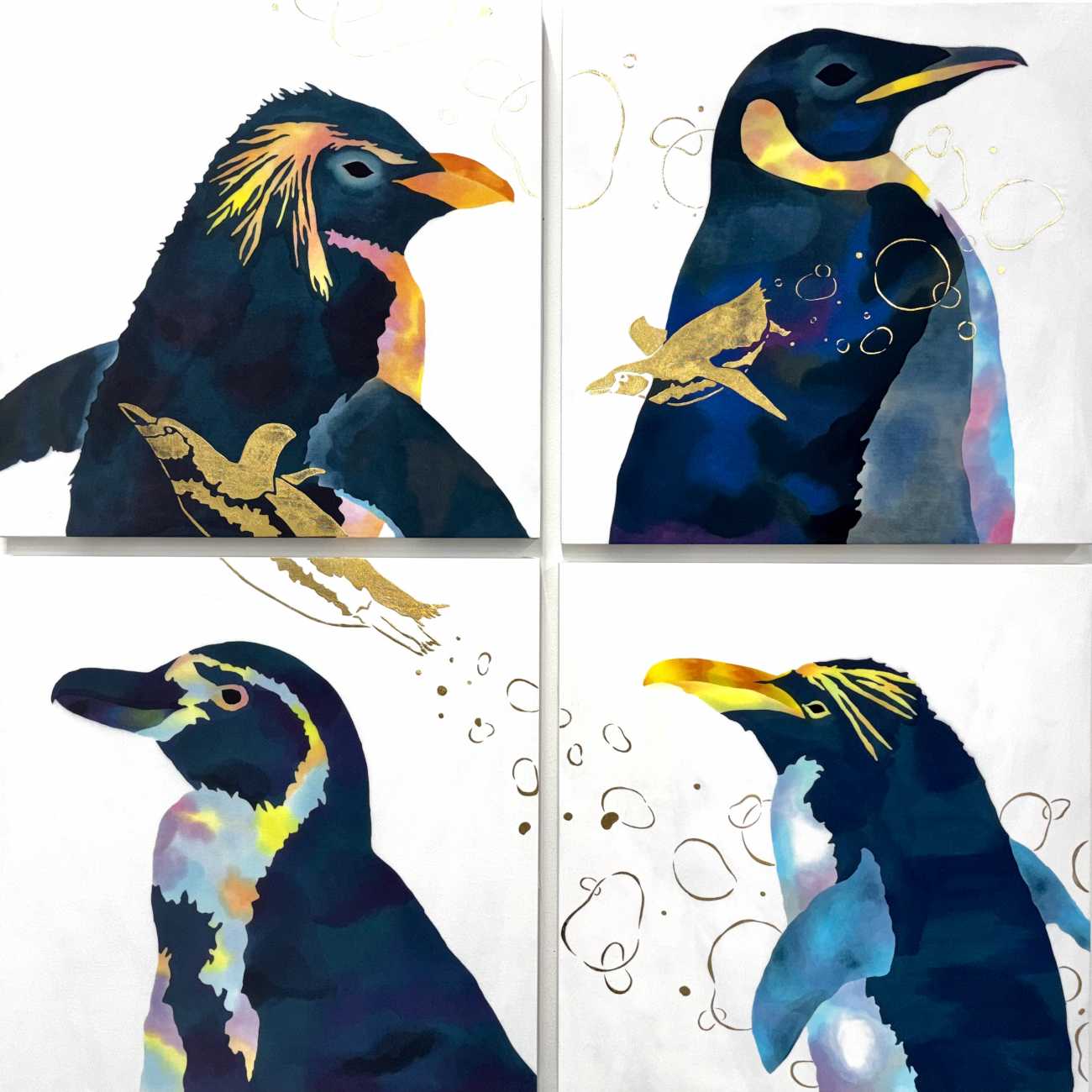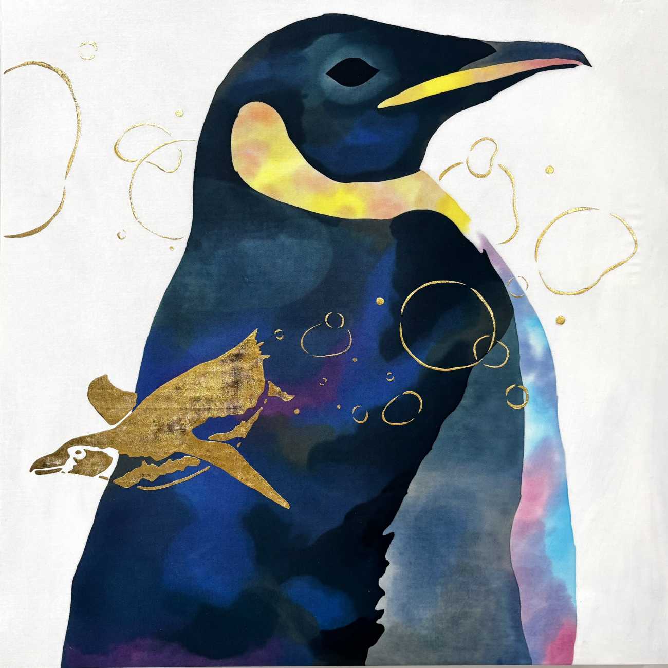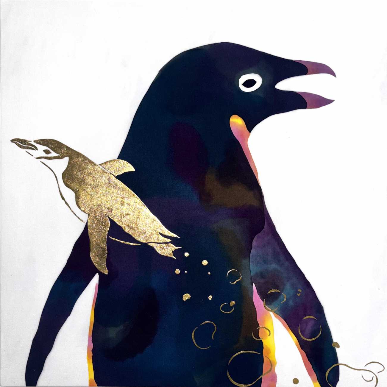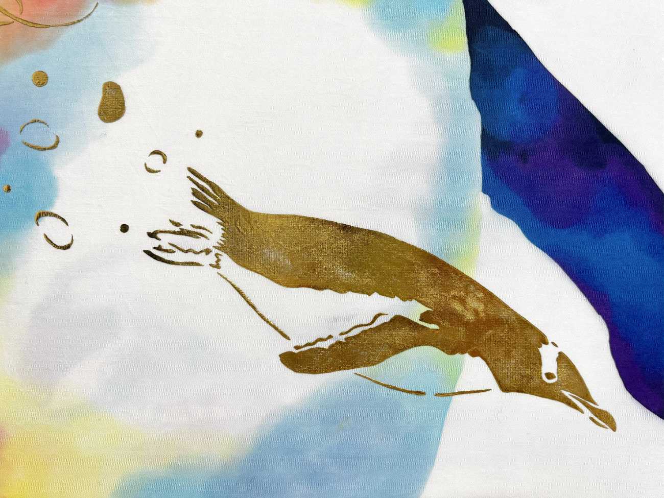 全6属18種類のうち、日本の水族館・動物園などで見ることができる12種類のペンギンをモチーフとし「美しい図鑑」として蝋染で表現した。ペンギンの持つ白と黒のコントラストを大切にしながらも、白い部分には淡いパステル調の色彩を重ね、やわらかくにじむような表現を追求した。「図鑑」という写実的な客観性の中にも、色彩ではフィクションの「創作」として主観性を映し出し、オリジナリティある表現を試みた。蝋染で表現したペンギンたちの上には、図鑑の世界を縦横無尽に生き生きと泳ぎ回るペンギンの姿を金彩で施した。この金彩は、型染用の洋型紙を彫り、糊を置き、金彩フィルムをアイロン接着している。金彩を施すことで、平面作品の中に奥行きをつくり出し、また12枚で1つの大きな画面を構成する効果を目指した。