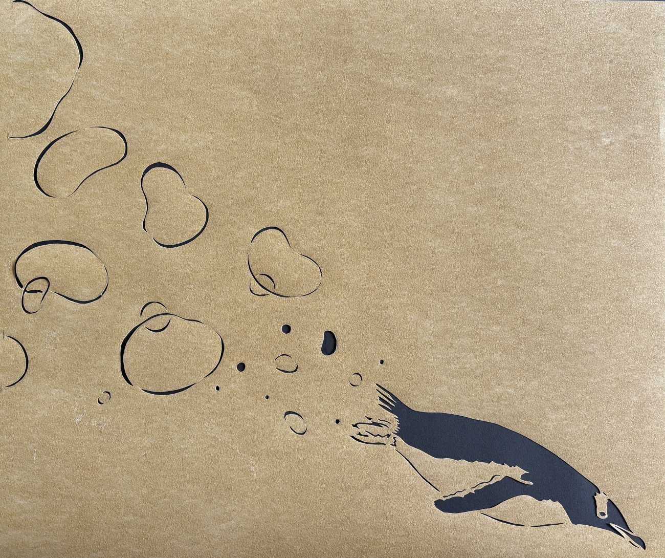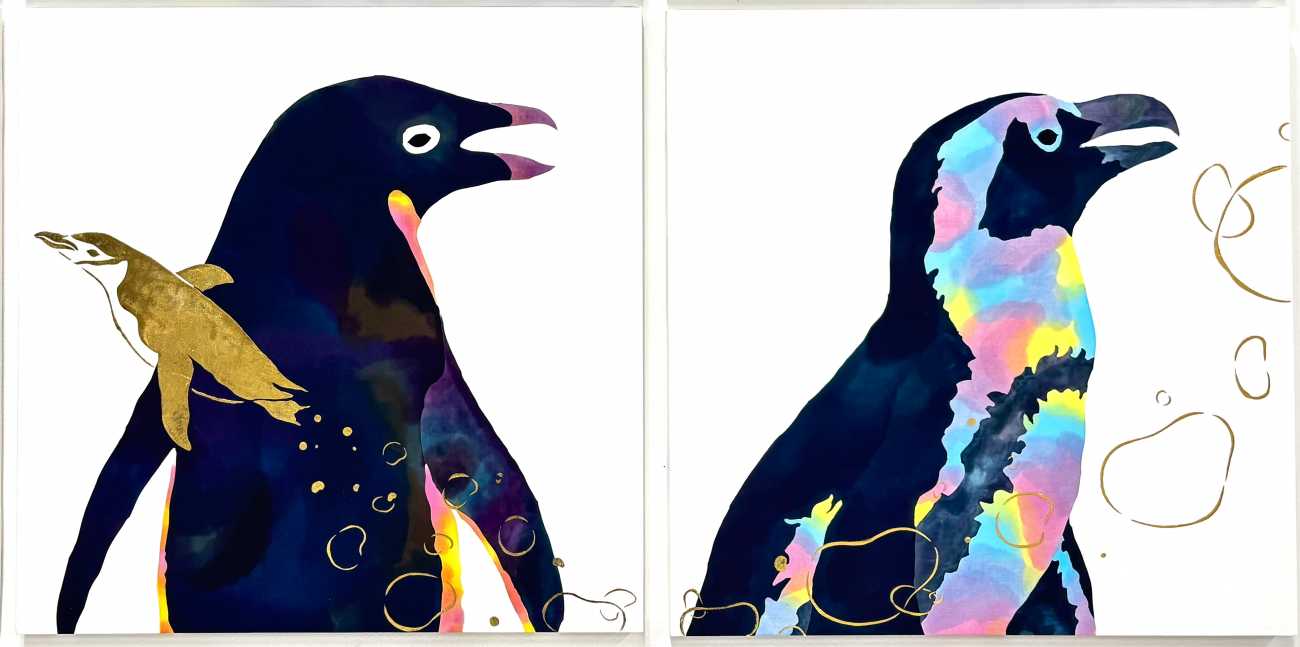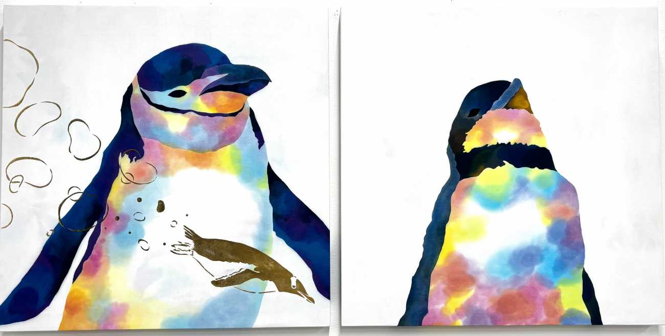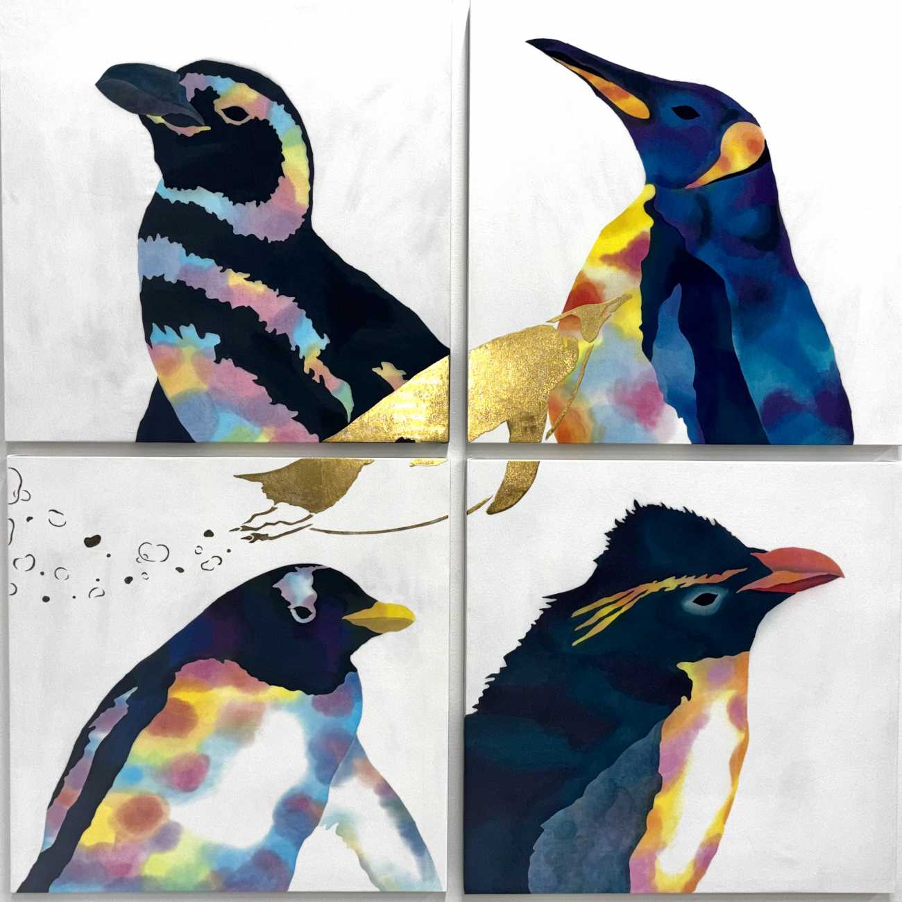 全6属18種類のうち、日本の水族館・動物園などで見ることができる12種類のペンギンをモチーフとし「美しい図鑑」として蝋染で表現した。ペンギンの持つ白と黒のコントラストを大切にしながらも、白い部分には淡いパステル調の色彩を重ね、やわらかくにじむような表現を追求した。「図鑑」という写実的な客観性の中にも、色彩ではフィクションの「創作」として主観性を映し出し、オリジナリティある表現を試みた。蝋染で表現したペンギンたちの上には、図鑑の世界を縦横無尽に生き生きと泳ぎ回るペンギンの姿を金彩で施した。この金彩は、型染用の洋型紙を彫り、糊を置き、金彩フィルムをアイロン接着している。金彩を施すことで、平面作品の中に奥行きをつくり出し、また12枚で1つの大きな画面を構成する効果を目指した。