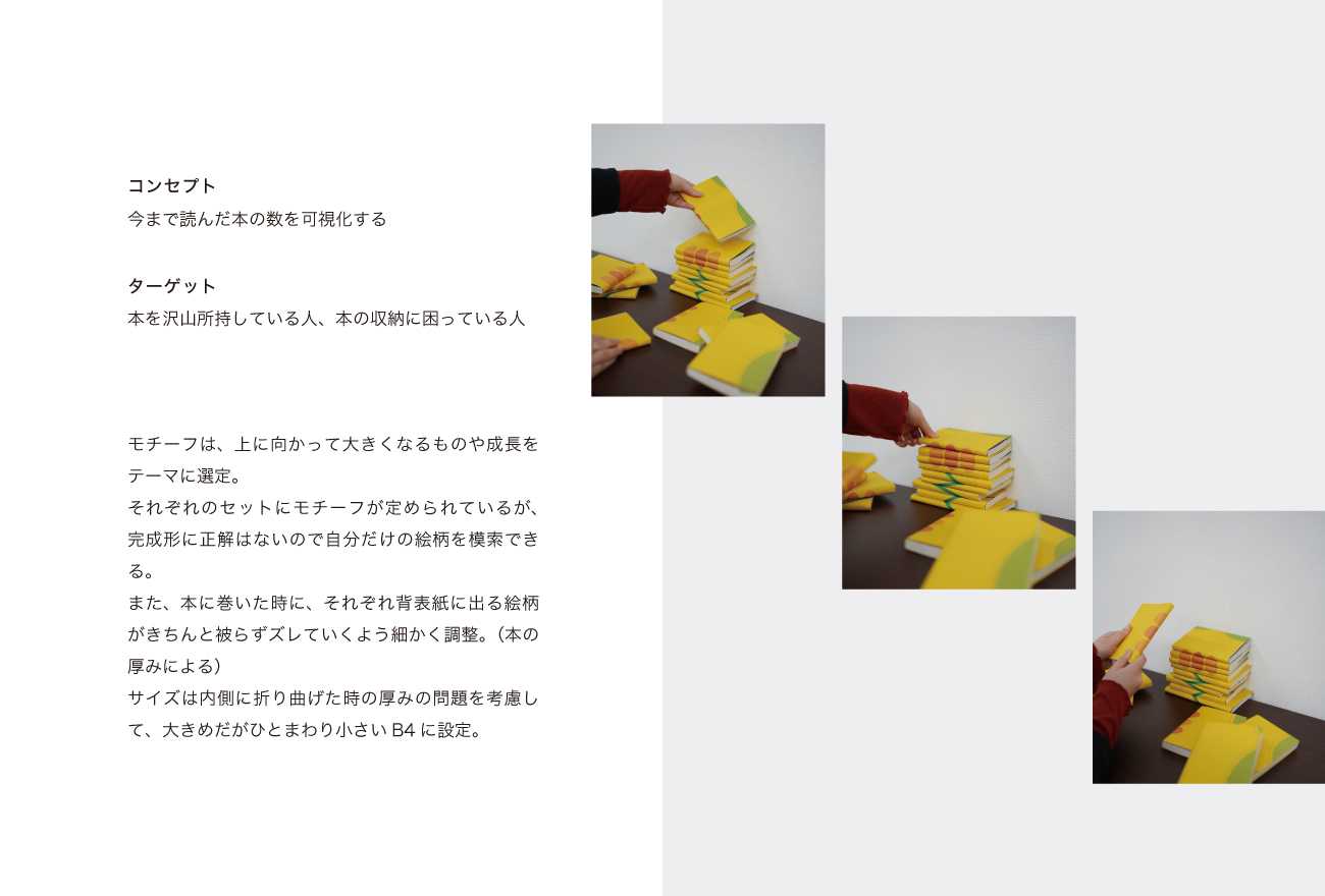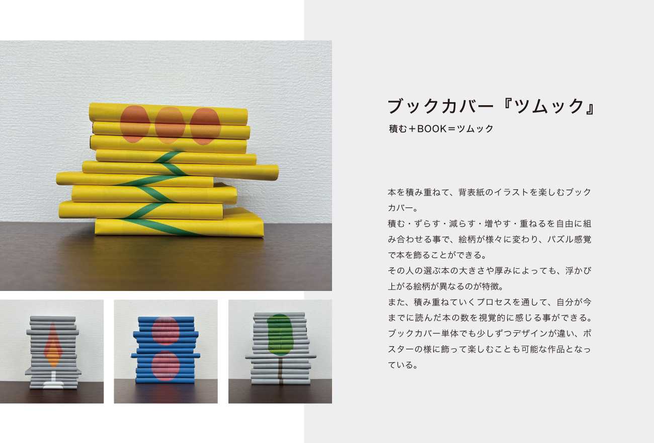 友人からの「増えすぎた本の居場所に困る」という悩みに共感し、本を積み重ね背表紙のイラストを楽しむブックカバーを制作しました。