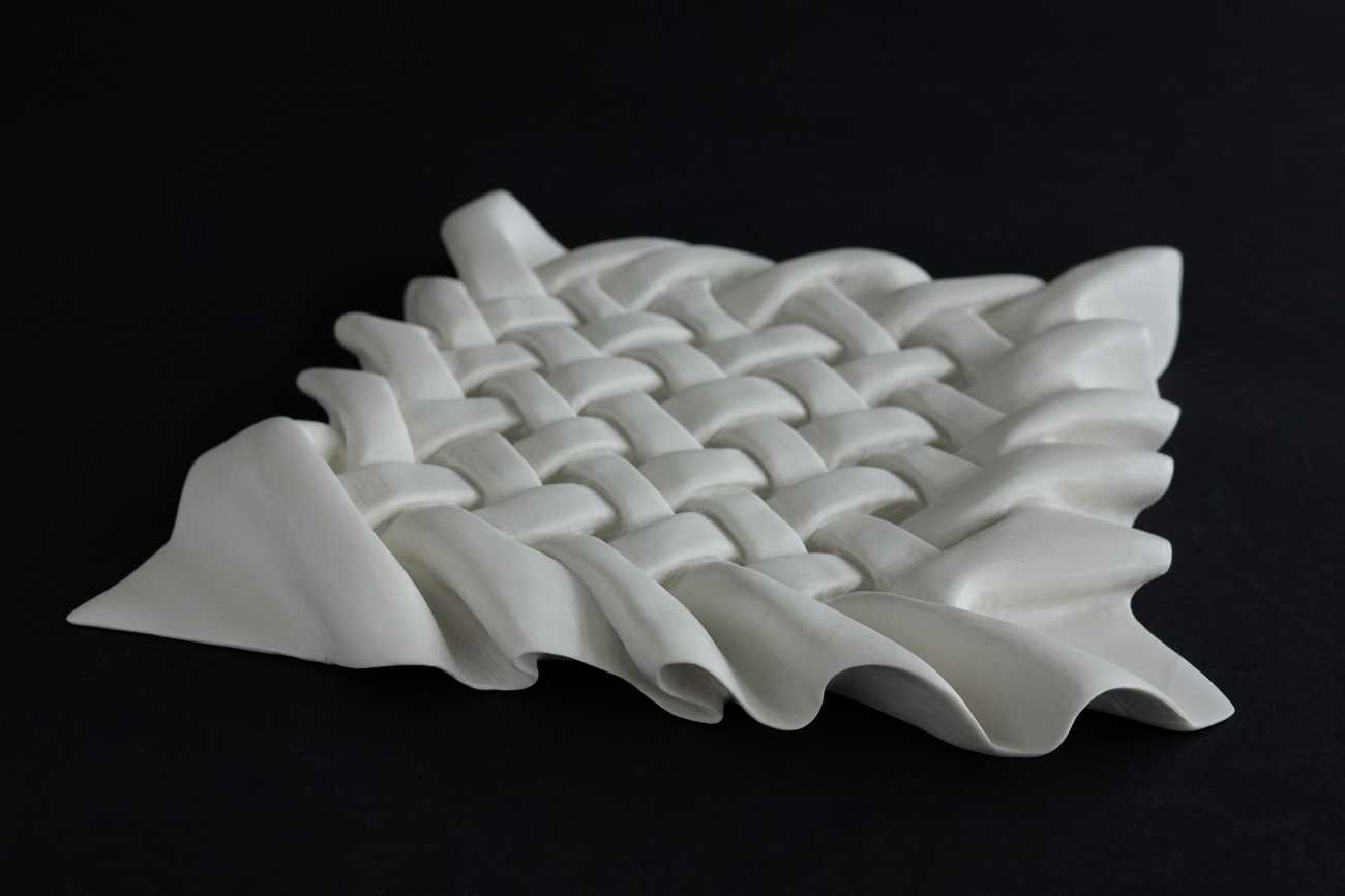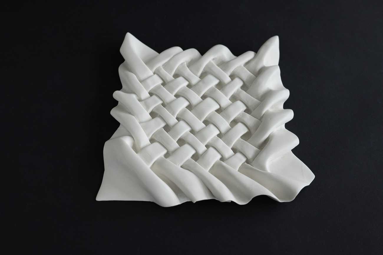 2.5cm厚の土板から彫り出し、素焼き後の硬い肌をさらに削り込むことで、薄い布の表情を追求した。焼き締め後、耐水ペーパーで磨き上げた表面は、土の質感を残しながらもしっとりと光を反射する。重力から解き放たれ、光を纏(まと)うように柔らかく輝くその姿に、布のようなしなやかさと温かみを込めた。