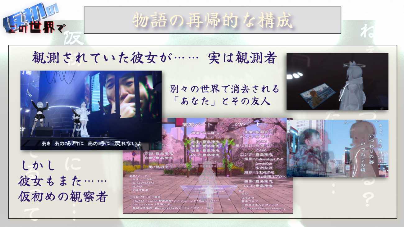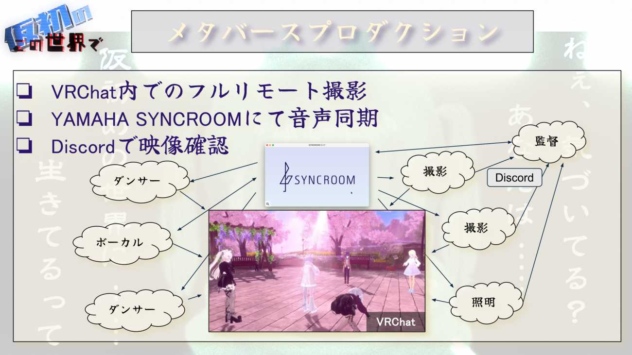 日本各地からメタバース内に集まった仲間たちと撮影しました。照明の設置やドリー撮影のための仮想的なレールの設置、カメラワークなども、仮想区間内でパフォーマンスに合わせ各担当がリアルタイムで行っています。