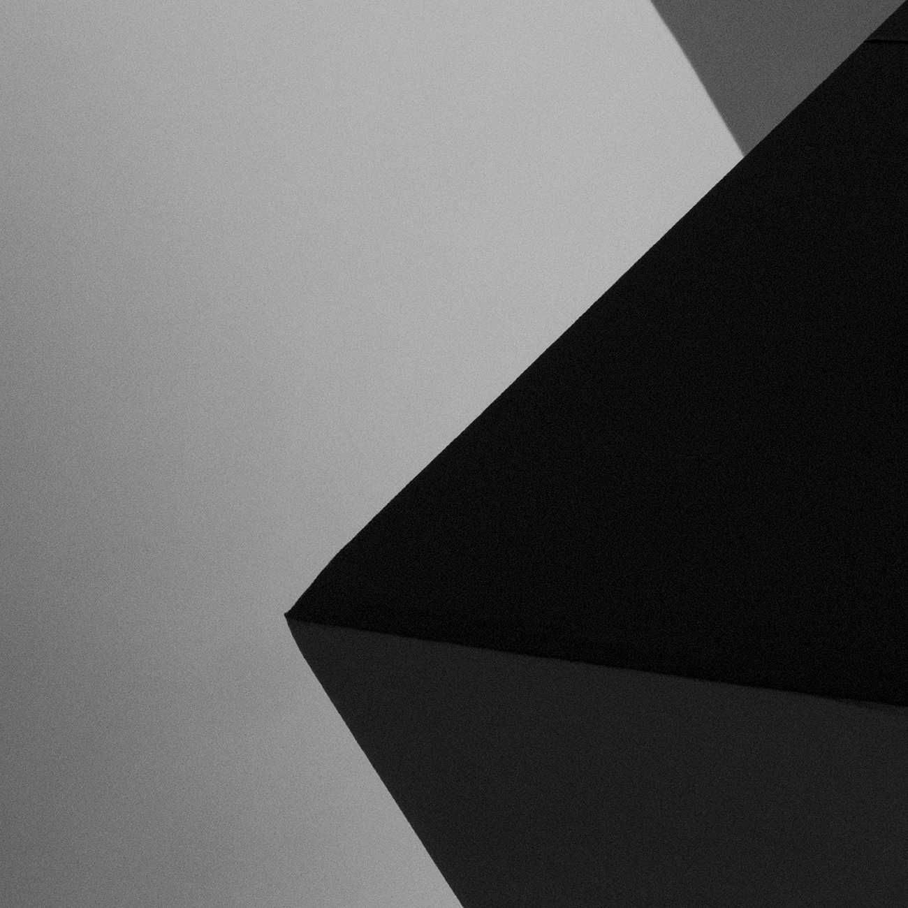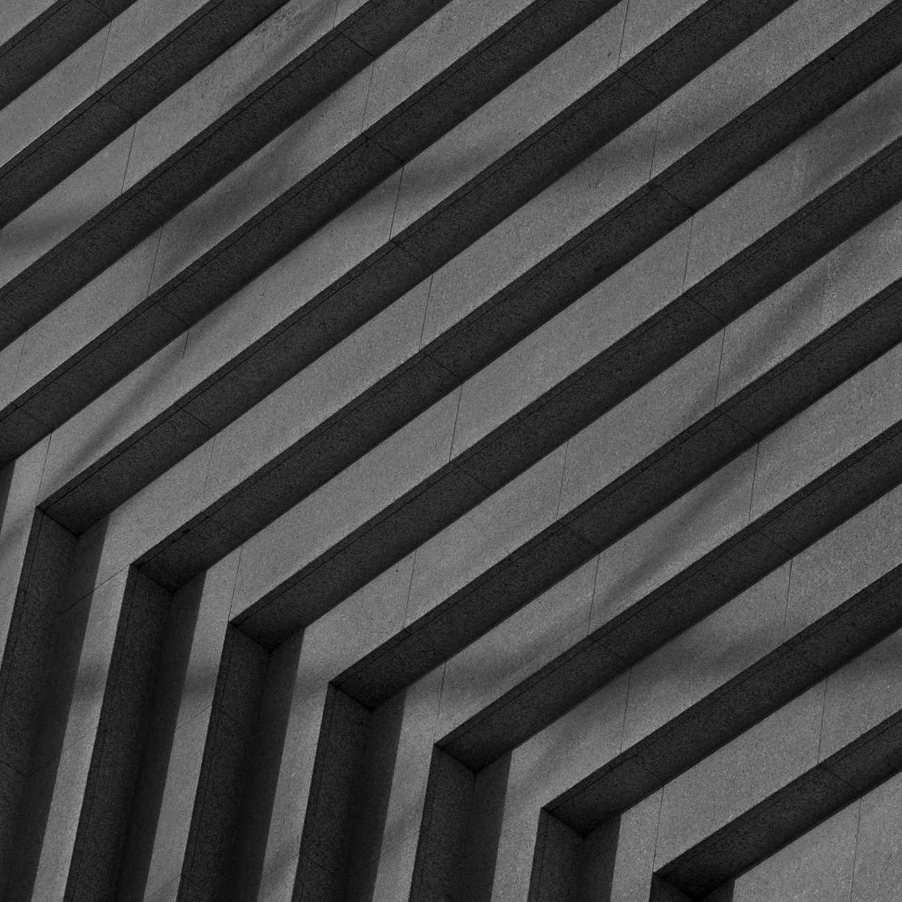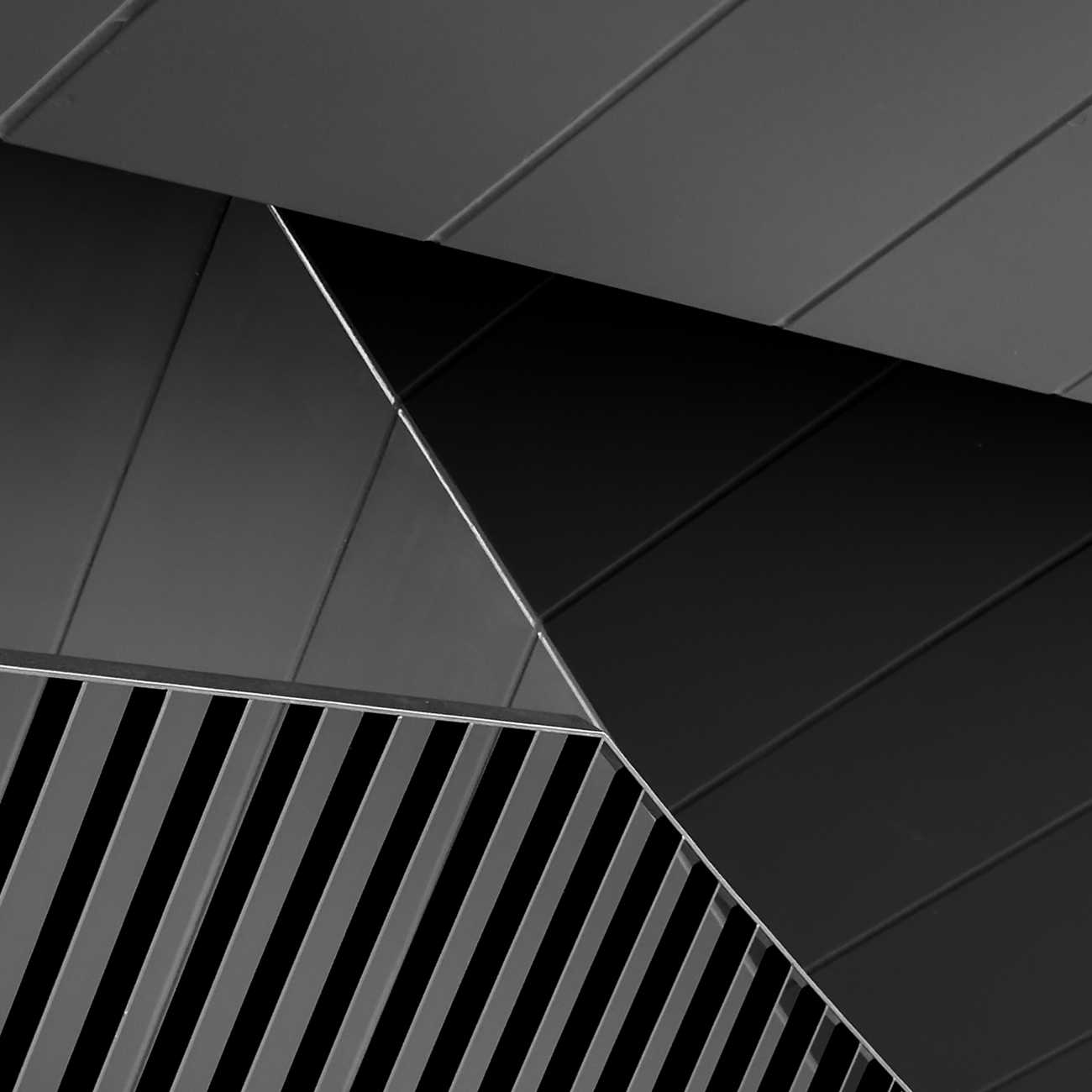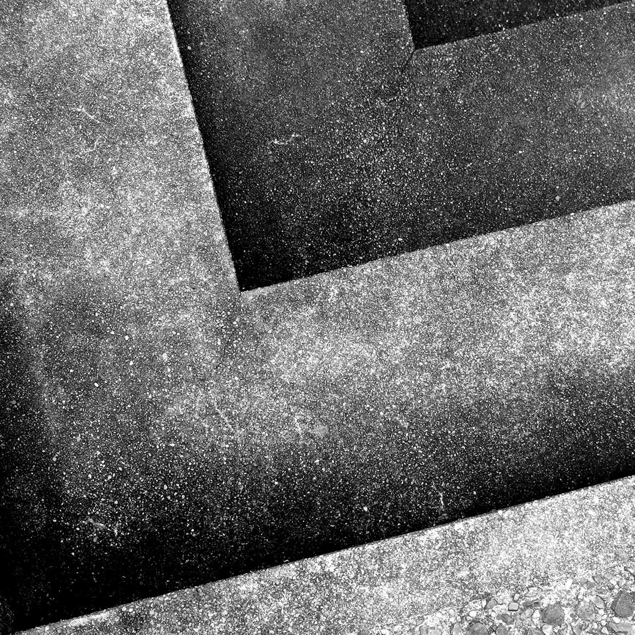 階段、柱、フェンスなどの日常的な建築要素を、狭い画角や圧縮効果によって平面的に切り取り、用途や場所といった文脈から切り離す。モノクロームとすることで色彩の情報も排除し、線と面、光と影の関係をより純粋に抽出している。