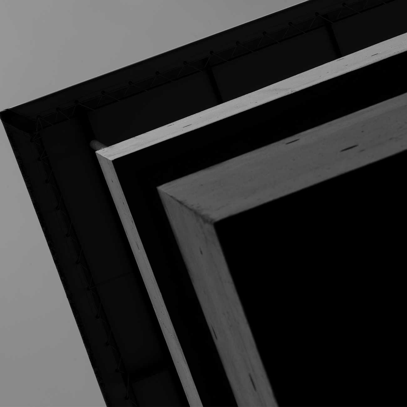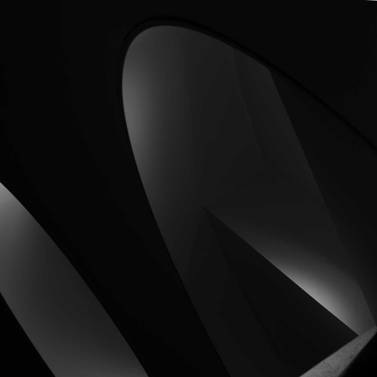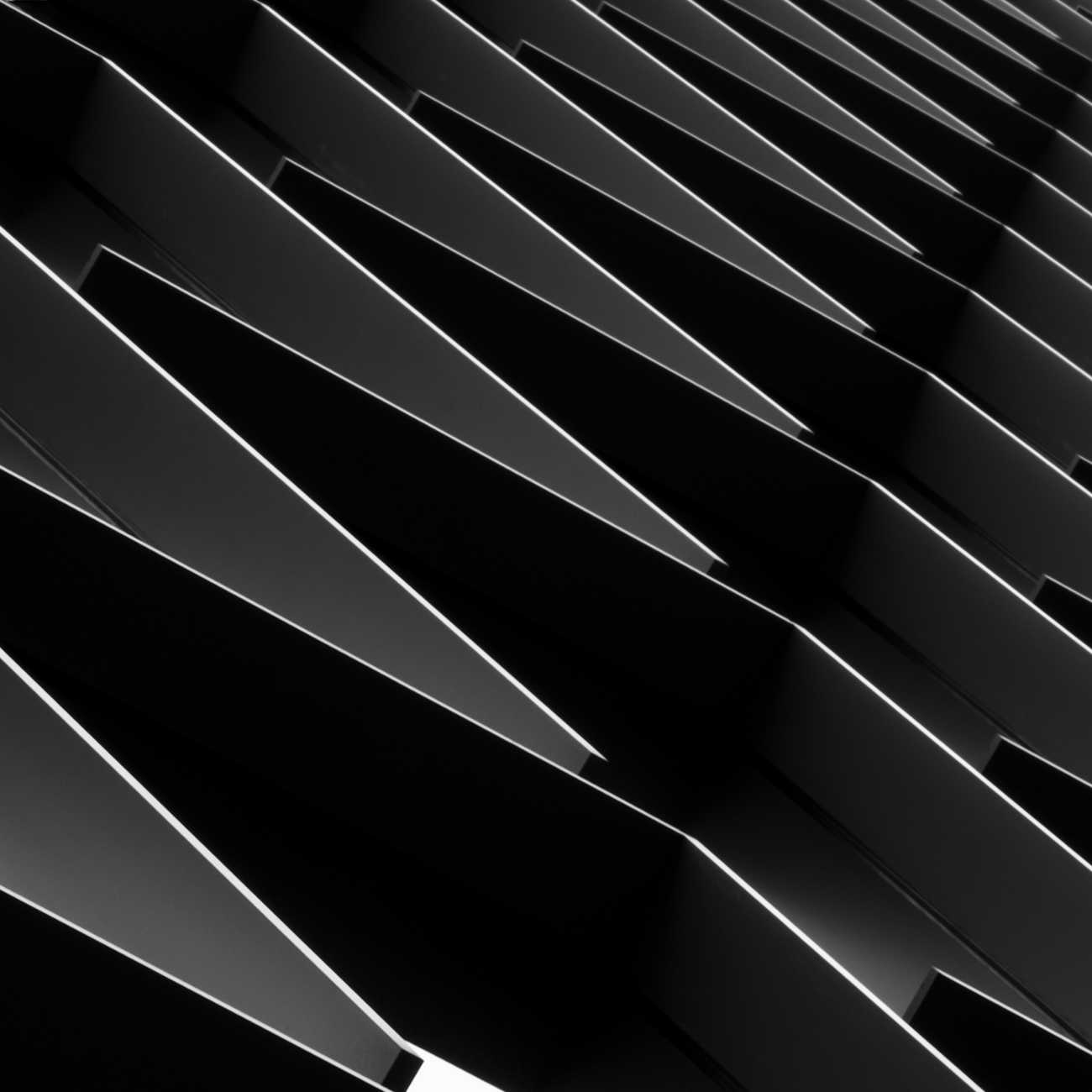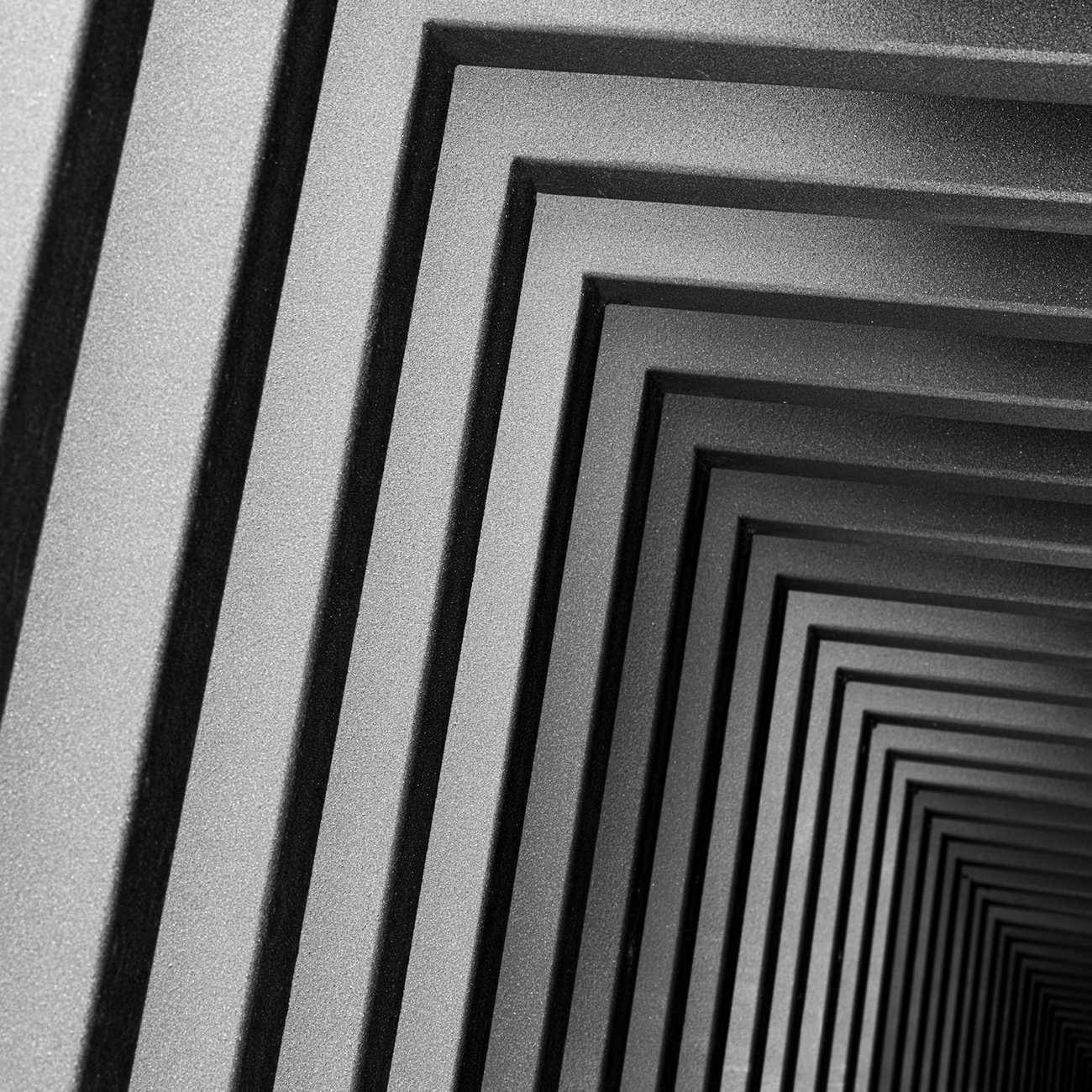 階段、柱、フェンスなどの日常的な建築要素を、狭い画角や圧縮効果によって平面的に切り取り、用途や場所といった文脈から切り離す。モノクロームとすることで色彩の情報も排除し、線と面、光と影の関係をより純粋に抽出している。