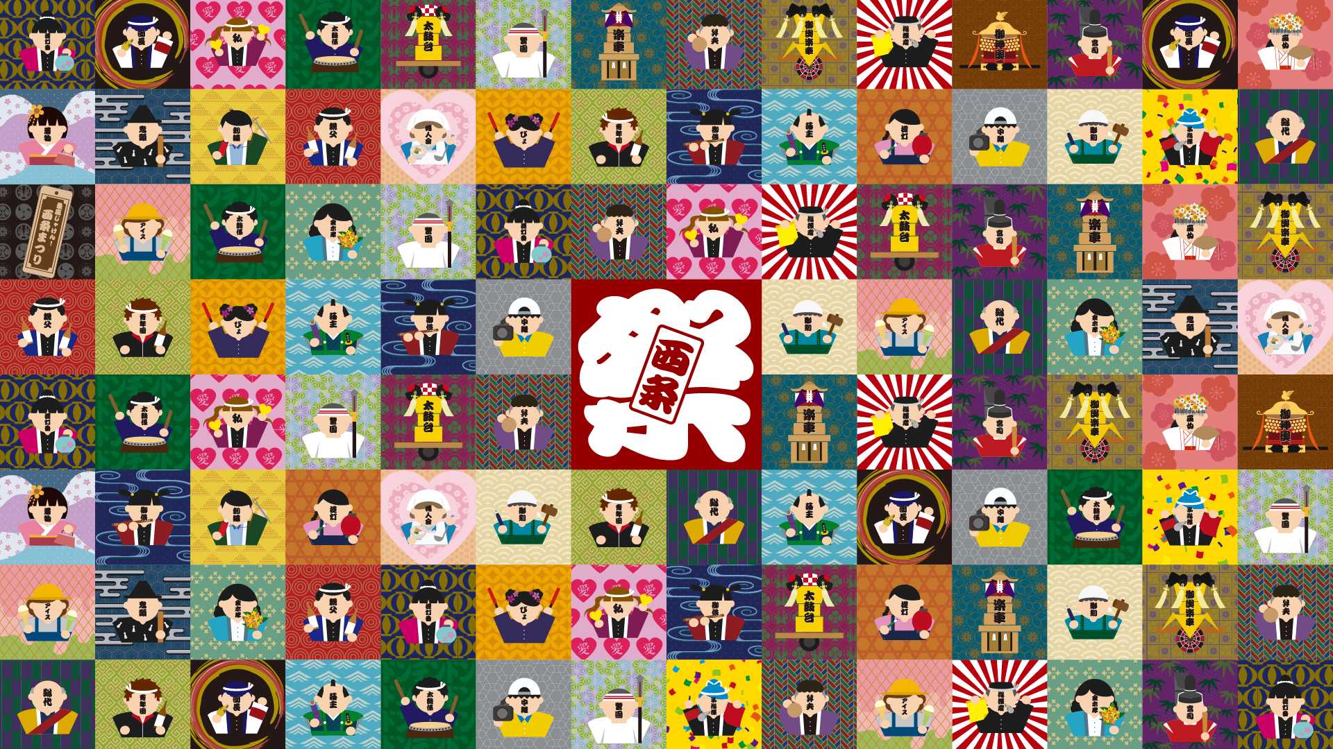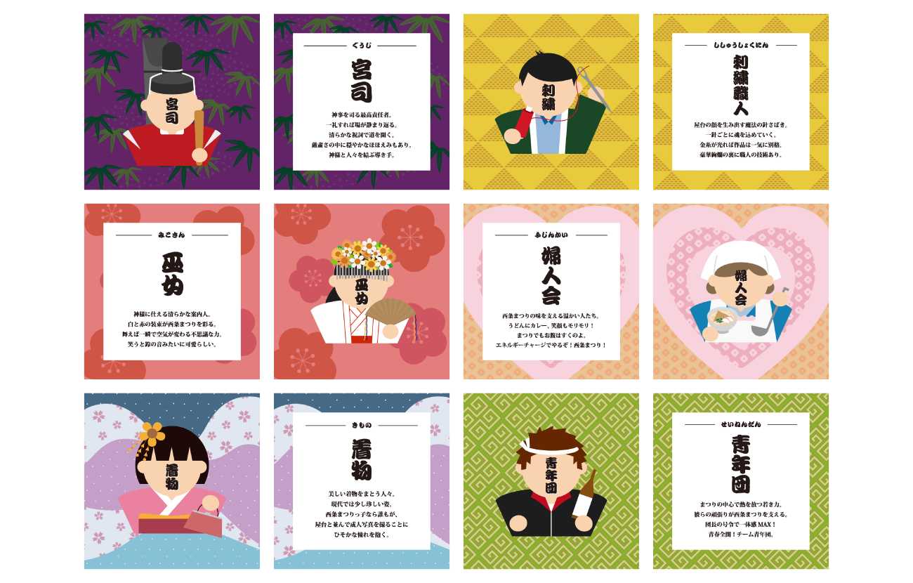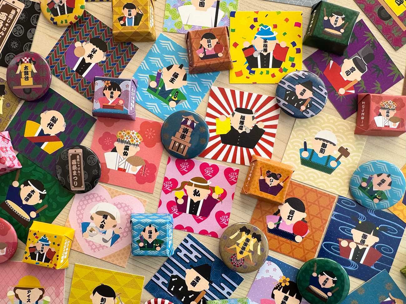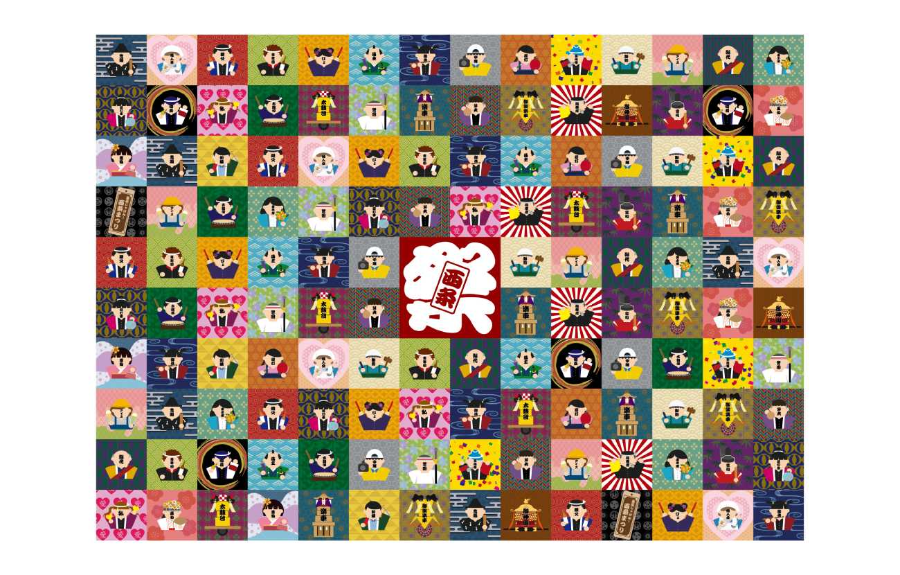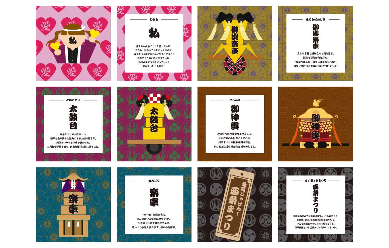 完成作品として、西条まつりに関わる人々と屋台をモチーフにしたカード、缶バッチ、お菓子の包み紙、そしてB0サイズの幕を制作しました。