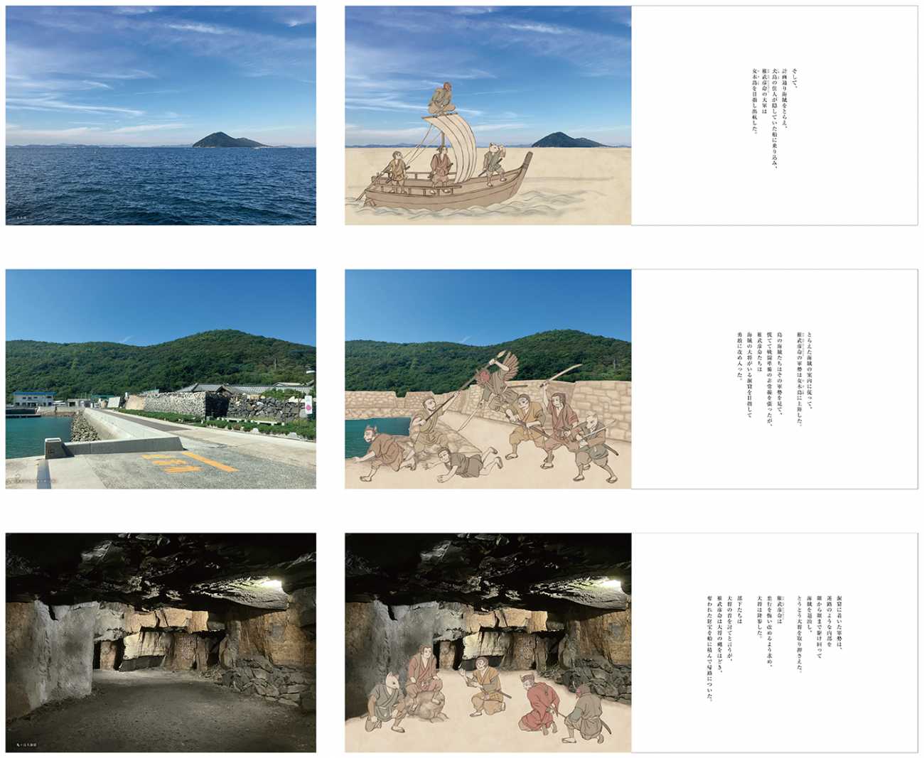 伝説の物語に沿って、見開きごとに一つの場所を紹介している。写真・イラスト・文章を組み合わせることで、読者が現実の風景と物語を重ね、訪れることを想像しながら読めるものを目指した。