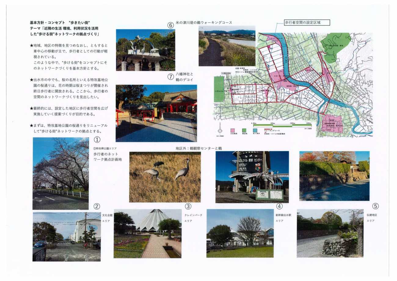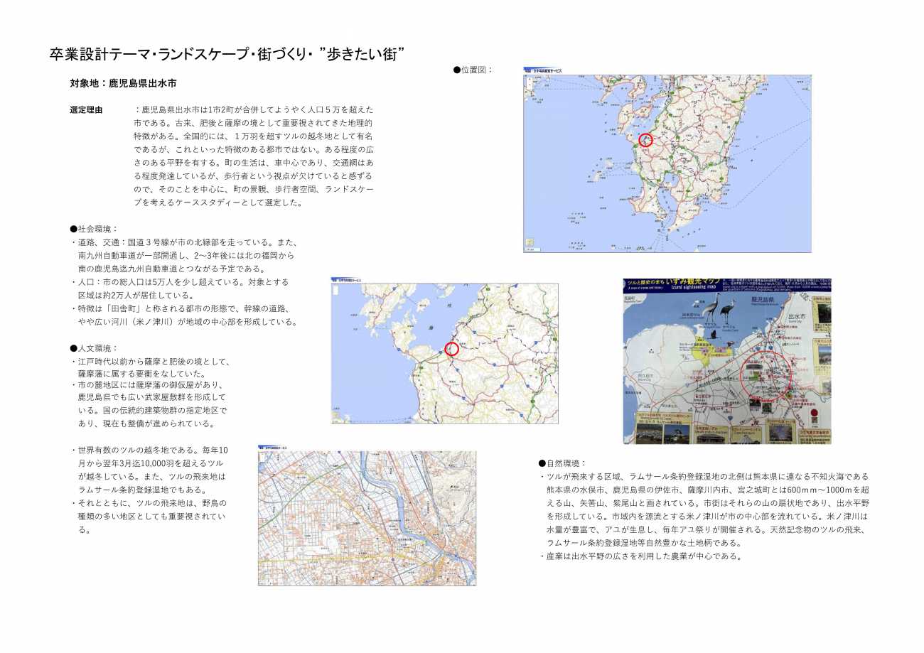 ・選定した鹿児島県出水市は典型的な「田舎町」である。古来、肥後と薩摩の境として重要視されてきた薩摩藩の要衝の地であった。 全国的には、毎年1万羽を超えるツルの越冬地としてしられているが、これとといって特徴のある都市ではない。幸いに、薩摩藩の武家屋敷群が国の重要伝統的建築物群の指定を受けており、鹿児島県でも最も広い面積を有している。このような町の主要施設を繋いだ歩行者空間のネットワークをつくり、町の生活に歩行者の視点を取り戻すような”街づくり”をめざしてこの計画を提案します。