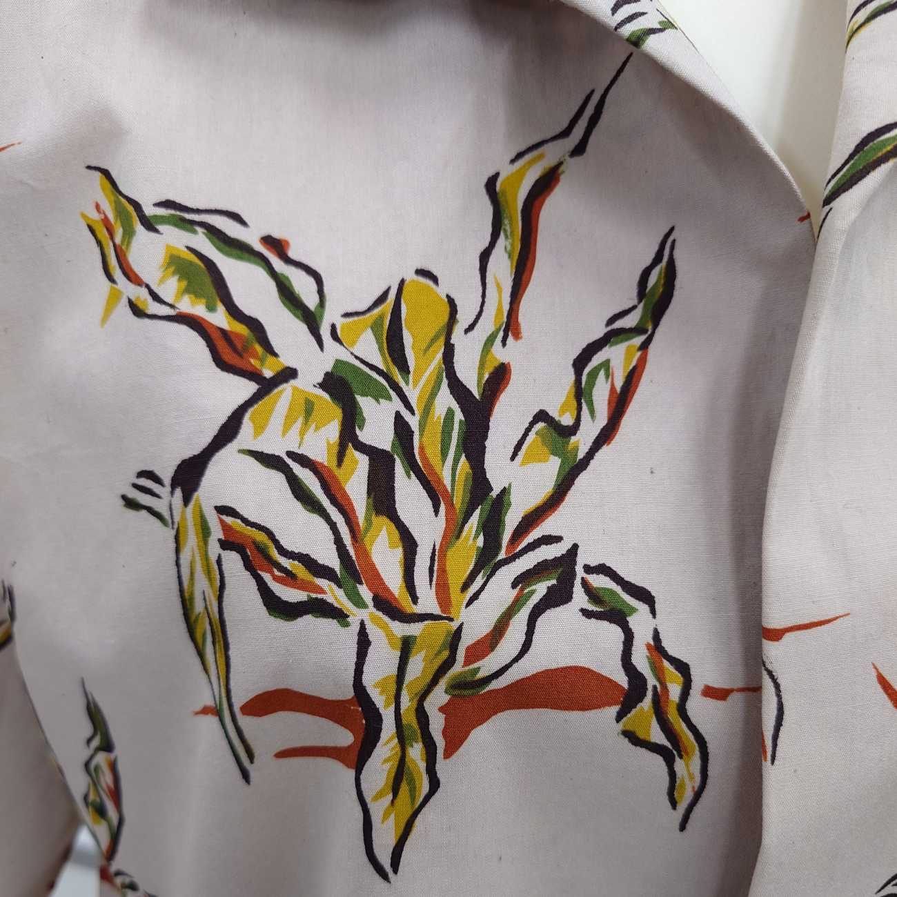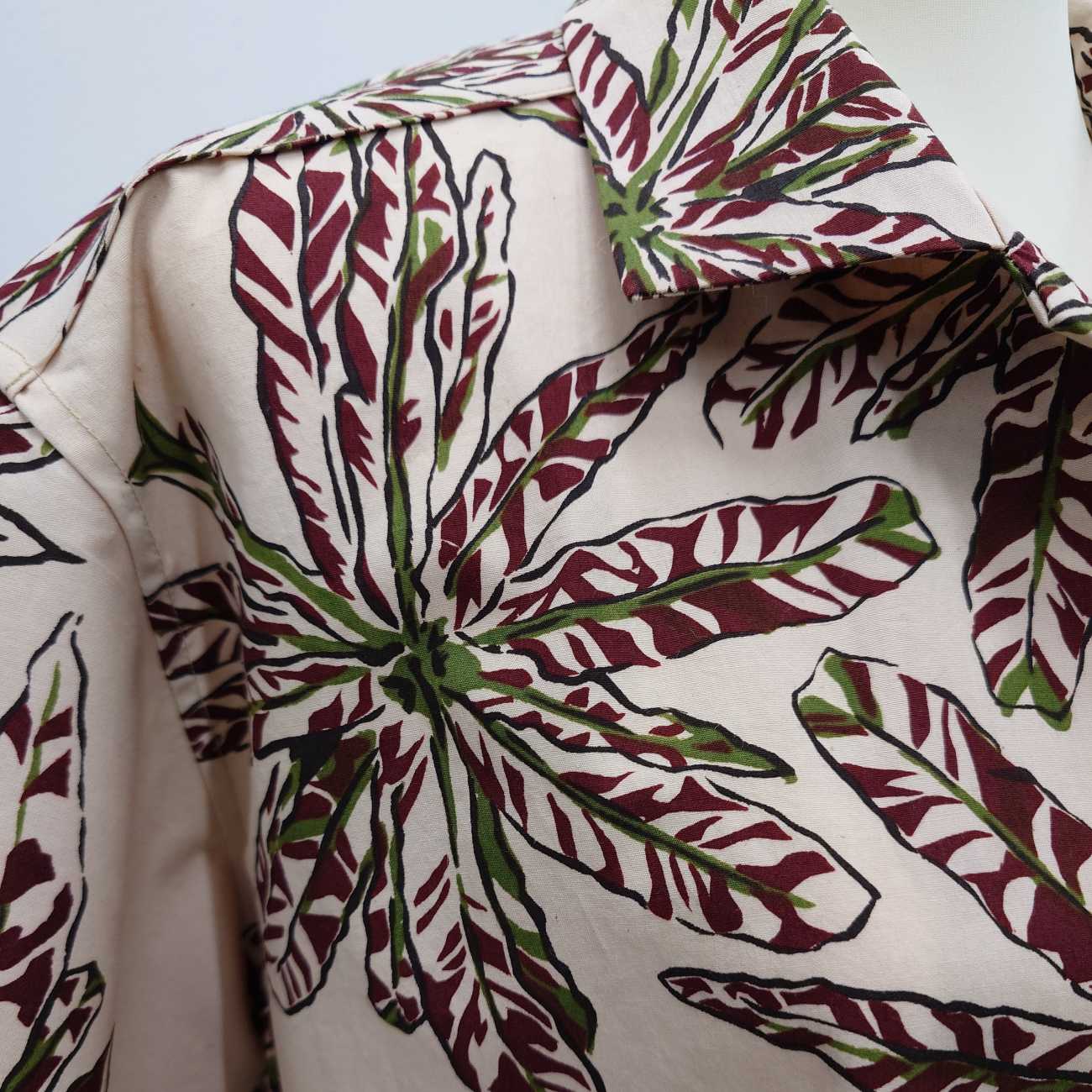 右側は、上から見たオオタニワタリをモチーフにしています。葉が大きく広がる様子が、花のようにも見える点に着目し、たくさん花開いているような柄がシャツの全体を埋め尽くす鮮やかな楽しい柄のシャツになりました。