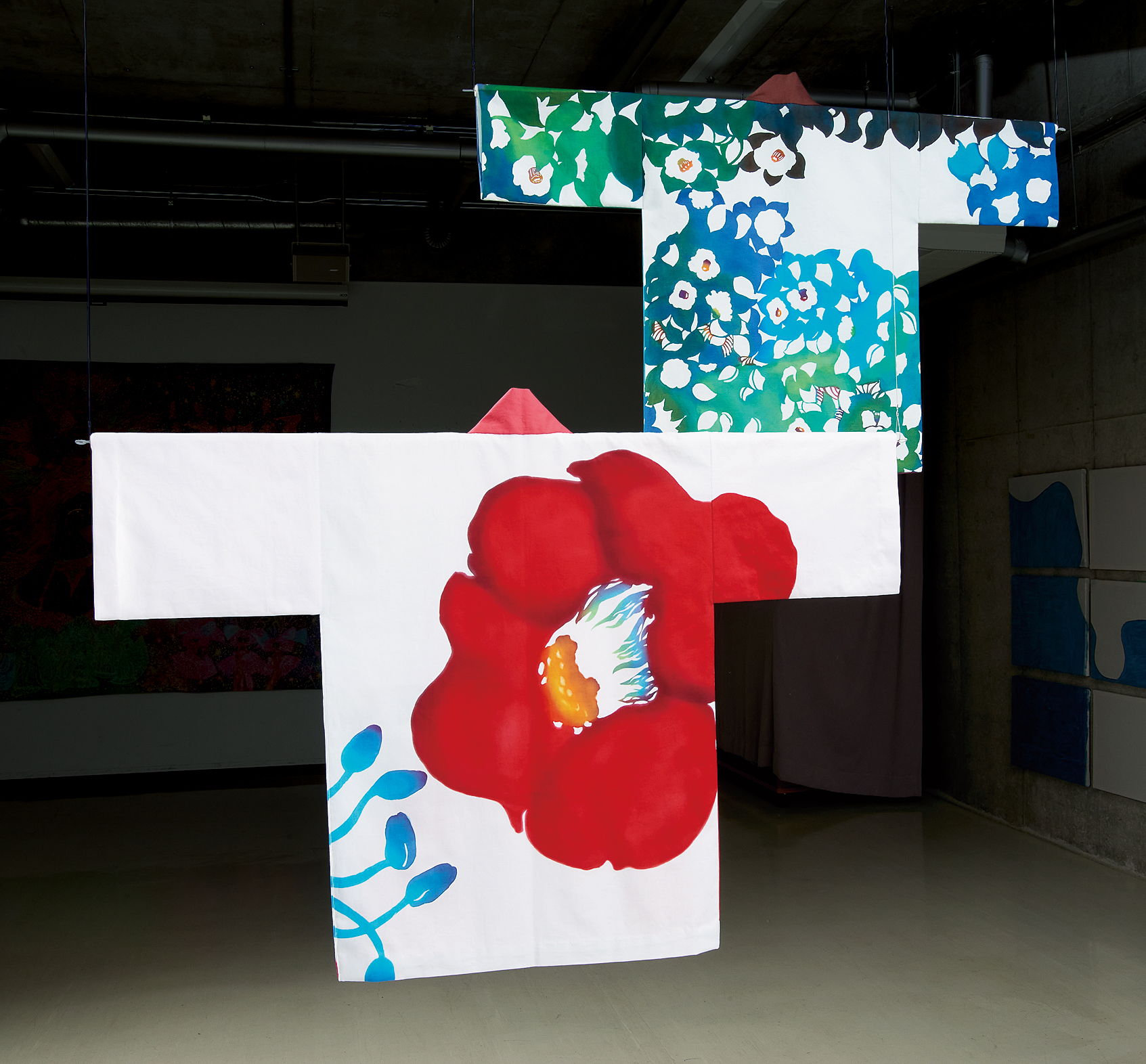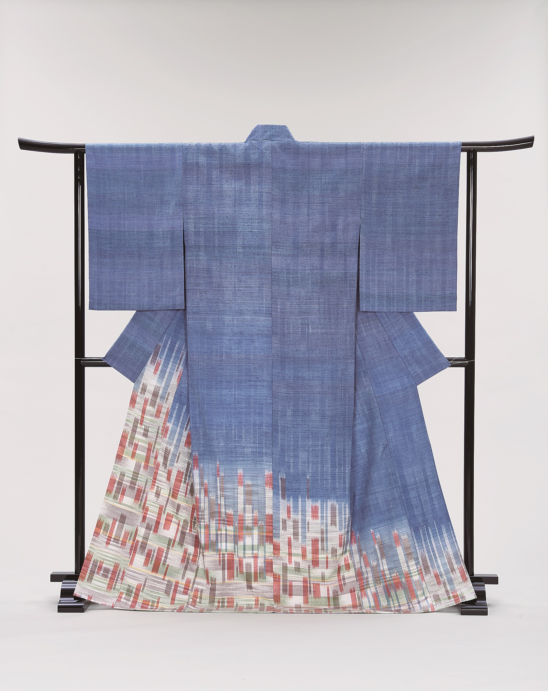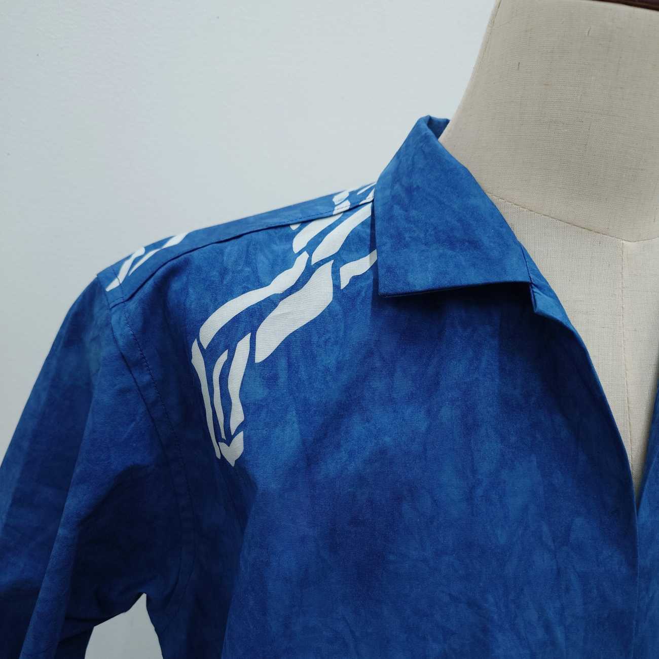 中央は、藍染めの地色に白の藍抜染の型染を用いたオオタニワタリ柄です。柄は、背中にはみ出るほどの大きい柄を大胆に入れ、さらに、ヨークから前に少し垂れるつながりも出し、大きく葉に包まれるような柄のシャツに仕上げました。