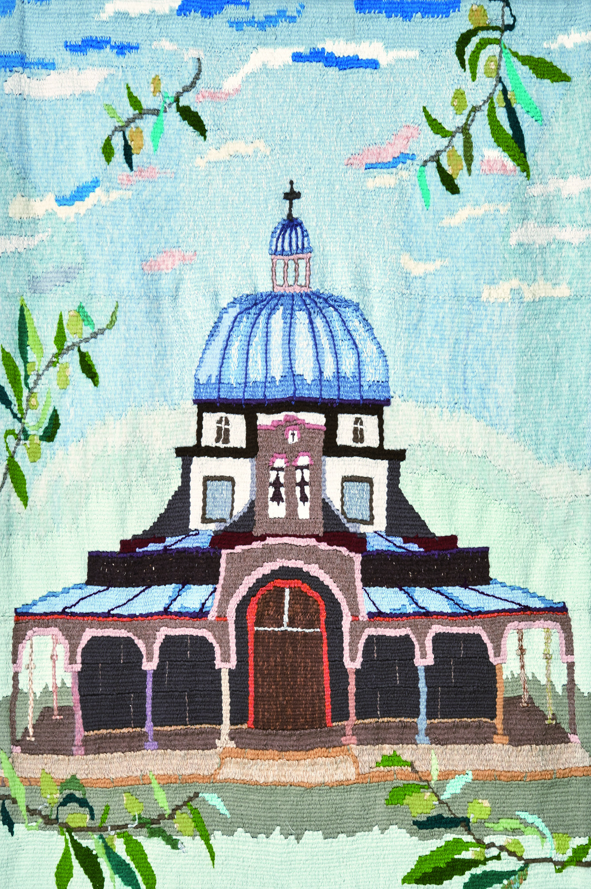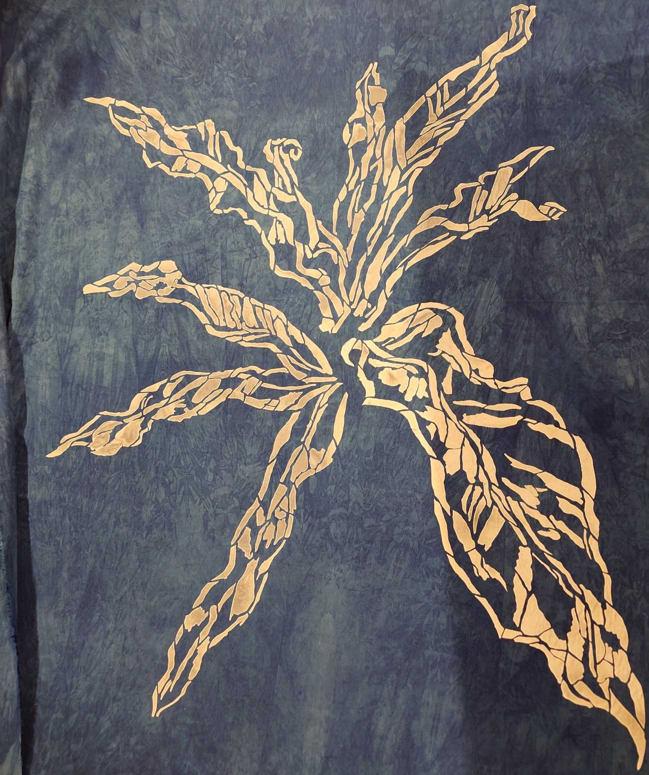 『これまで習得した染色の技術を日常生活に取り込み、実際に使うものを制作する』をテーマに制作に臨みました。モチーフは、八丈島などに自生しているシダの一種、「オオタニワタリ」。地色は、自然な発色を意識し、草木染で染めました。庭の高野槙(コウヤマキ)の葉を鉄と銅の媒染剤で灰色と薄赤い茶色に染めた2種類と、藍染め1種類の合わて3種類の地色に、別々にデザインしたオオタニワタリ模様でアロハ風の半袖シャツに仕立てました。シャツの仕上がりをイメージして、柄を自由に配置できるのも醍醐味です。