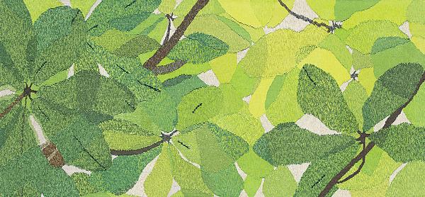 左側は、横からみたオオタニワタリをモチーフに、葉が沢山生えている感じを黄緑、濃緑、濃茶を用いて表現し、さらに土壌の茶色をプラス。連続模様にすること、天然色の地色で湿度の高い森などで、群生している様子を表現しています。