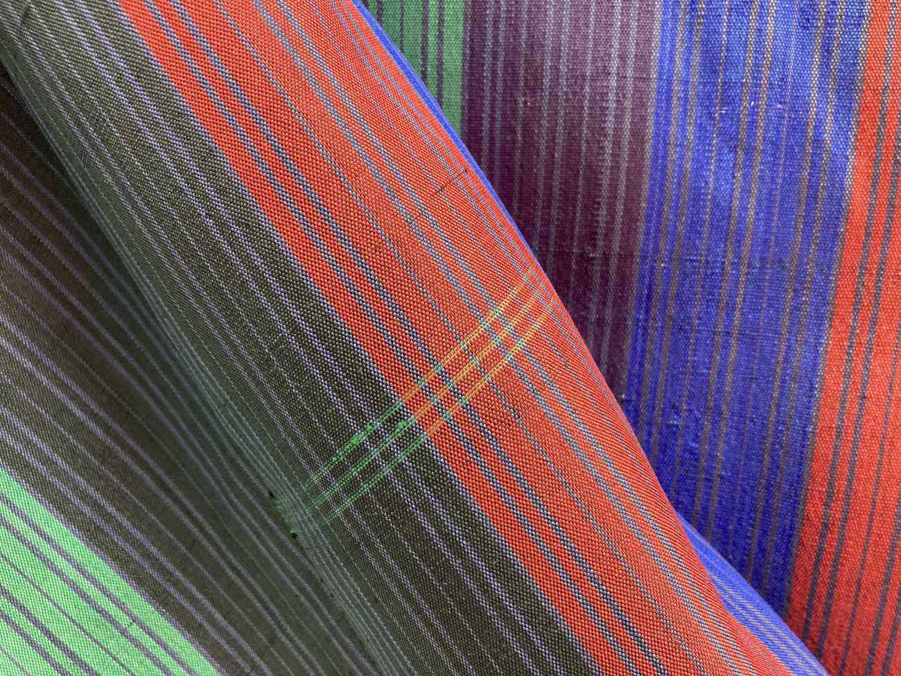 カラスの羽根の煌めきを表現するために、素材は絹にしました。試織をして使用する糸の種類を厳選し、光沢が出るように平織で仕上げています。太く大きな縞の中に細かい縞を施し、所々に少量の絣を織り込むことにより、光の加減で羽根の色が変化して見える様子を表現しました。