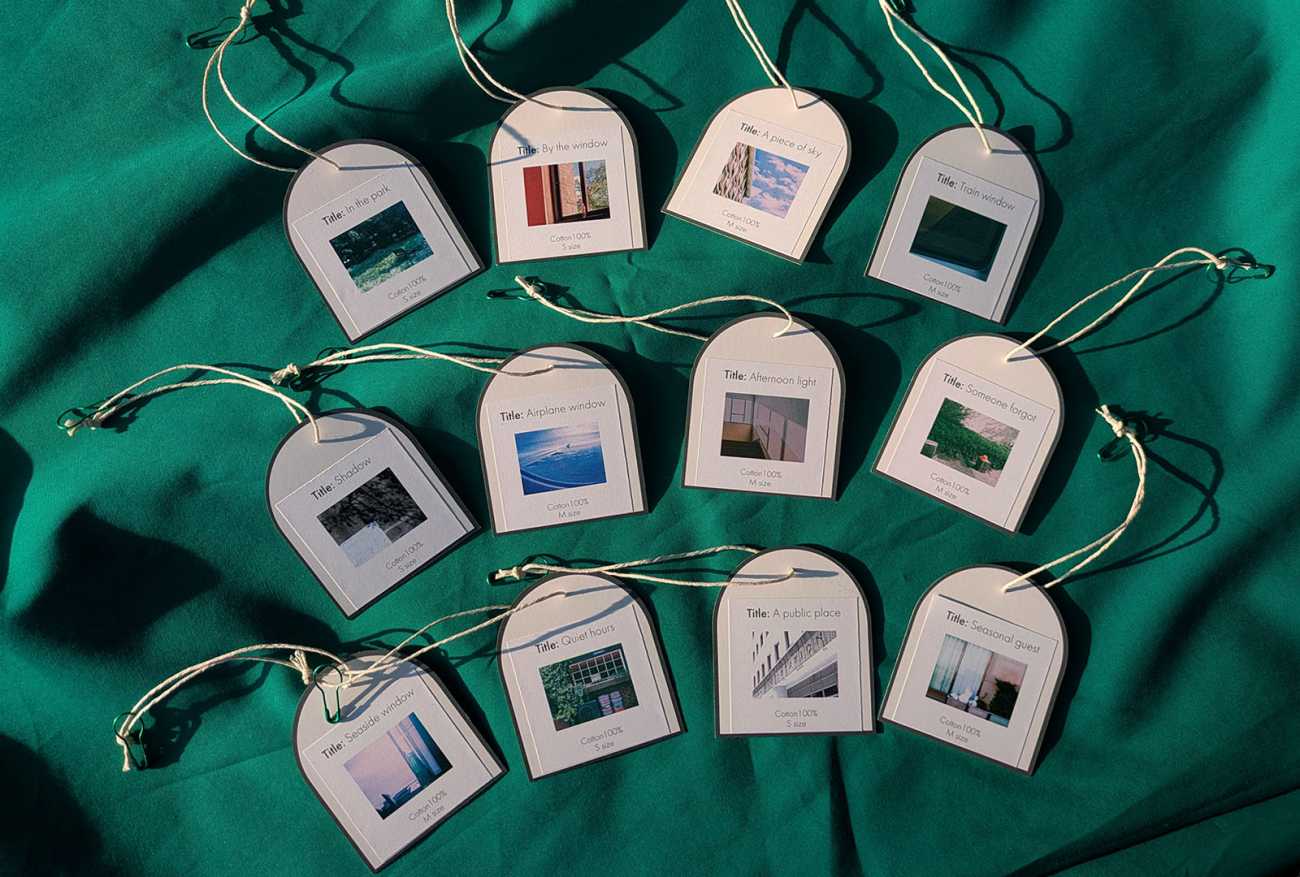 窓モチーフの商品タグ表面と裏面。 描かれた日常の景色を、一つのアート作品として感じてもらうため、商品名を「Title」として表記。