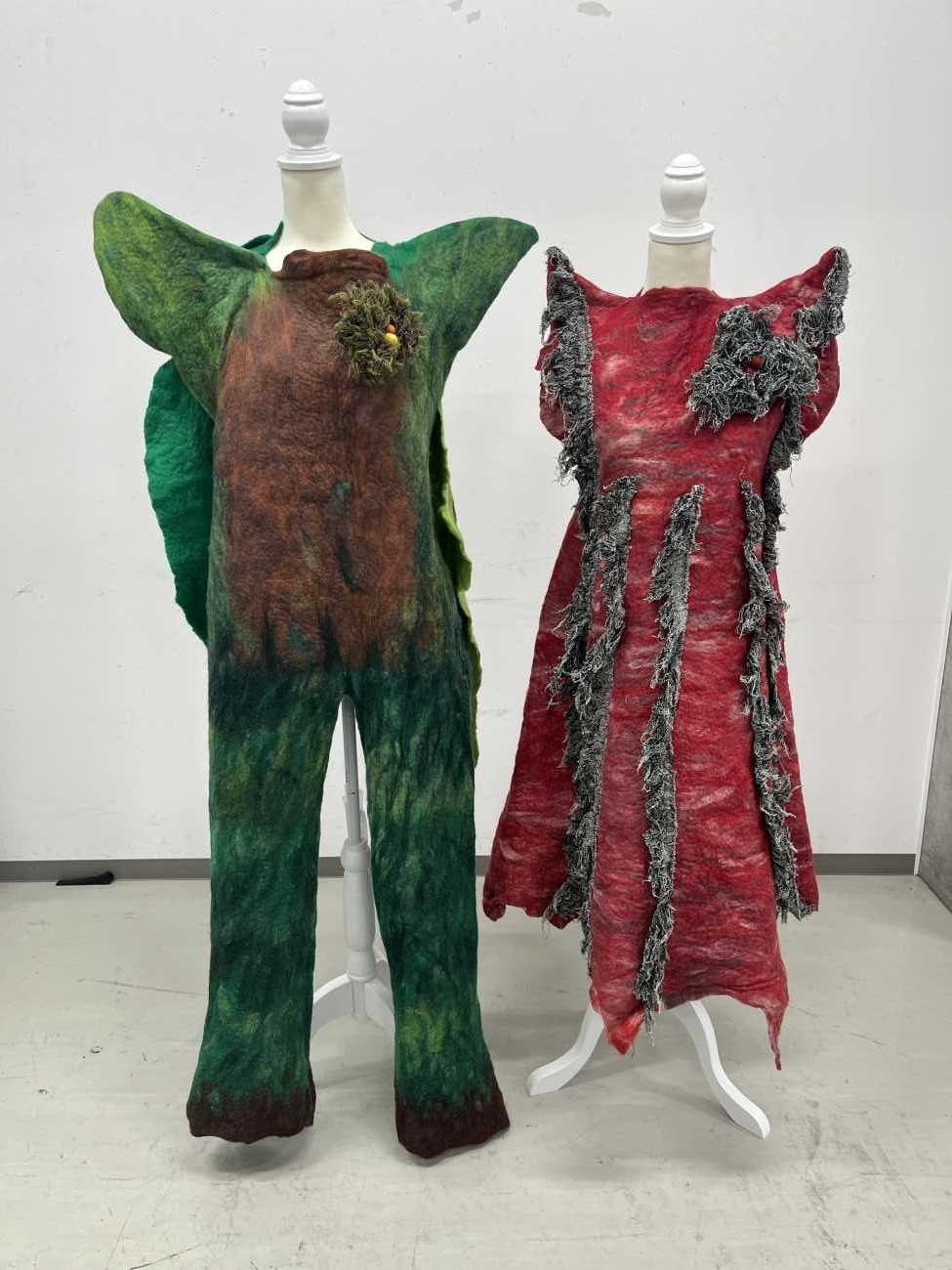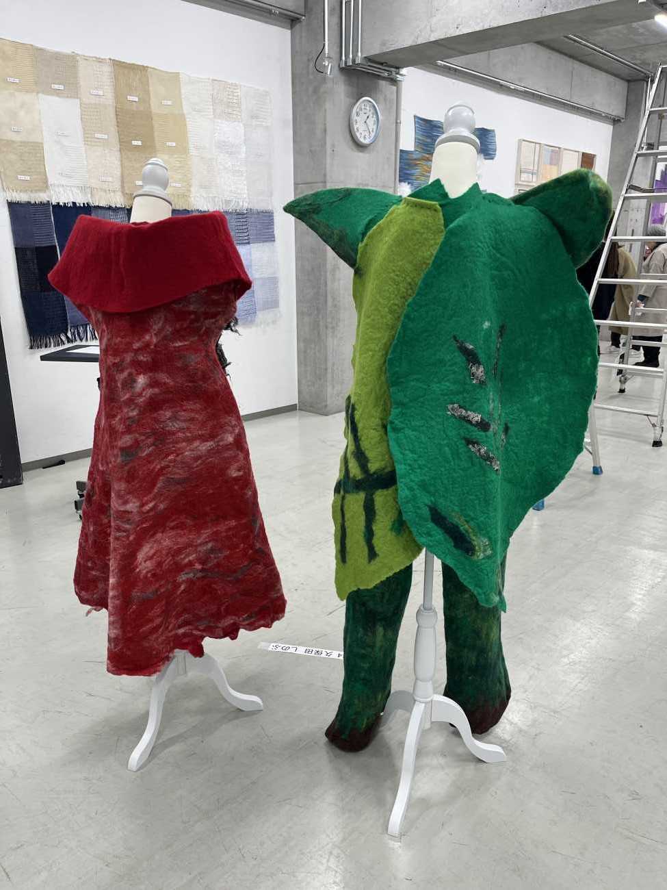 芝生の上でてんとう虫とバッタが結婚式を挙げているイメージをフェルティングという技法を使い洋服を制作しました。