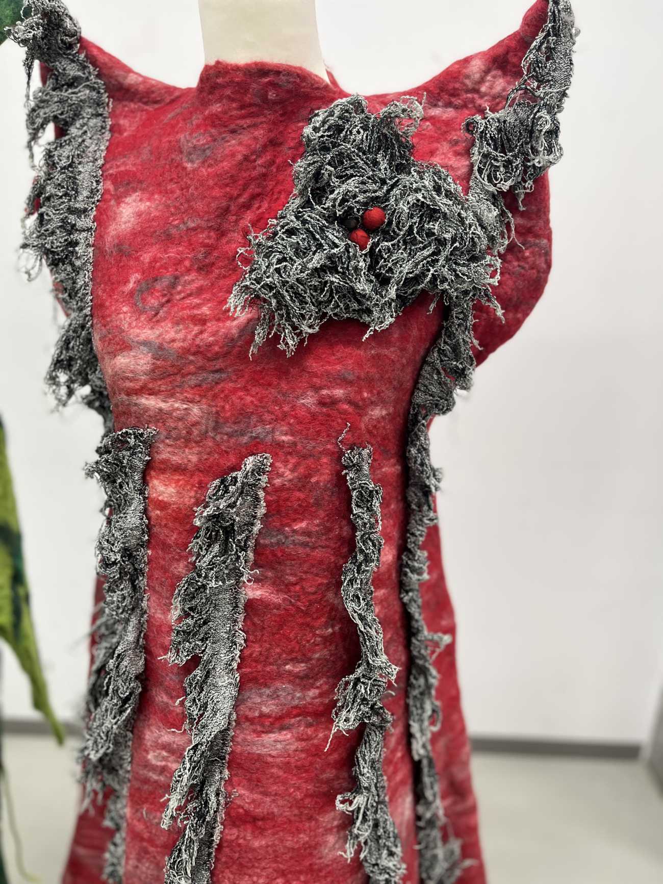 洋服の生地を製造している工場から出る生地の耳部分を作品の中に入れました。生地ミミと羊毛を組み合わせてできる新境地を想像して制作しました。