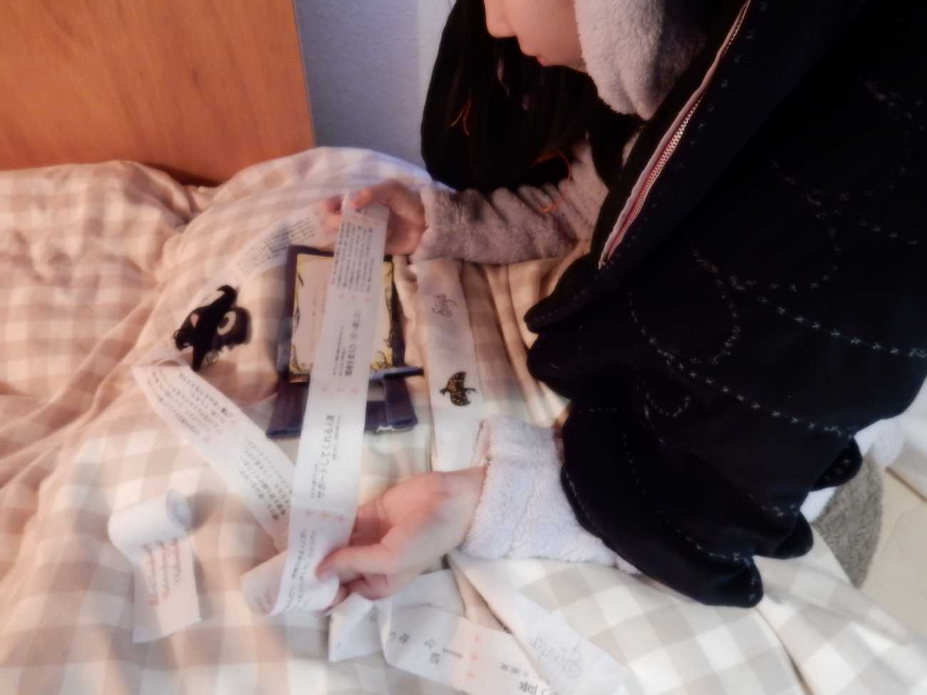 ぬいぐるみ、1行日記、日記帳台紙、ハンカチのような説明書、キーホルダー、シール、言葉の包帯、ポストカード、お薬ポーチ、パネル
