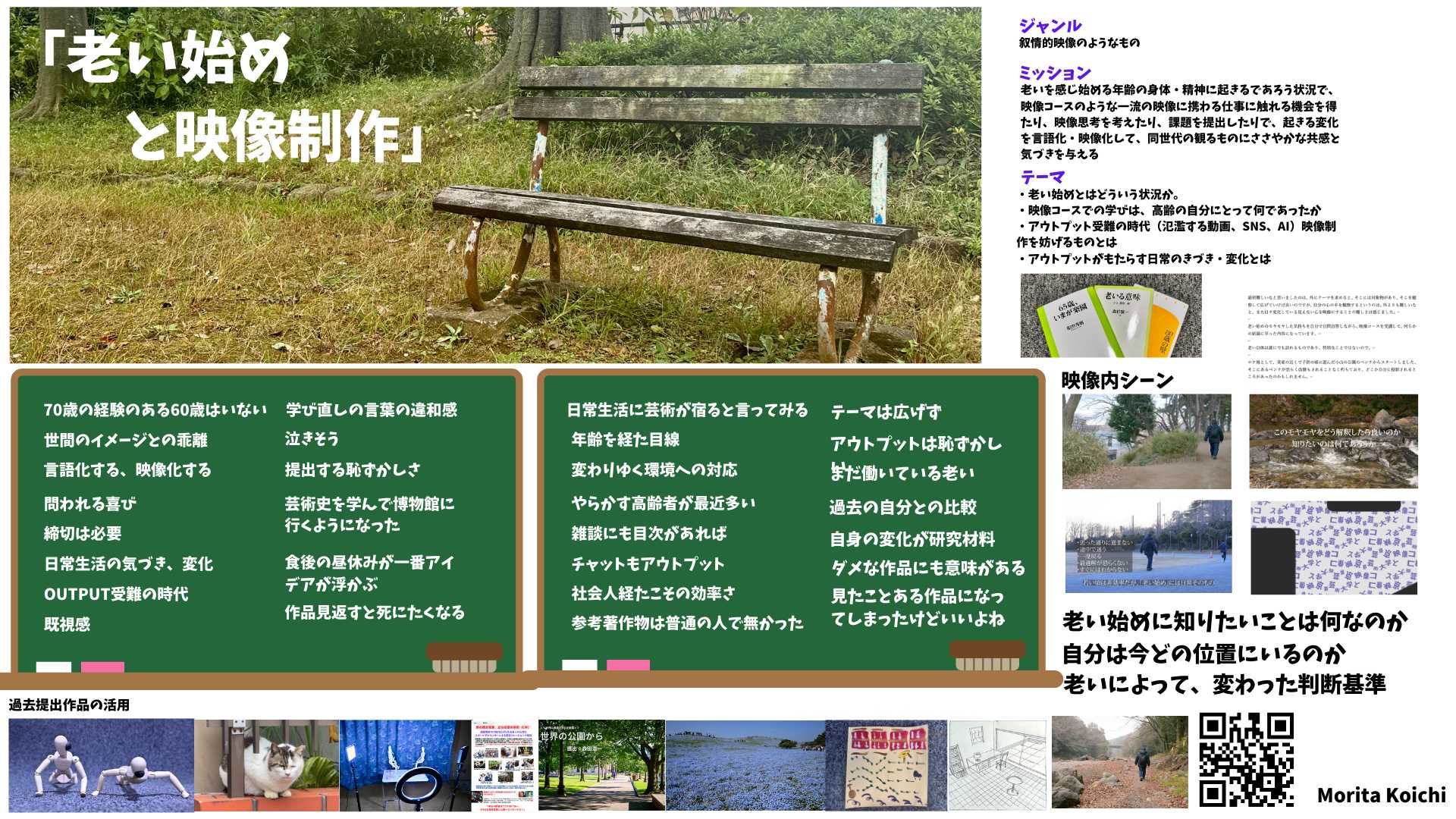映像を仕事としておらず、趣味とも言えませんが、企画を考えたり、文章を書いたり、撮影したり、アニメーションをいじったり、芸術に触れたりすることが、在学を通して好きになりました。この機会に得た映像思考を取り入れて、これから何らかの作品を作り続けていければと思っています。