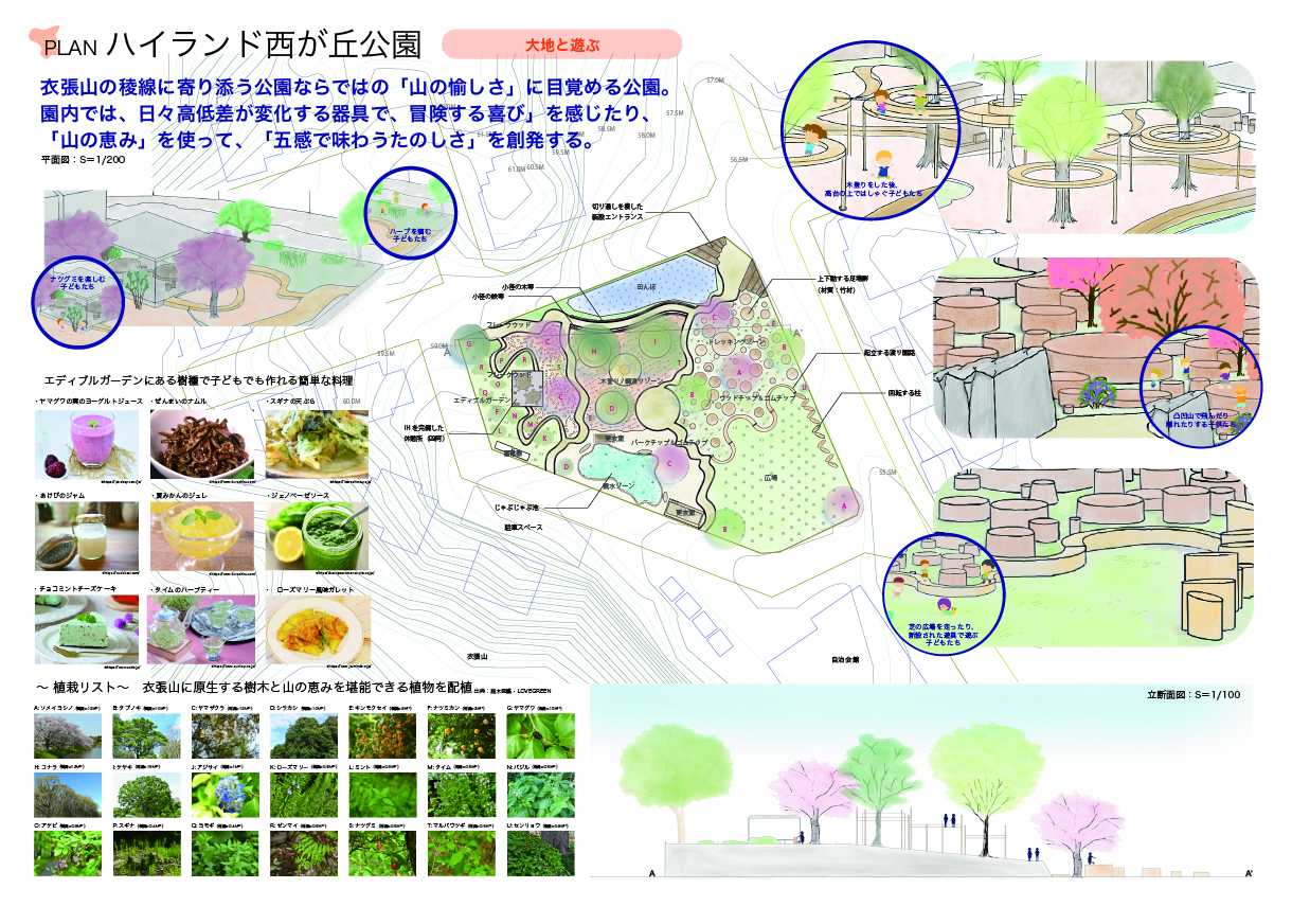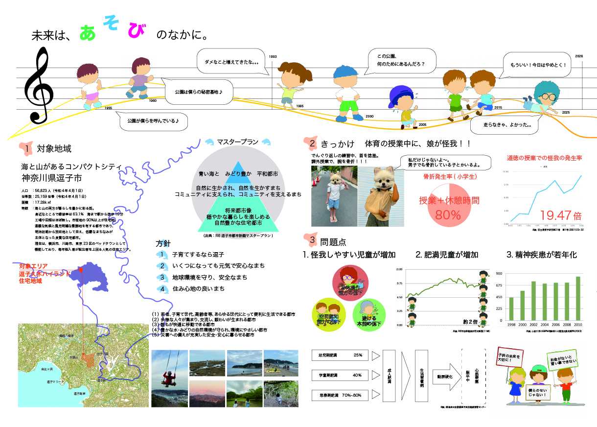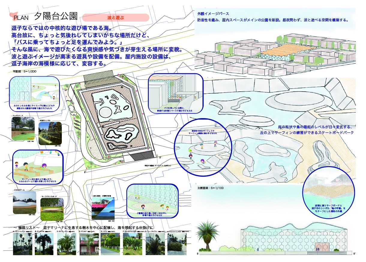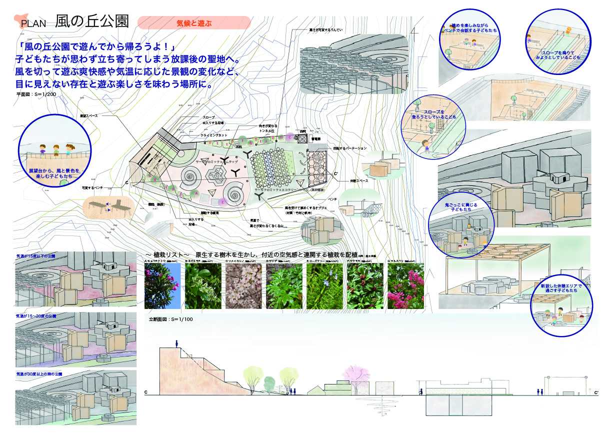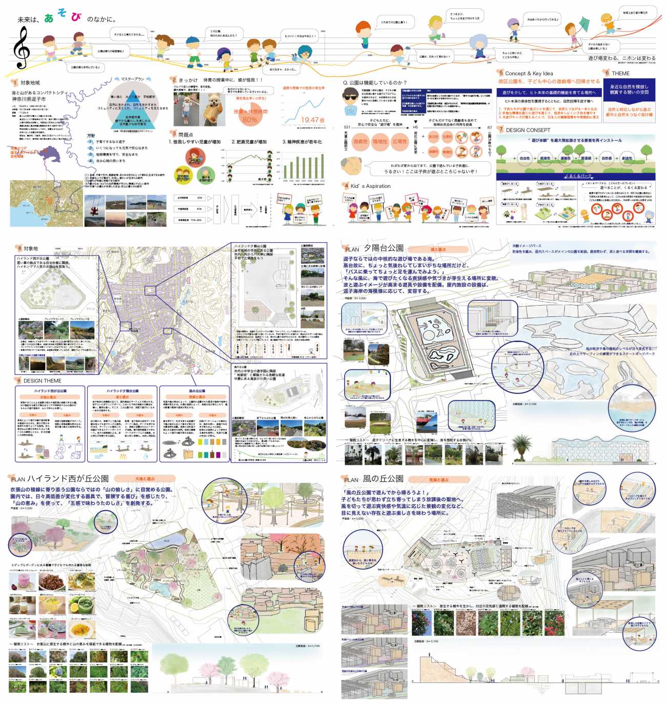 本提案は、神奈川県逗子市・久木ハイランドの三つの街区公園を対象に、地域の風土とテクノロジーを掛け合わせながら公園機能を再編し、子供たちの身体性を日常のなかで回復させる〈くるくるパーク〉構想である。縦糸に地域性、横糸に汎用性を据え、西が丘公園では大地、風の丘公園では気候、夕陽台公園では波という自然要素を遊びへ翻訳し、公園そのものが変化する仕組みを導入することで遊びの可能性を拡張する。