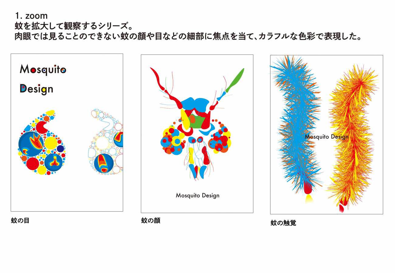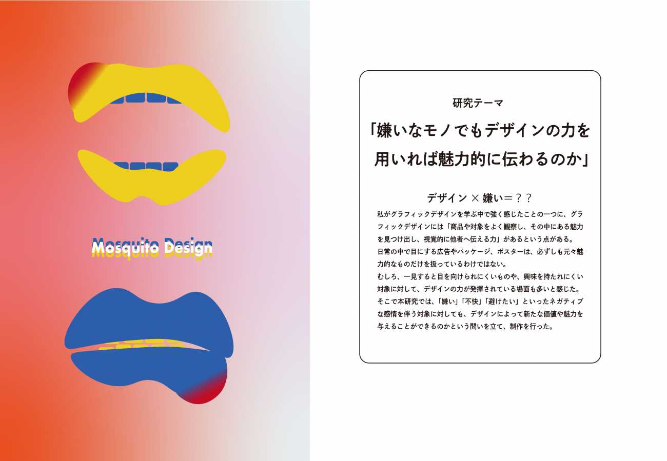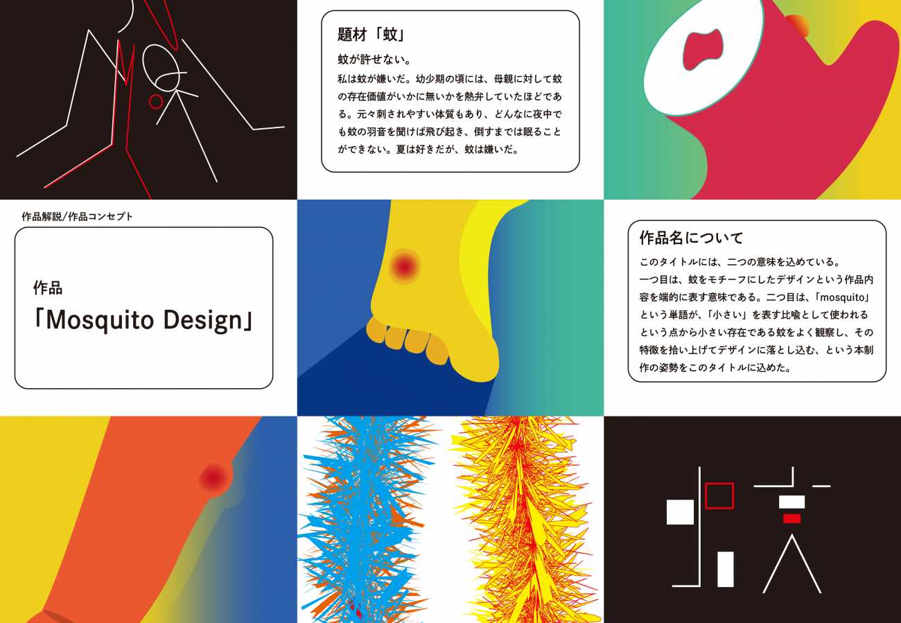 本制作では、そんな強い嫌悪の対象である「蚊」をあえて題材とし、グラフィックデザインの視点から観察・再構築することで、嫌いなモノにも新たな魅力や価値を見出せるのかを探った。