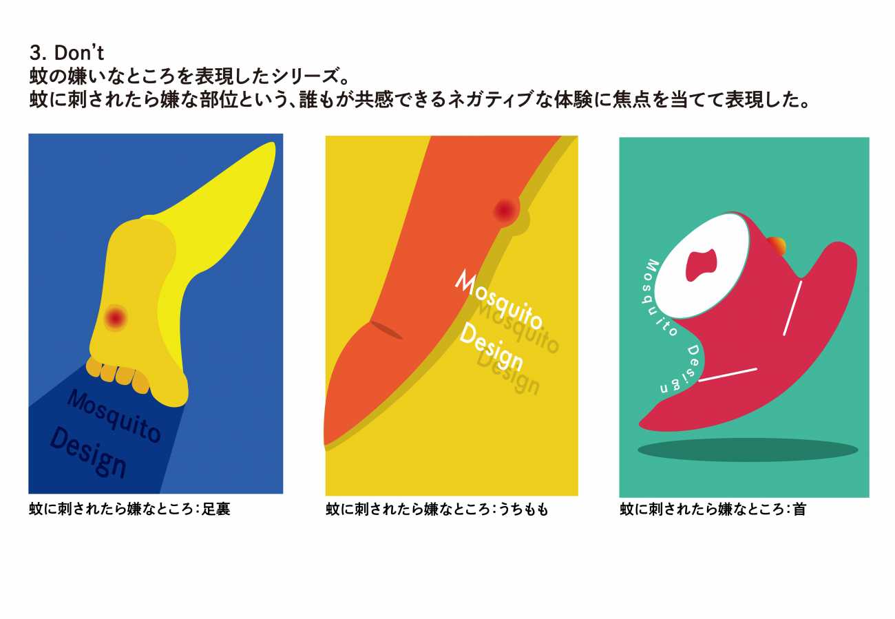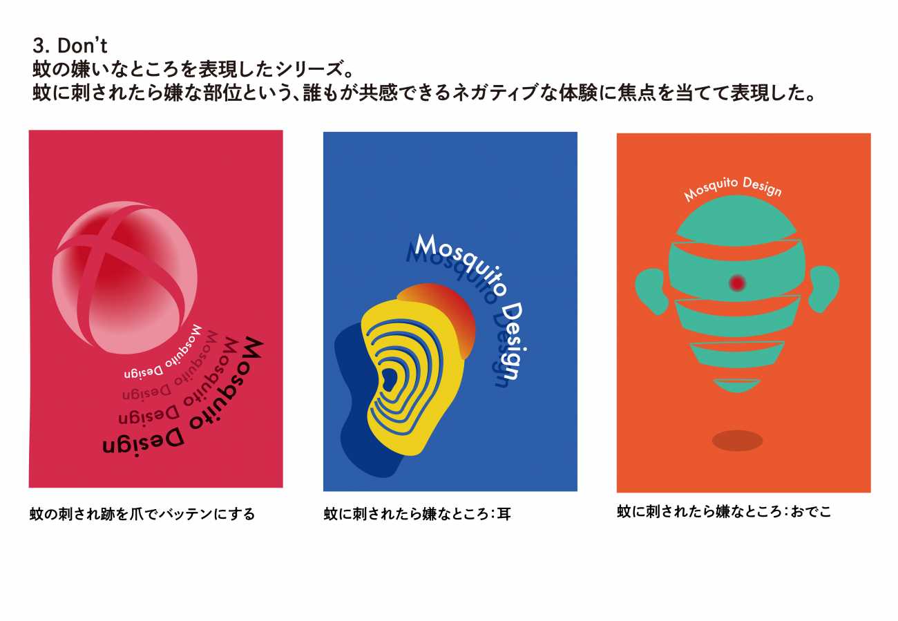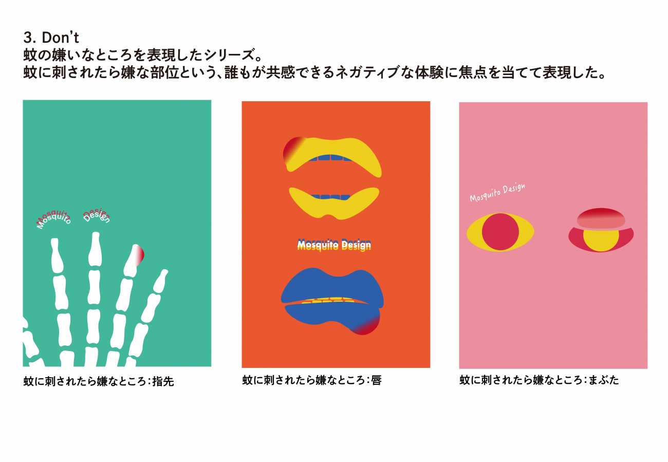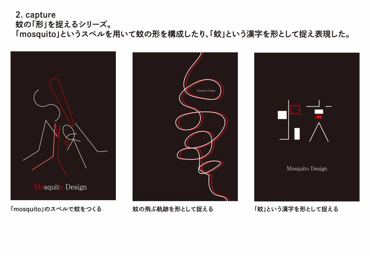 本制作では、そんな強い嫌悪の対象である「蚊」をあえて題材とし、グラフィックデザインの視点から観察・再構築することで、嫌いなモノにも新たな魅力や価値を見出せるのかを探った。