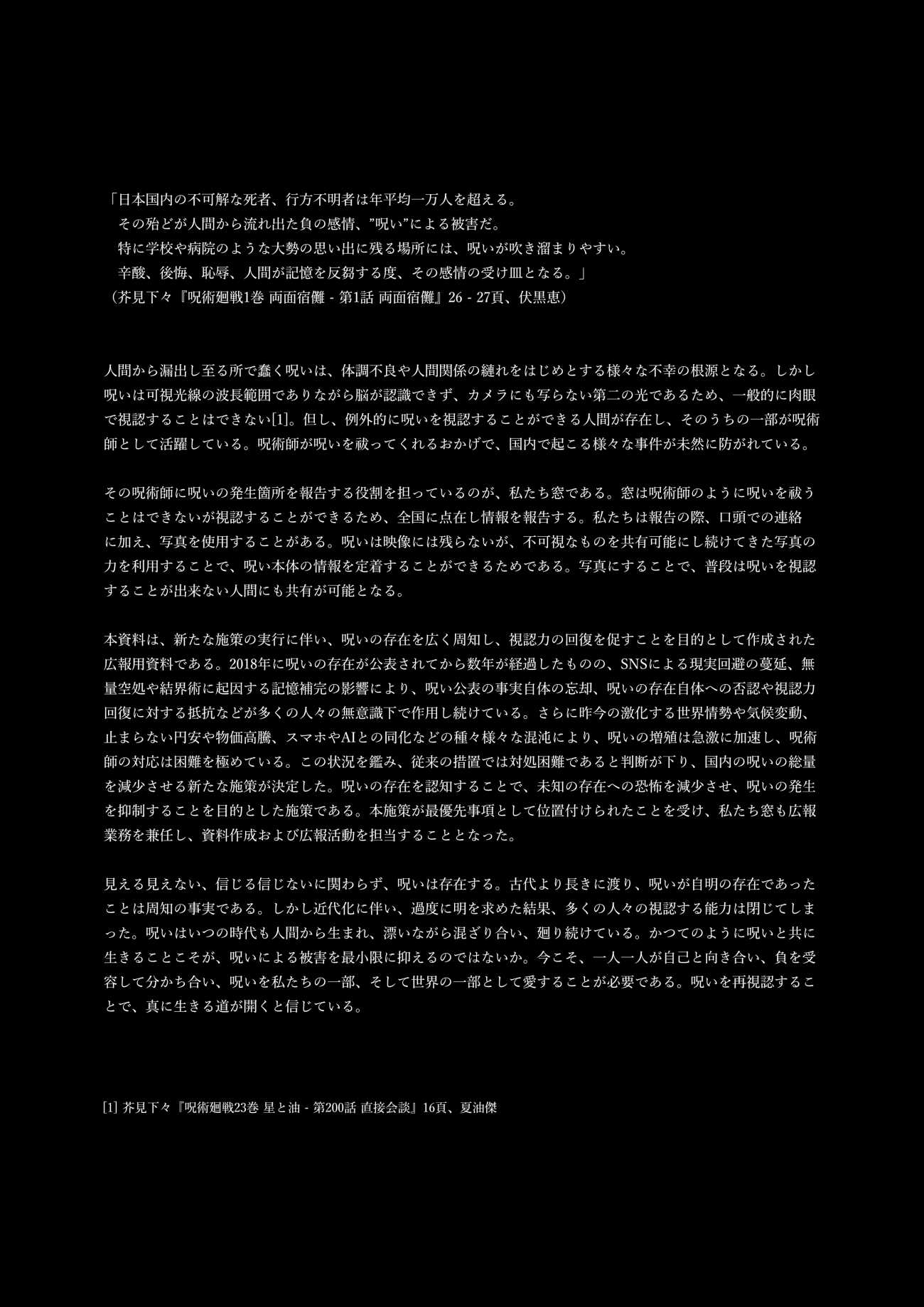 今回、「窓」である私は広報業務を担当した。広報用資料(本作品)を作成および紹介し、呪いについて知っていただくことを目的とした広報活動である。