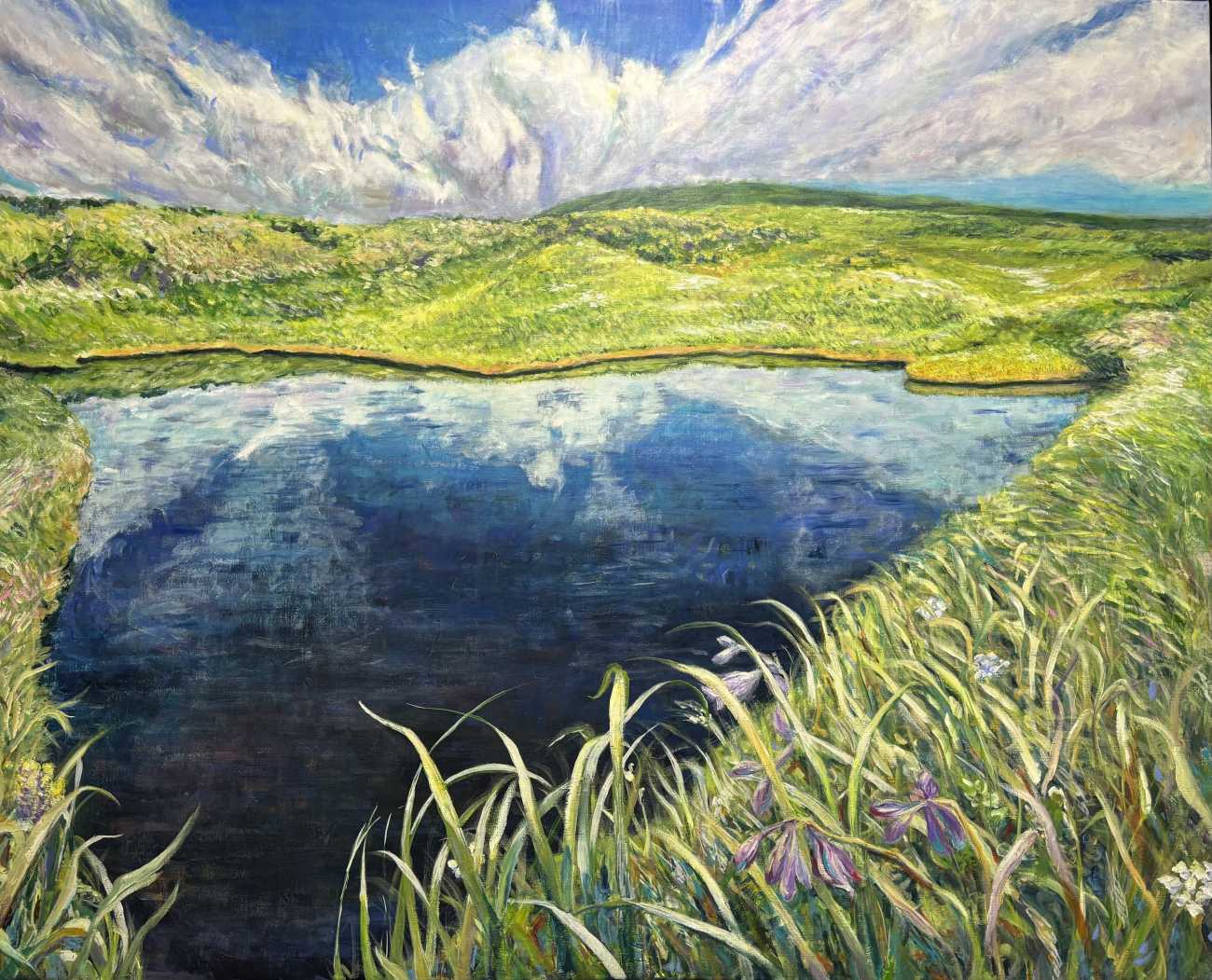 自然の中に身をおくと、きらきらと光を放つ水面や、生命力豊かな草木のありように、ただただ美しいと感じるもっとも純粋で幸福な瞬間に出会うことがある。心に湧きあがるセンセーションは、私に、なんとかこれを捉えて形や色でキャンバスに表現するのだという思いを起こさせる。自然美に与えてもらった感激を核として、私という無二の媒体を通して、快さと感動が立ち上がるような絵を創るのだ。