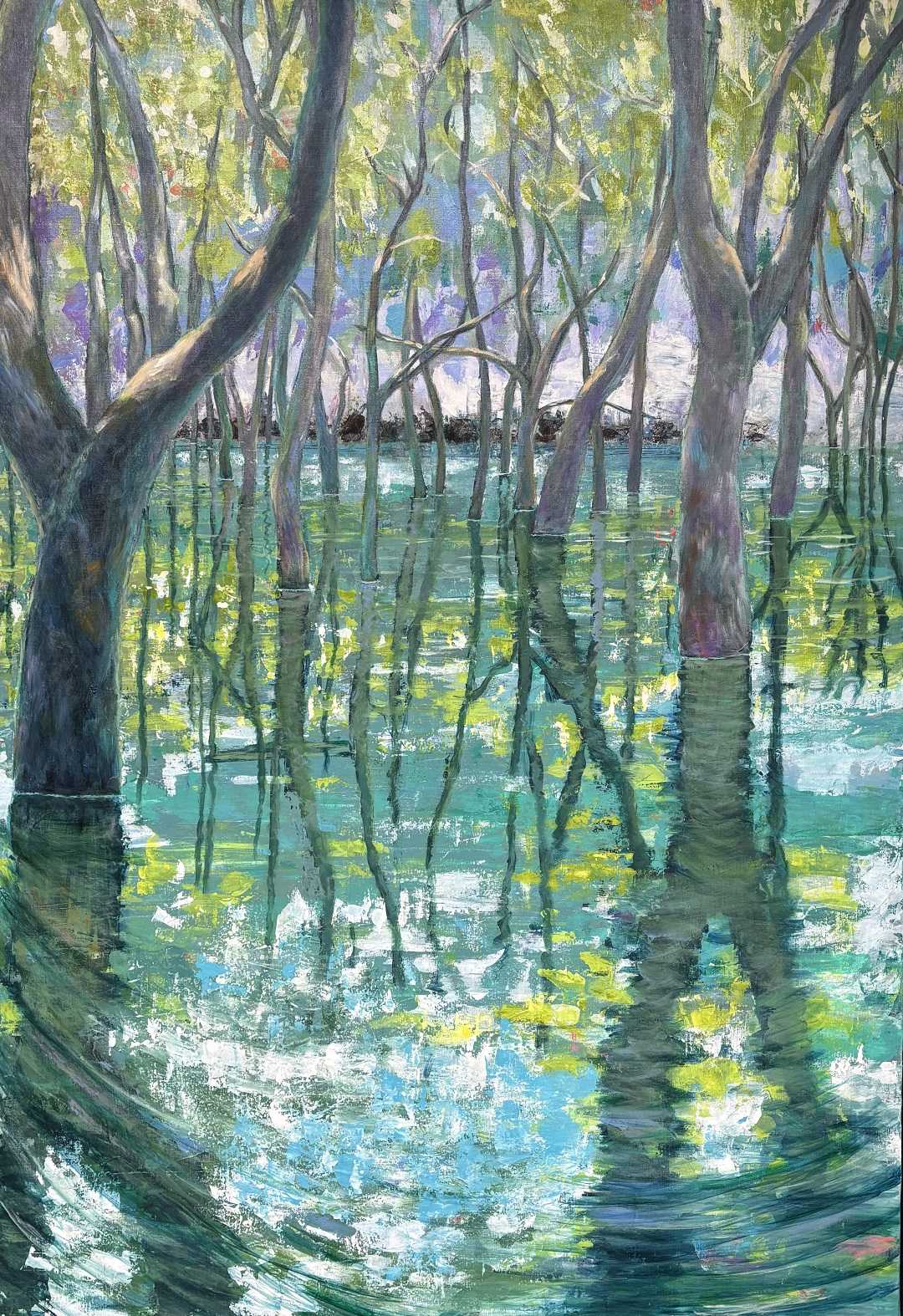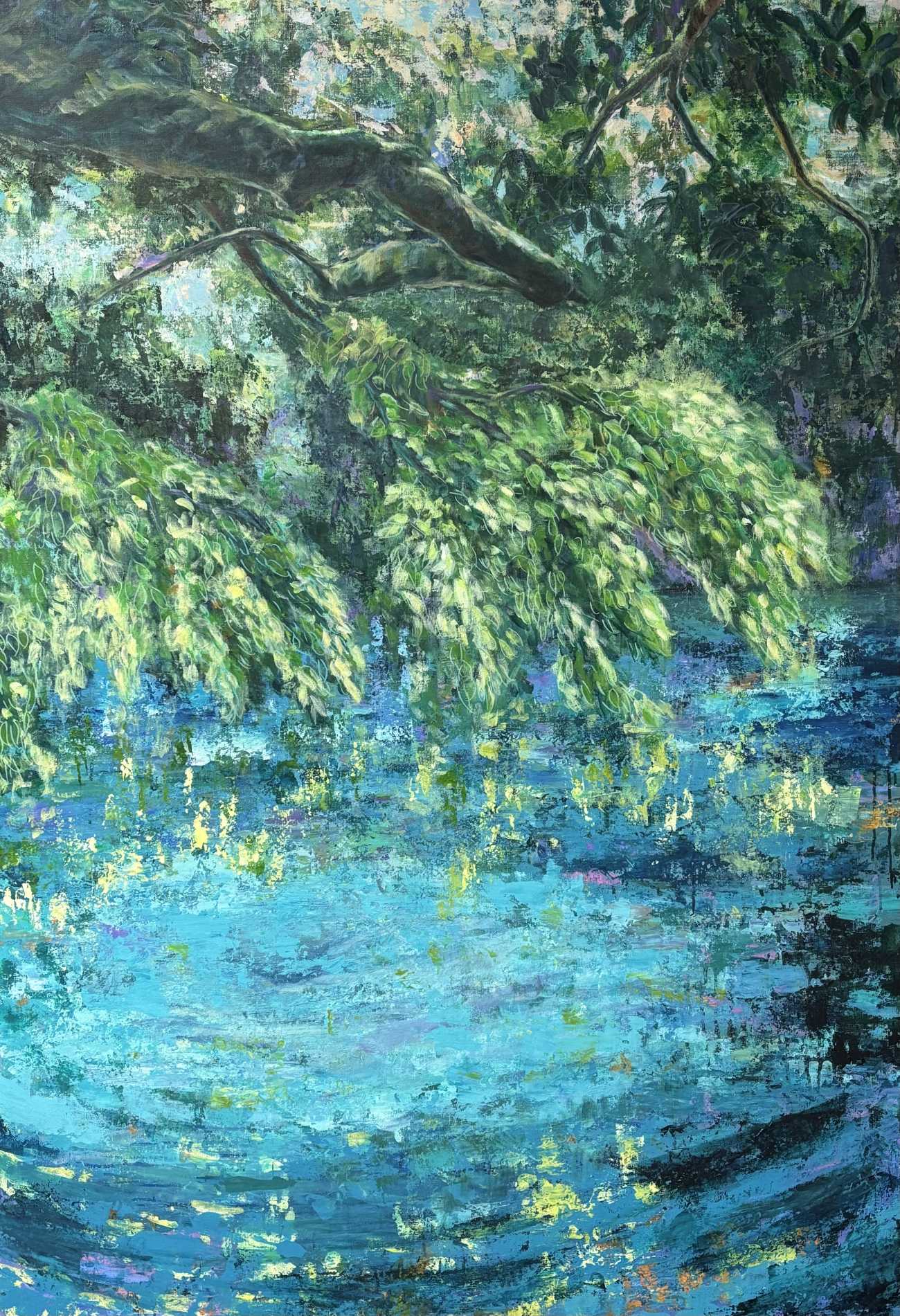 まず水辺を描くことについてだが、作者は水面のない風景よりも魅力を感じることから、造形やおもしろみに関わる要素と捉え、水面の反射・反映をいくつかのタイプに分けた。本作品では、それらのなかから、反映によるシンメトリーのおもしろさ、像が上下反転する違和感、反映して水に映った像の要素(それだけ見ると元の像とはわからないもの)の色彩的な響き合い、反射を描くことによる多くの光の画面への取り込みを扱っている。樹木の幹や枝の反映、光の反射は、それぞれの水面の状態によって描き分け、縦横斜めの複数の方向性でリズム感と色彩のインパクトを持たせ、水の揺らぎを一部大胆なタッチで表すことで、絵全体に躍動感を与えた。