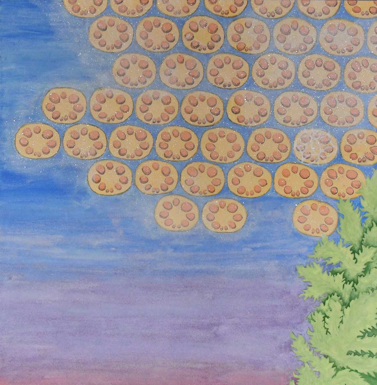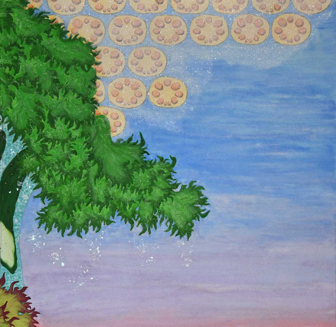 色鮮やかな色彩と、水晶末を混色し乗せることで観る角度で光が反射しキラキラと輝くように。そして、いたるところにクスッと笑えるような仕掛けがある。