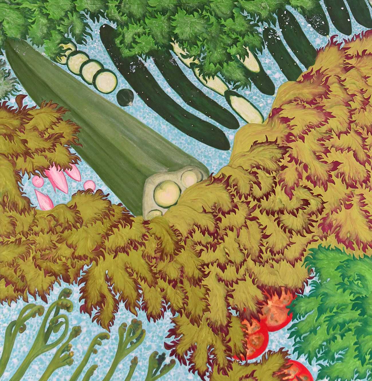 波筋はキュウリで表し、波飛沫には光の加減によってキラキラと色が変わる夜光貝を細かく砕いて散らし、波の合間にはひょっこりと現れるトマトやミョウガにワラビを。