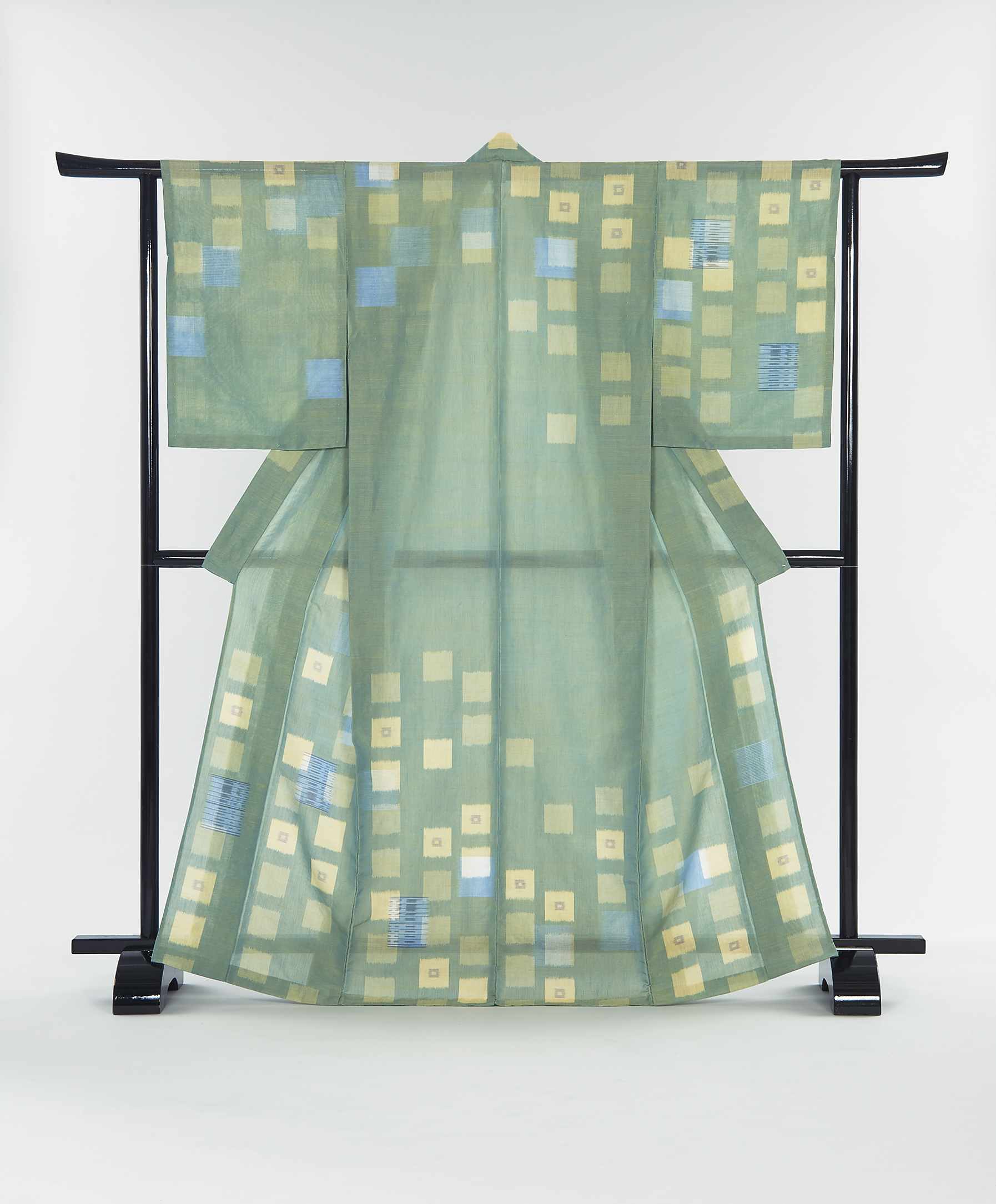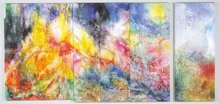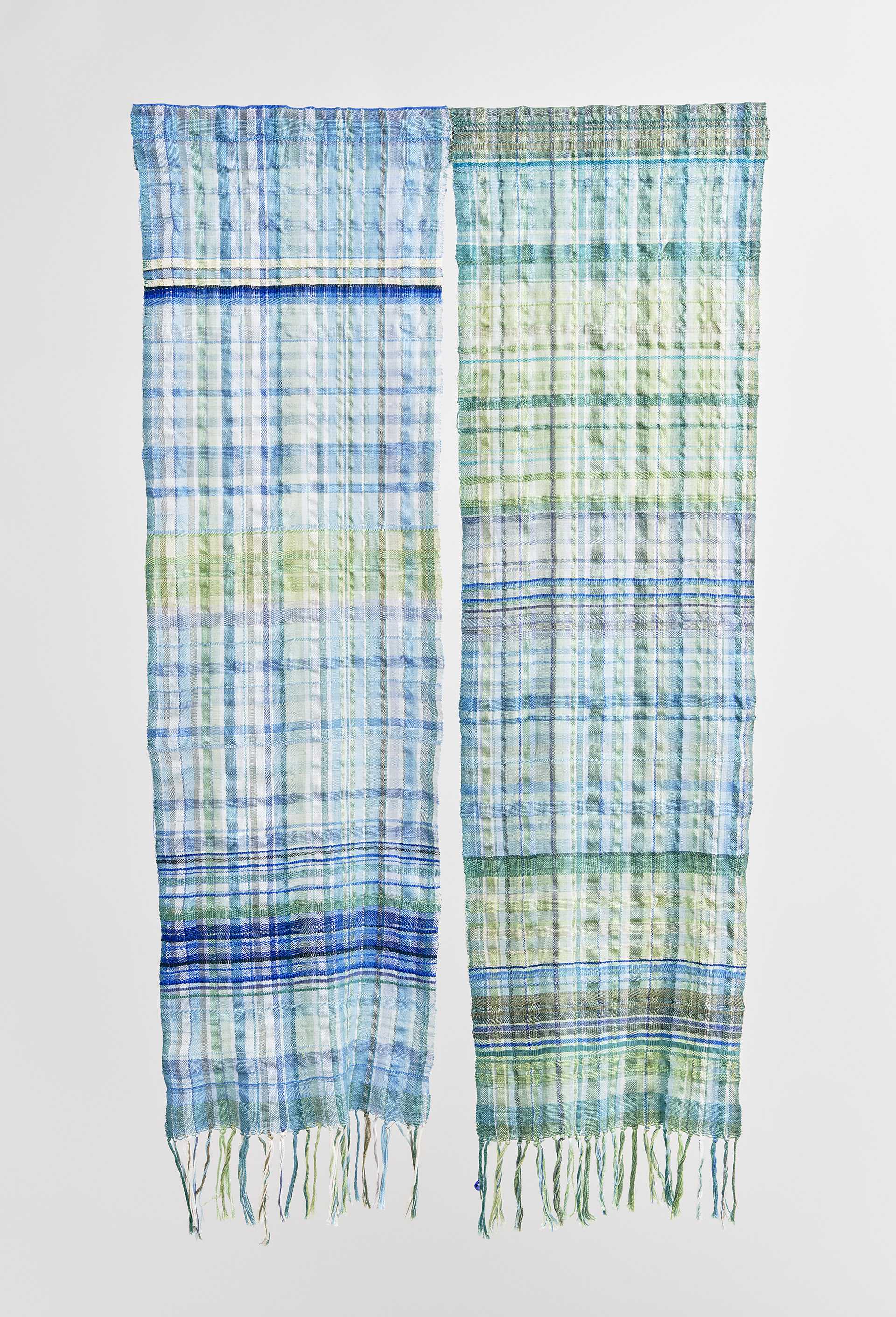 上段左から縦90cm×横90cm、縦110cm×横90cm、下段左から縦90cm×横90cm、縦90cm×横110cm 4点のパネル 蝋染 木綿、反応染料