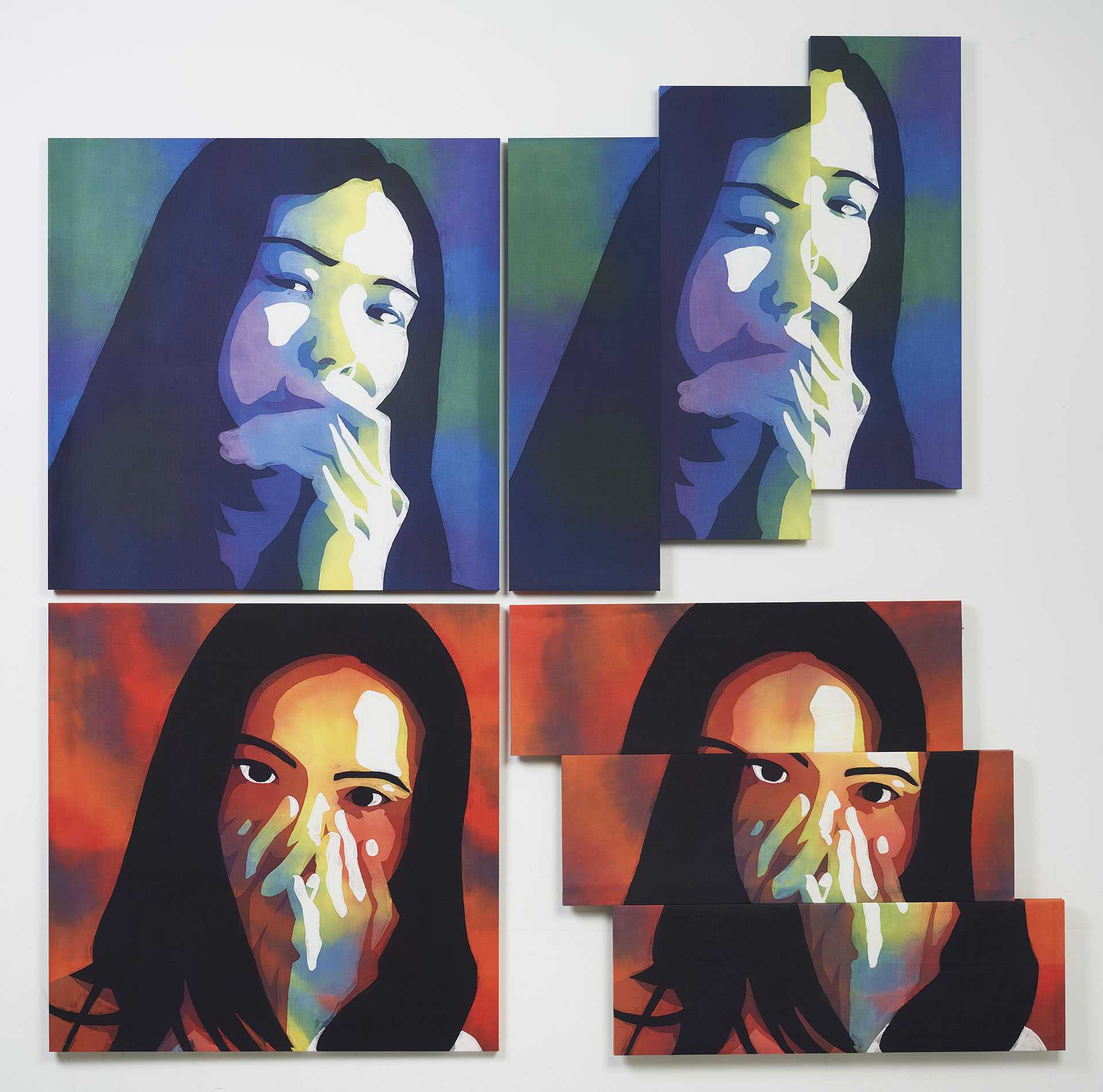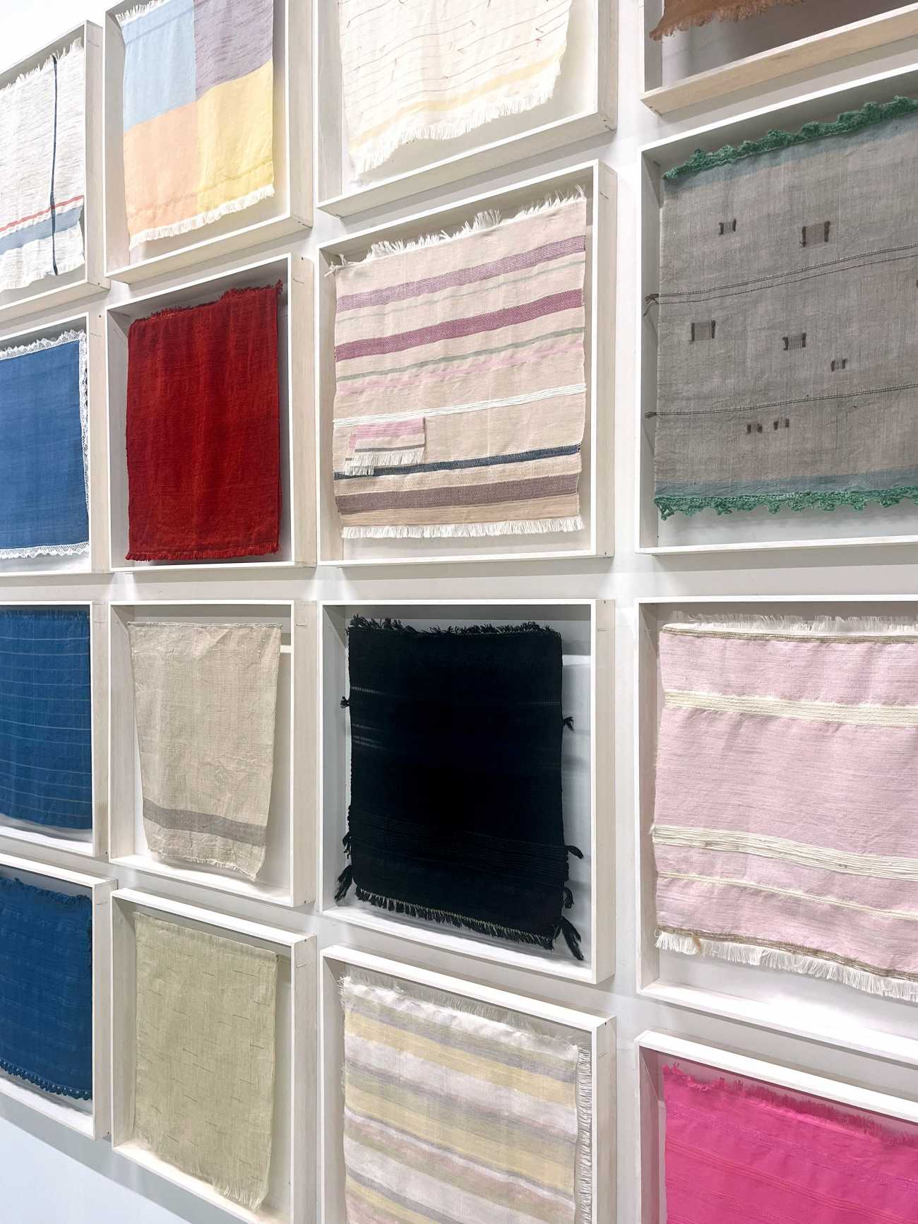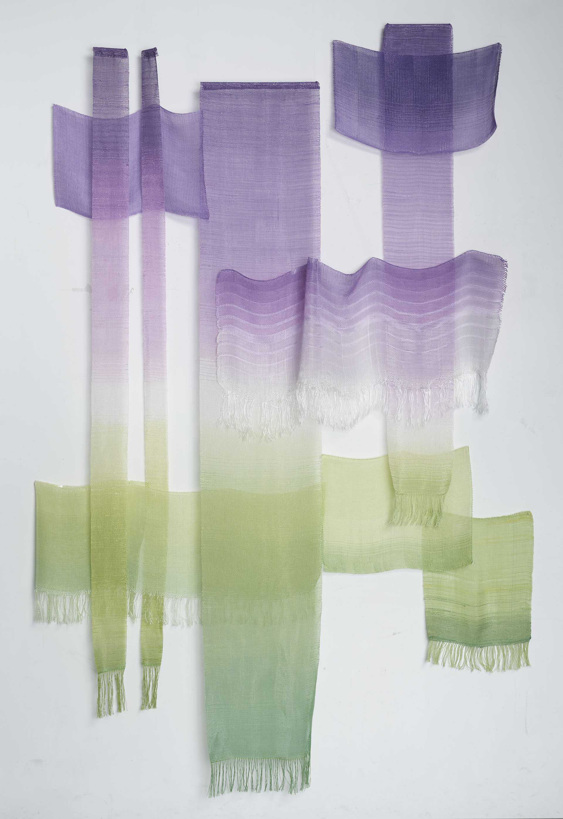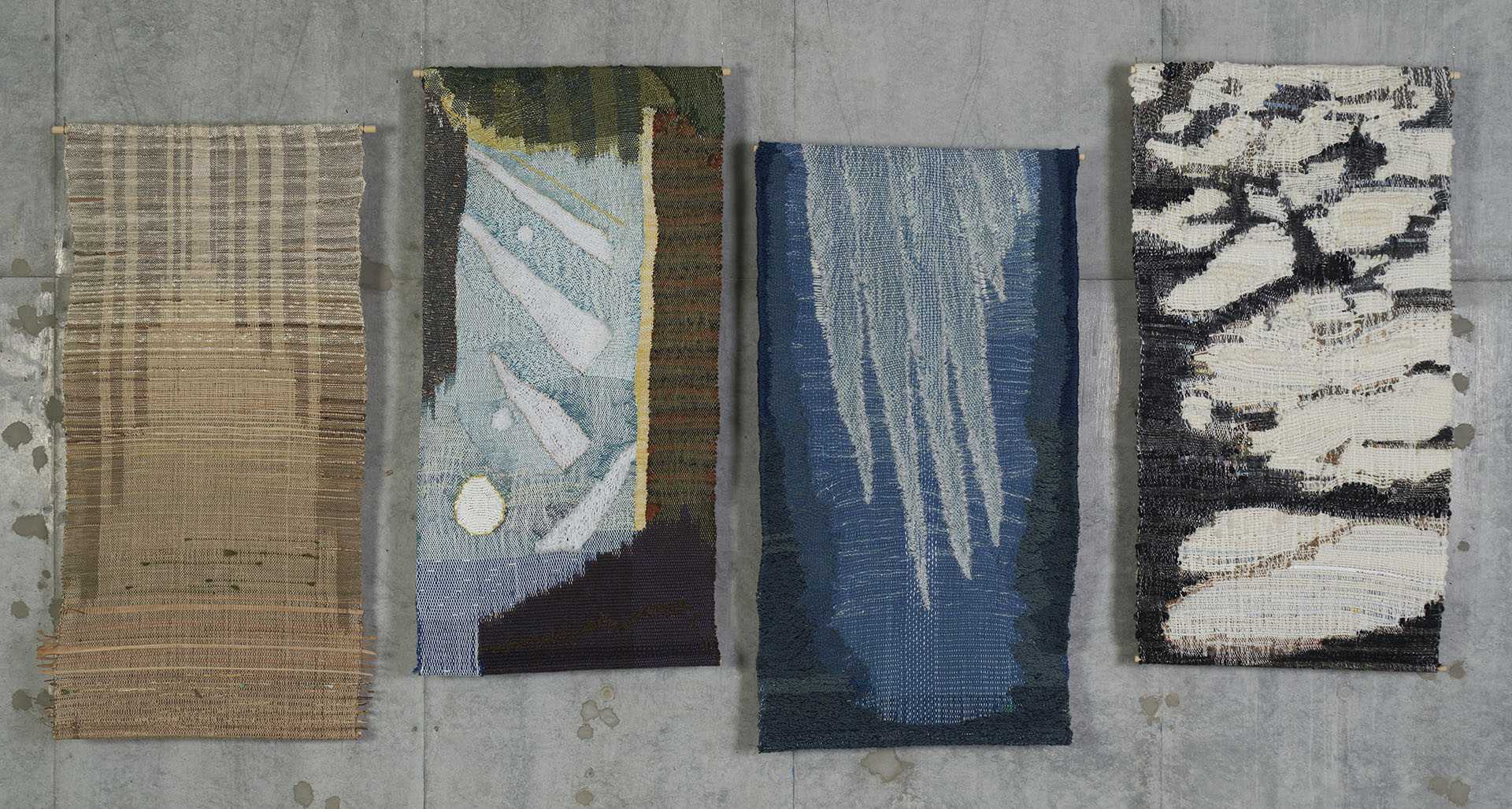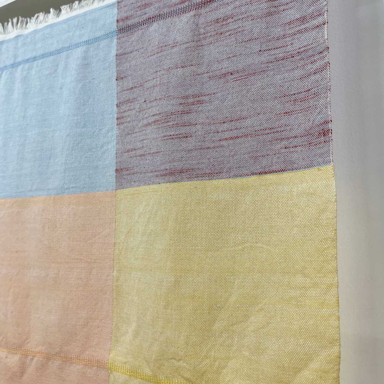 家族や友人など身近な人に向けて、その人のことを想いながら素材や色、織り方を選び、1枚の布として表現しました。それらを16枚制作し、一つの作品としています。