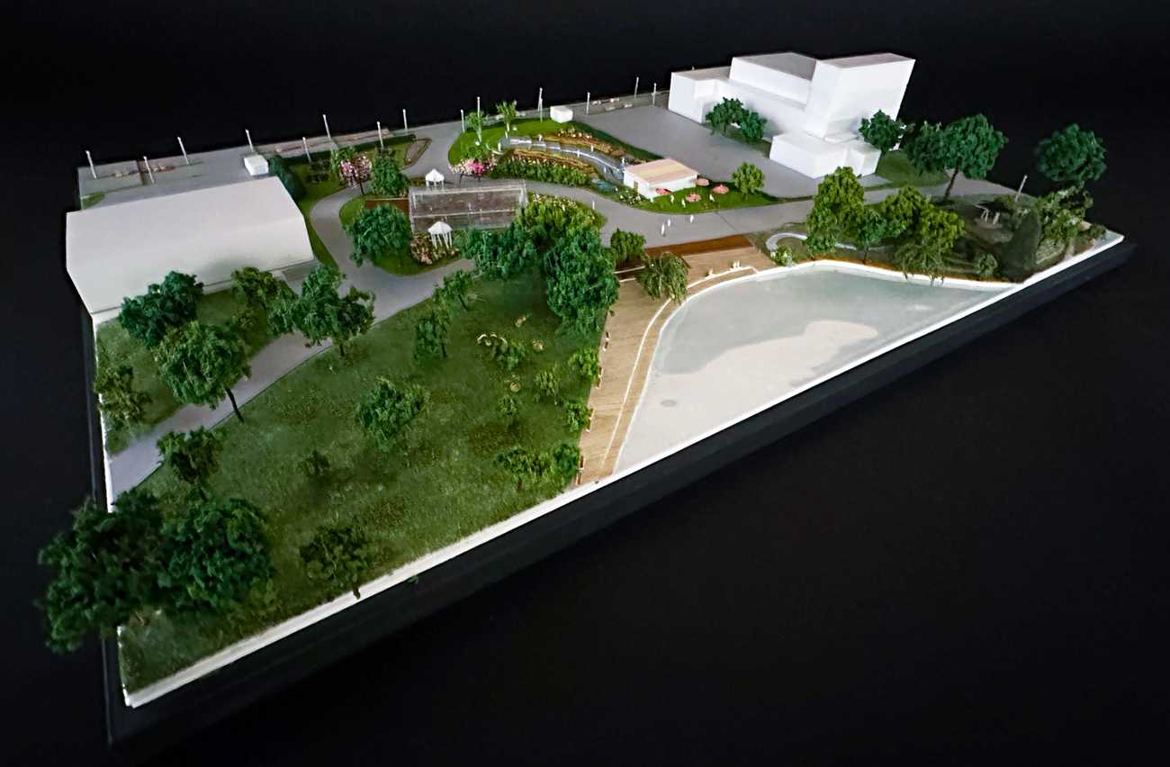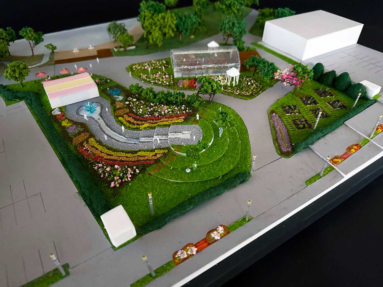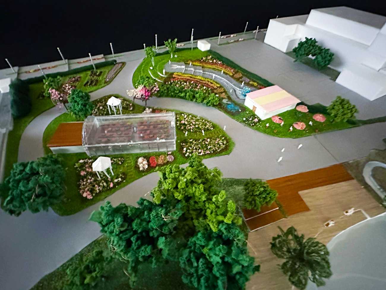 模型写真:本庭園のカフェと噴水、水路と花壇と小さな丘、温室と学習・イベントスペース、畑等の位置関係