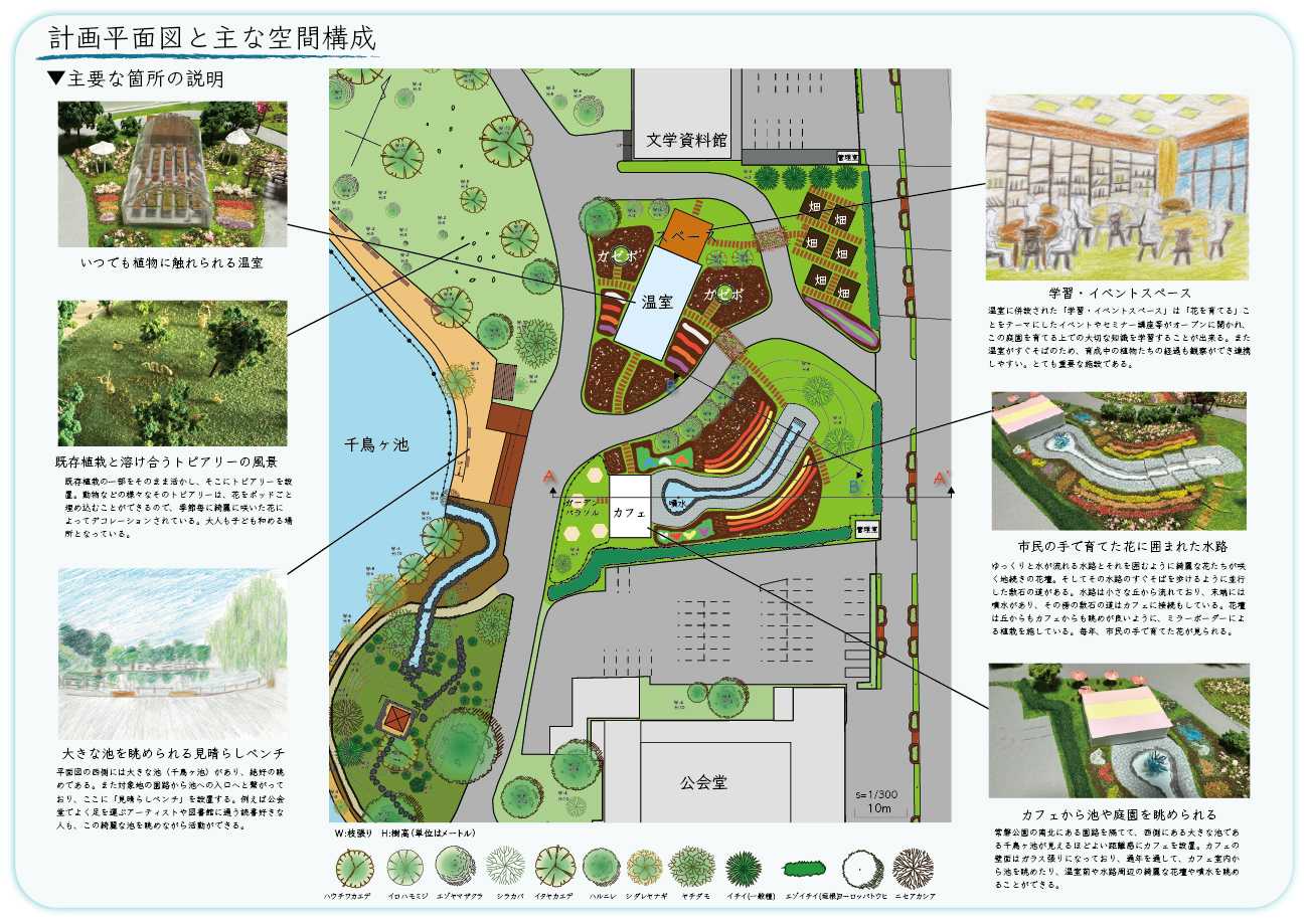 こうした現状を踏まえ、私はこの場所で花を中心に、植物と人々が触れ合いながら時を重ねていく庭園を提案する。それは人生でもっとも苦しかった時期に花と出会い、癒され、やがて植物を育てることが喜びへと変わっていった私自身の経験が、本提案の原点である。