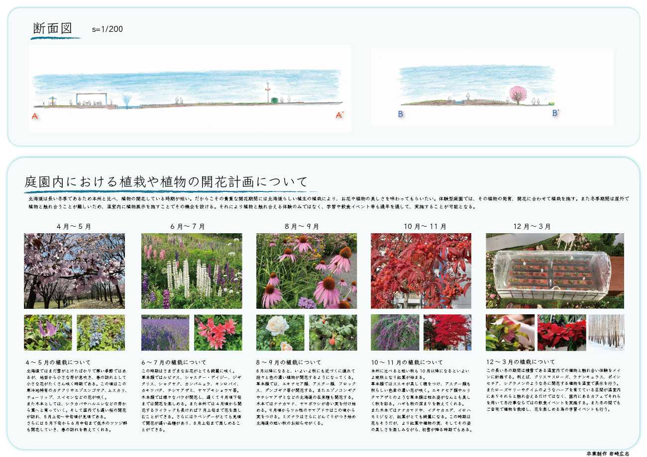 プレゼンパネル6:断面図および植栽と年間の植物開花計画