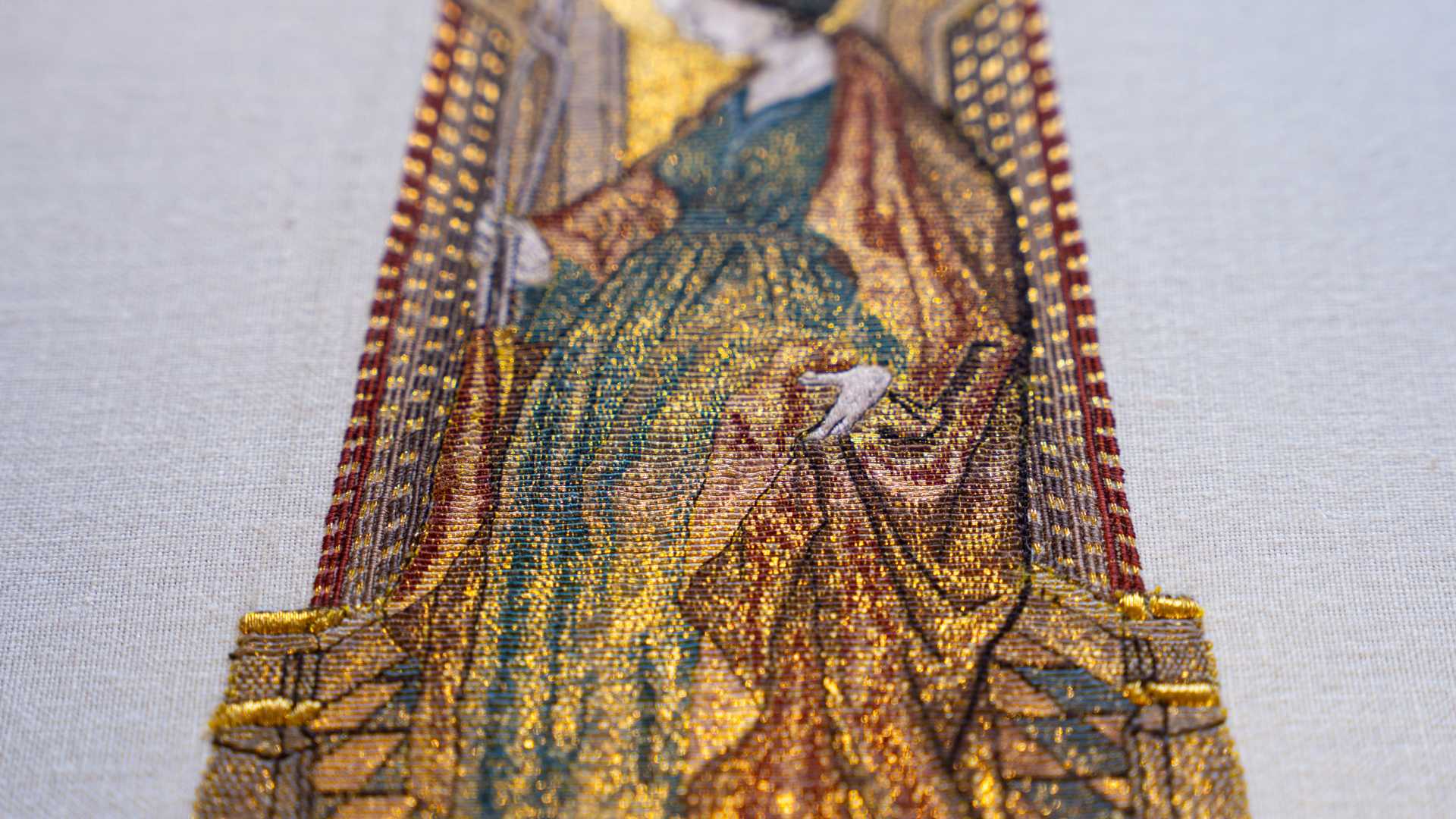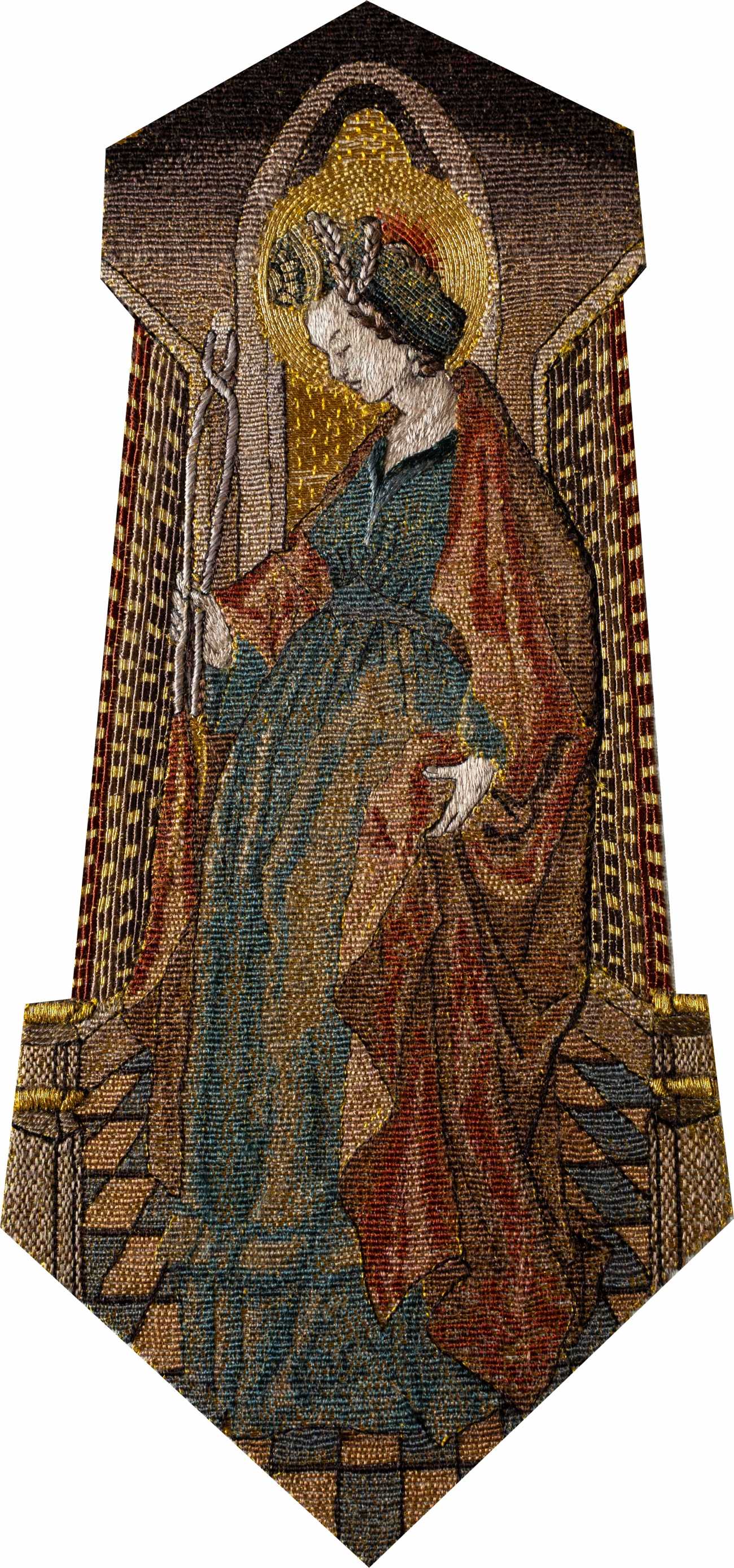 2. Embroidery reproduction based on technical research, Referencing the figure of Saint Apollonia from the Cope of the Virgin Mary of the Order of the Gloden Fleece, Original object held at the Imperial Treasury, Vienna / 技法研究に基づく複製刺繍〈うつし〉、⾦⽺⽑騎⼠団《聖⺟マリアのコープ》の図像「聖アポロニア」を参照、原作所蔵:ウィーン王宮宝物館、複製制作;杉浦今日子、2025、刺繍、本金糸・釜糸・リネン、28.6 x 12.0(cm)、©Takeshi Sugiura