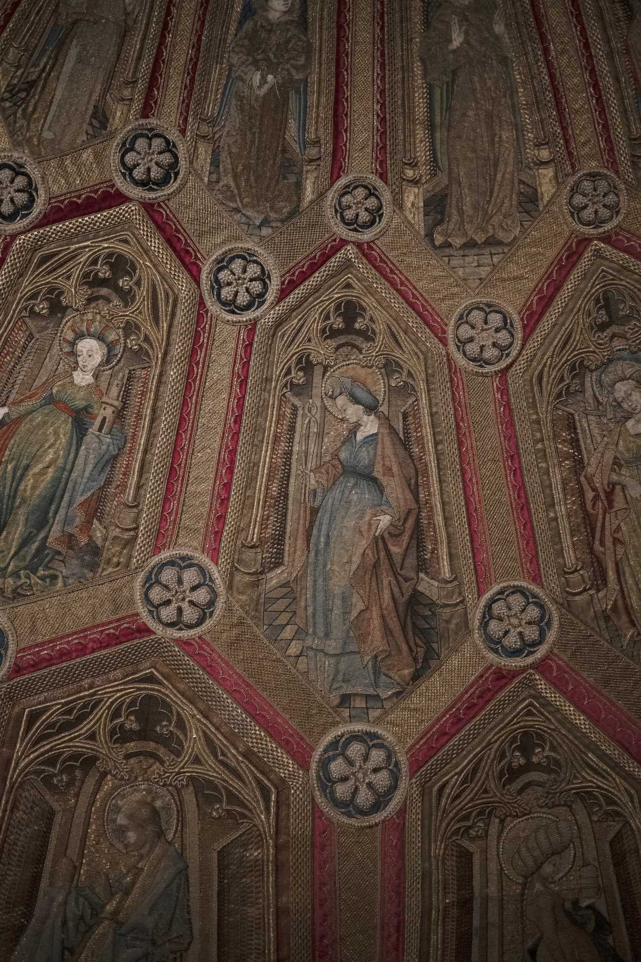4. The figure of Saint Apollonia from the Pluvial[Cope of the Virgin Mary](聖母マリアのコープ内図像「聖アポロニア」)、刺繍、 ブルゴーニュ、制作時期1425-1440 、The Imperial Treasury Vienna(ウィーン王宮宝物館)所蔵、展示作品、©Takeshi Sugiura