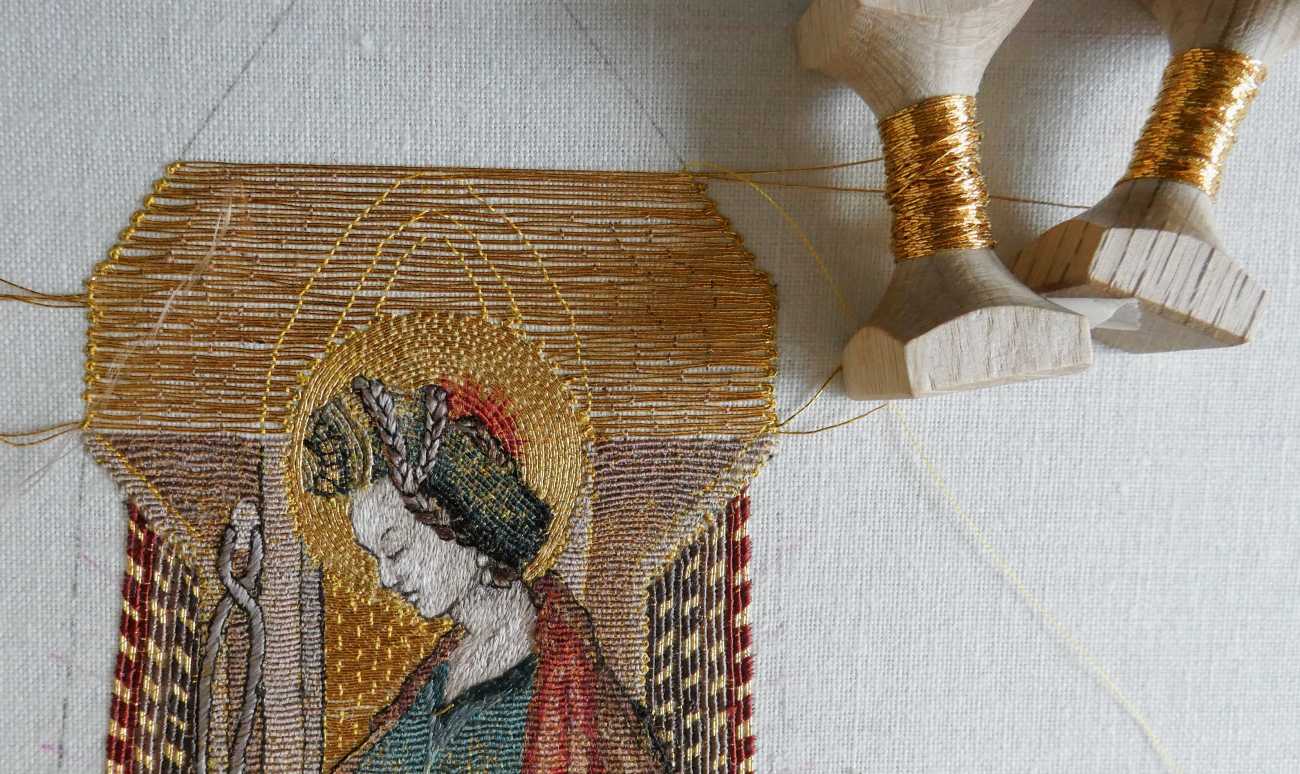 1.メイン画像 : 技法研究に基づく複製刺繍オール・ヌエ〈うつし〉部分、⾦⽺⽑騎⼠団《聖⺟マリアのコープ》の図像「聖アポロニア」を参照、原作所蔵:ウィーン王宮宝物館、複製制作;杉浦今日子、刺繍、本金糸・釜糸・リネン、28.6 x 12.0(cm)、2025、©Takeshi Sugiura