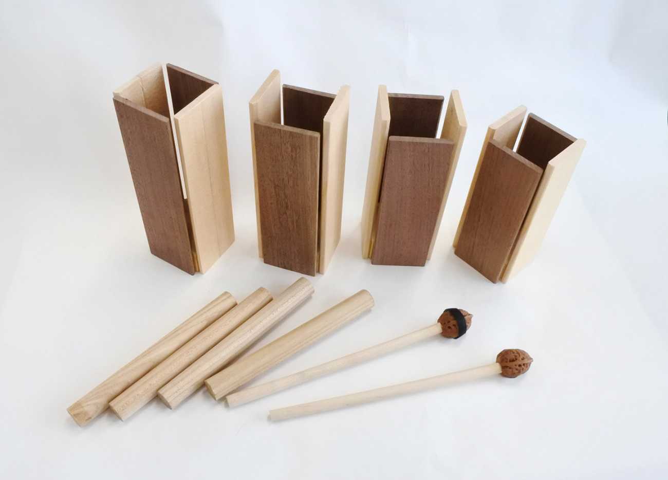 こうした背景を踏まえ、筆者は「音階を持ち、合奏が可能であり、かつ子ども自身が制作できる木製楽器」の開発を目指した。その具体化がウッド・トーンチャイムである。開発の出発点は箱型ウッドブロックであった。同じ寸法でも樹種によって音の高低が明確に異なることに着目し、長さや厚み、幅の調整によって音階を再現できる可能性を見出した。試作を重ねる中で、高音域の再現や隣接音の共鳴の問題、気候差による音程の不安定さなど、多くの課題が浮かび上がった。その都度、樹種の選択や寸法の再設計、マレットの改良などを行い、最終的には1オクターブの音階を鳴らすことのできる構造へと到達した。