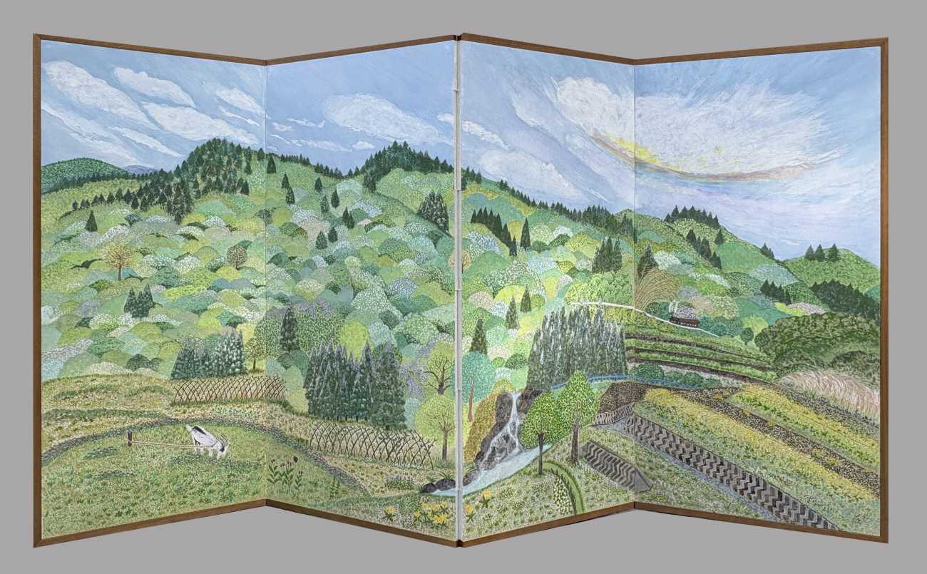 大好きなその里山の優しさや温かさをいつも感じられるように,絵に私の受け取っている空気感を表現し、訪れられない時にもそばに在ってほしいと思い屏風の形に仕立てました。